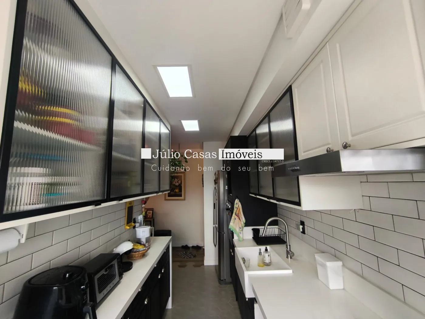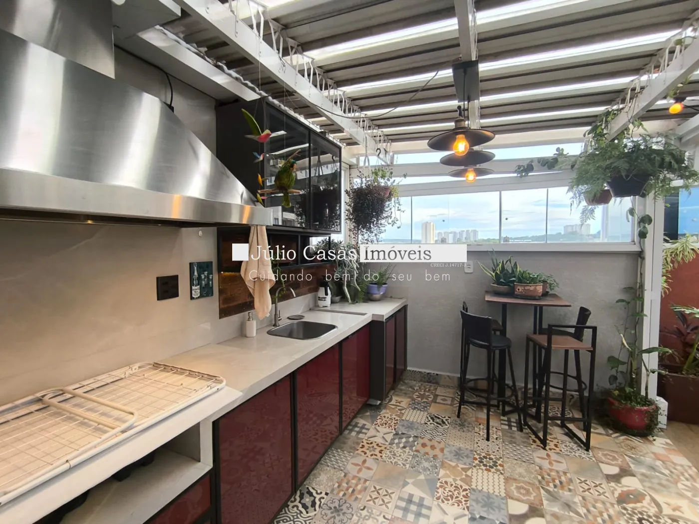 No piso superior uma área gourmet de 25 m², toda fechada com vidros e cobertura zetaflex retrátil, parte de vidro abre inteira). Armários, pia de apoio, coifa. Máquina de lavar embutida na bancada.