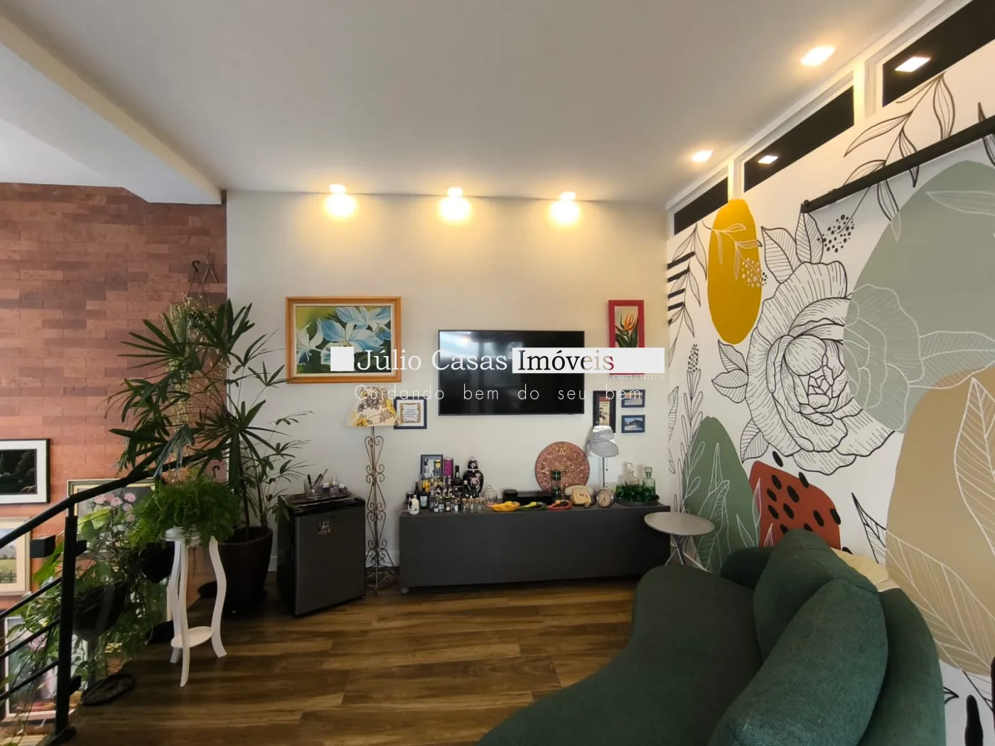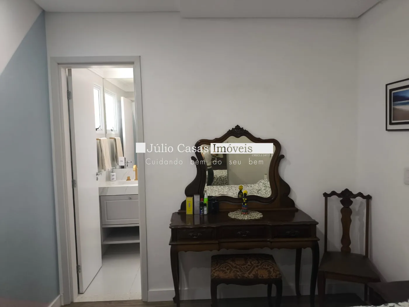 Subindo a imponente escada em Granito São Gabriel, você encontra uma sala íntima enriquecida por um painel exclusivo da artista plástica Bruna Choarelli ? uma verdadeira obra de arte integrada ao lar. A suíte principal é um refúgio particular, com closet espaçoso e climatização.