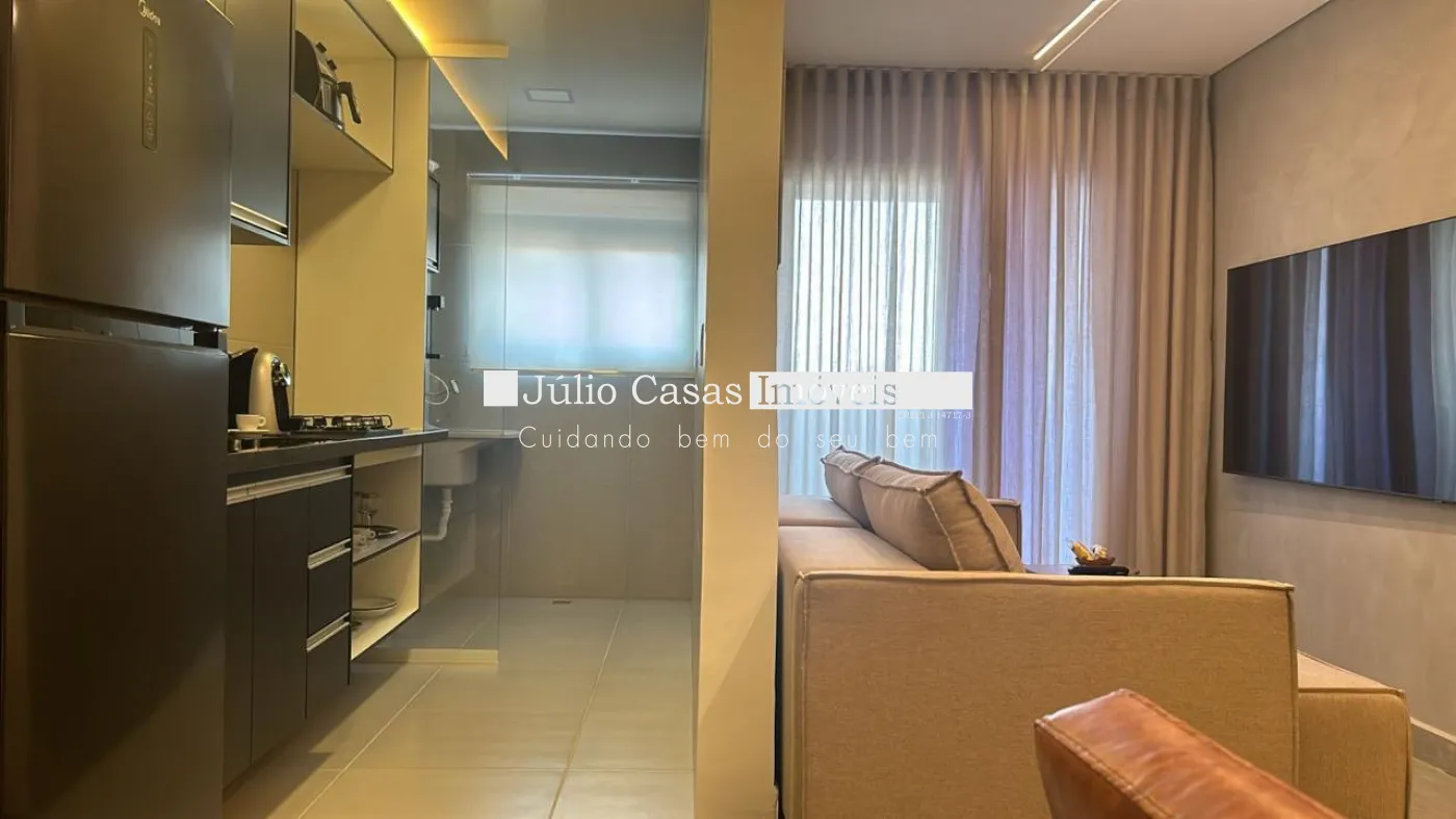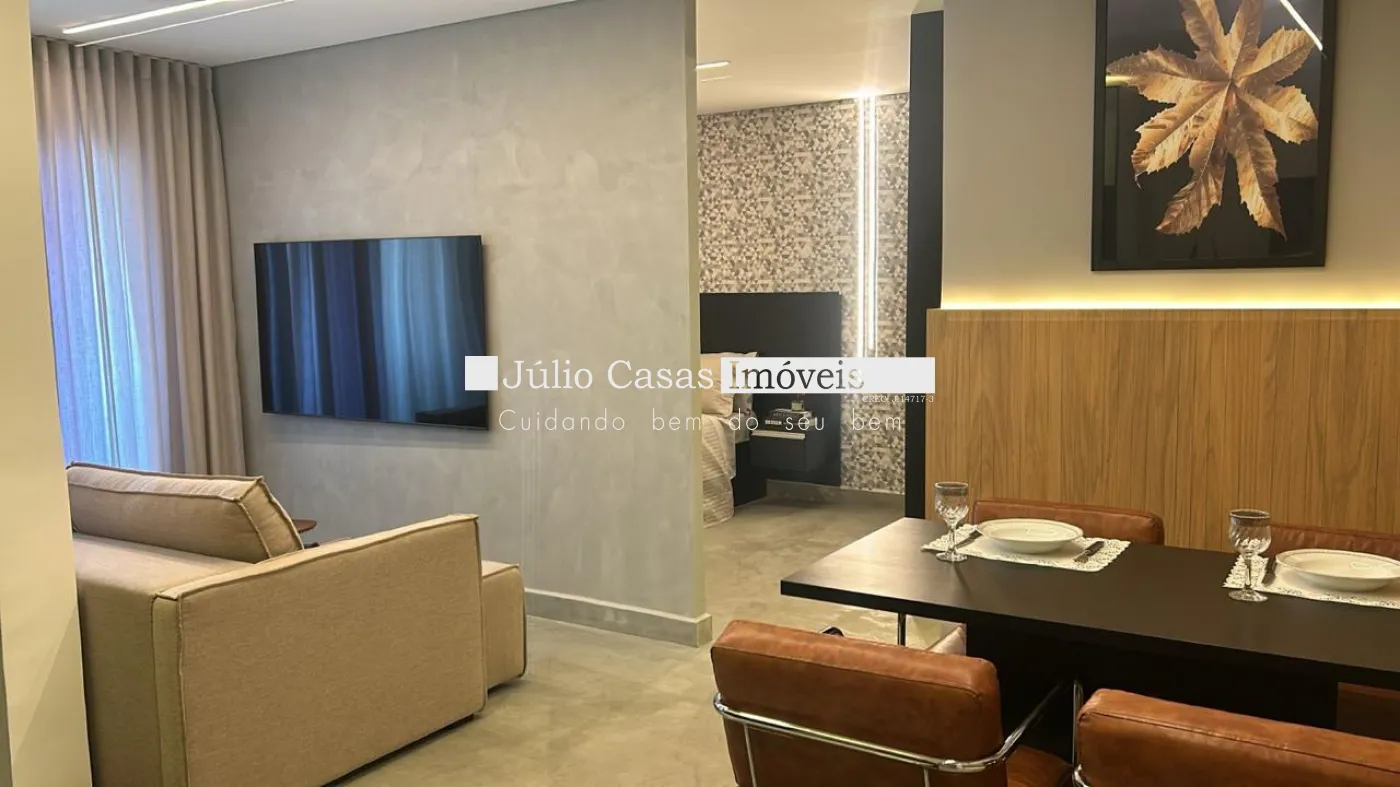 Flat mobiliado de 51m², em localização privilegiada, com ambientes integrados, com cozinha, área de serviço e varanda.