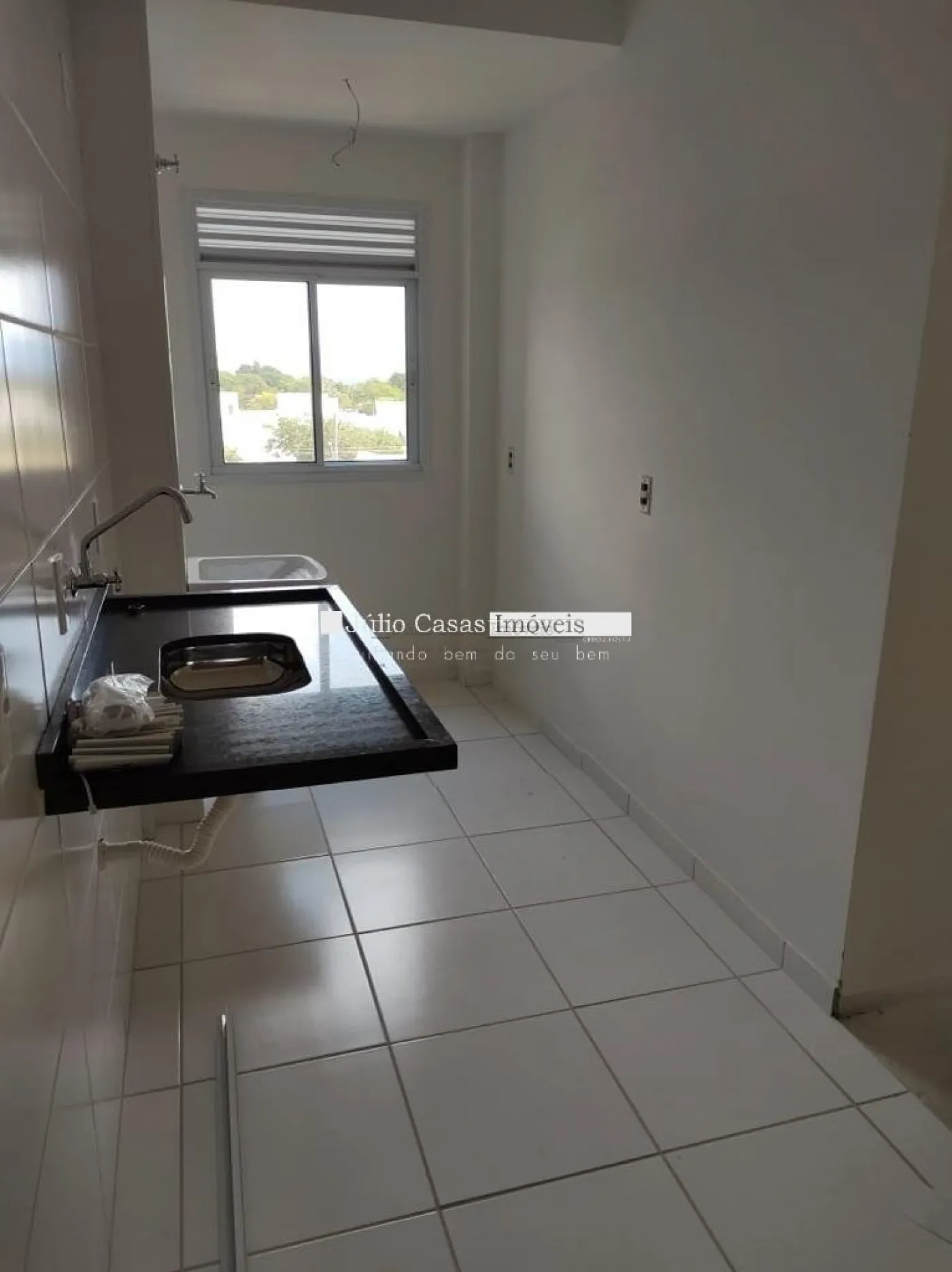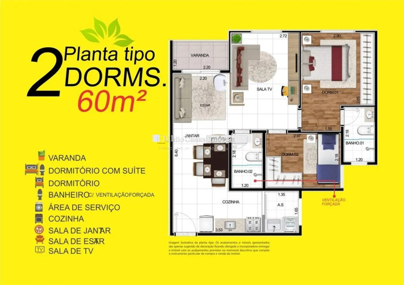 Apartamento de 60m², com planta para dois dormitórios e uma suíte, podendo ser configurado para três dormitórios e suíte. Composto por cozinha tipo americana, área de serviço, sala de TV, varanda e banheiro social. Piso revestido em material cerâmico nas áreas frias, esquadrias de alumínio, porta balcão com acesso à varanda e uma vaga de garagem.