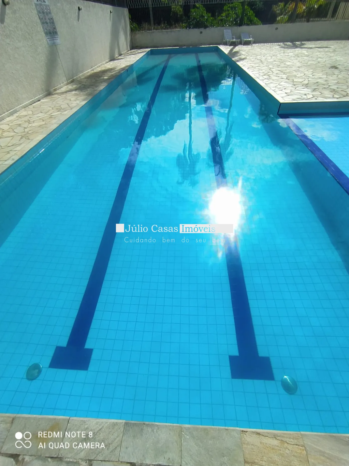 O condomínio oferece portaria 24 horas, piscina adulto (25m) e infantil, academia, salão de festas, quadra poliesportiva, churrasqueiras e brinquedoteca. A taxa de condomínio inclui água e gás.