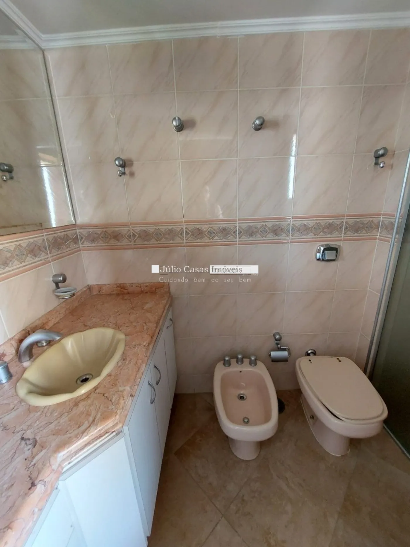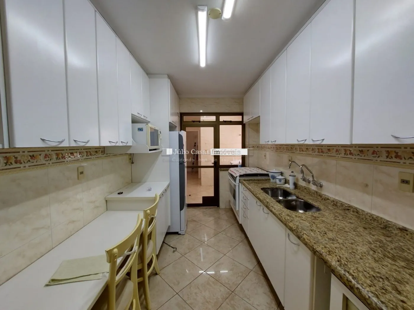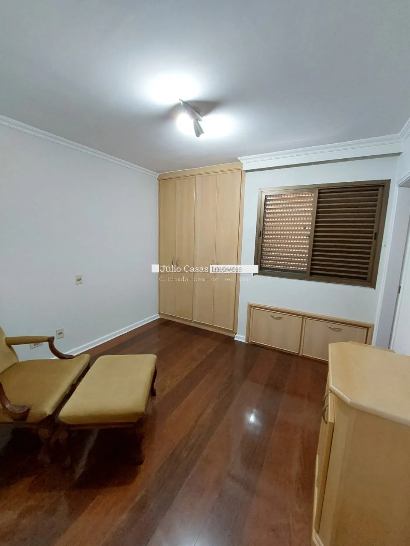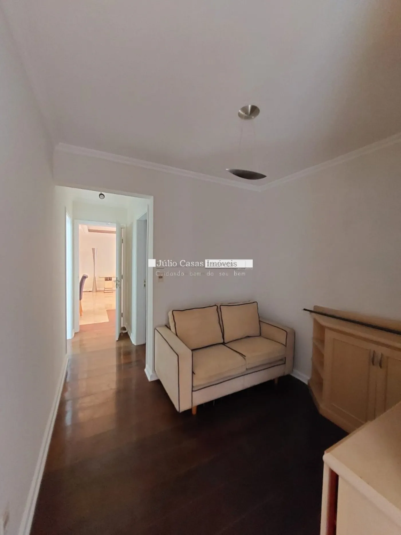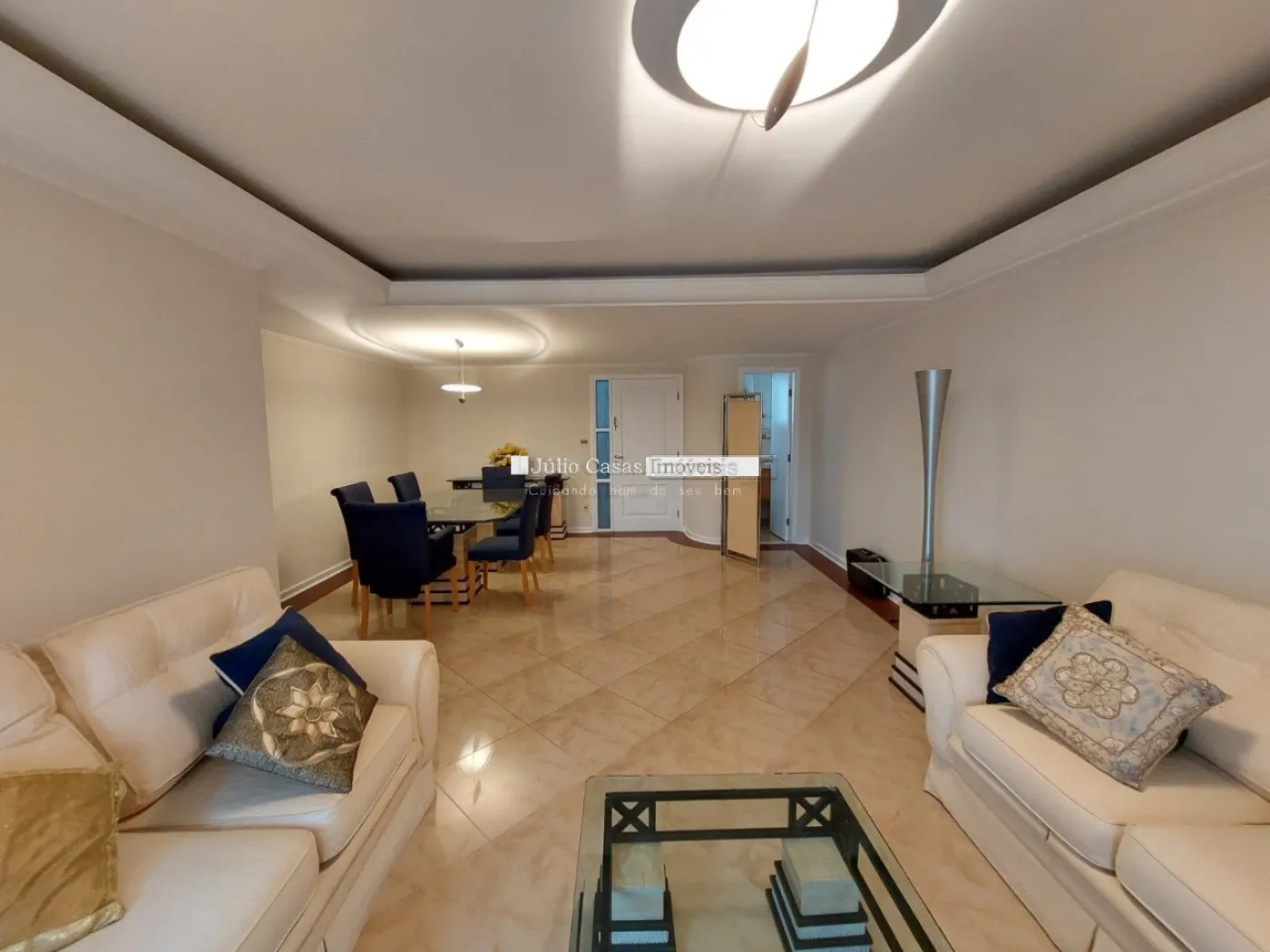 Sala 2 ambientes divididos entre jantar e estar, lavabo, sacada, escritório, cozinha com armários planejados, lavanderia com área de serviço e banheiro, quarto de despejo, 3 suítes com armários planejados e 2 vagas de garagem lado a lado cobertas.