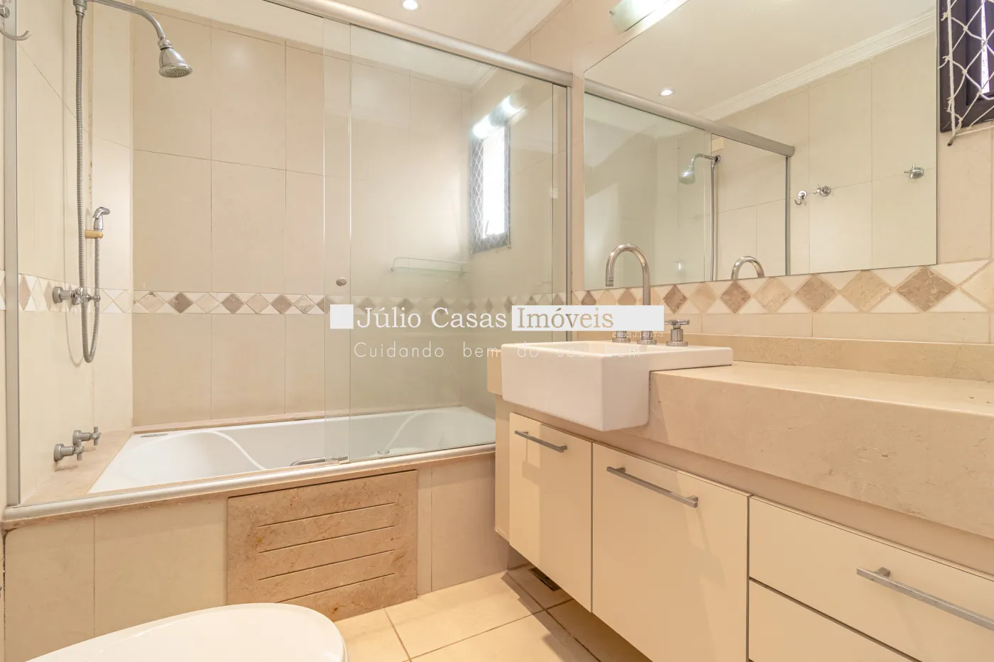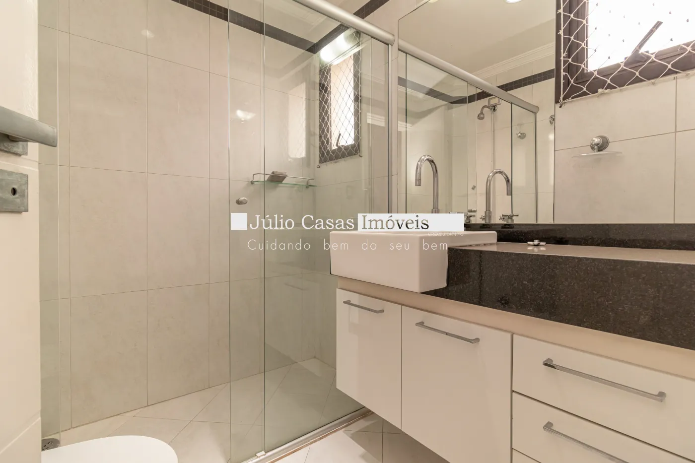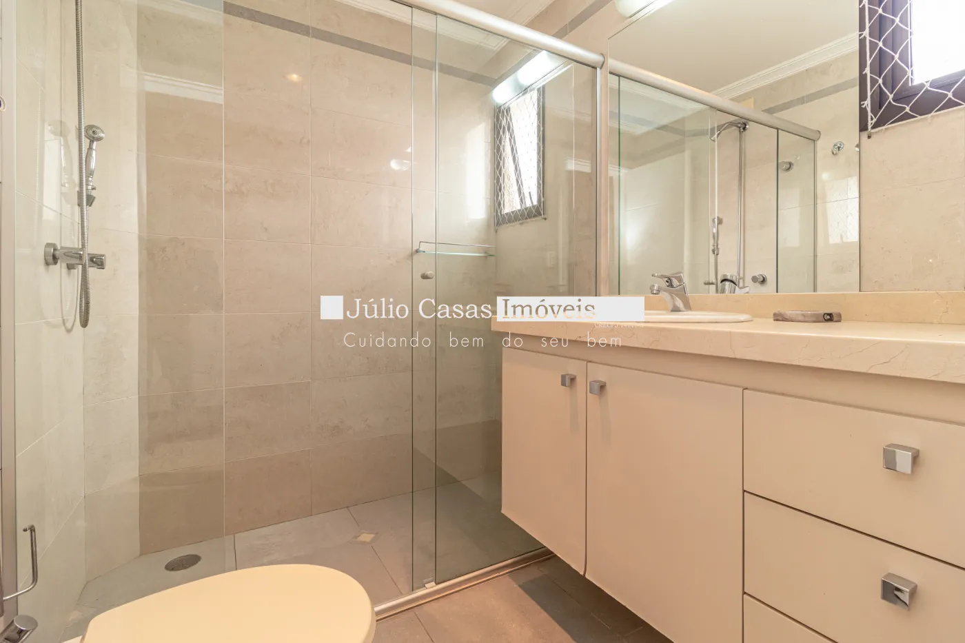 Todos os banheiros são projetados com box em vidro e gabinetes, garantindo praticidade e um toque de elegância.