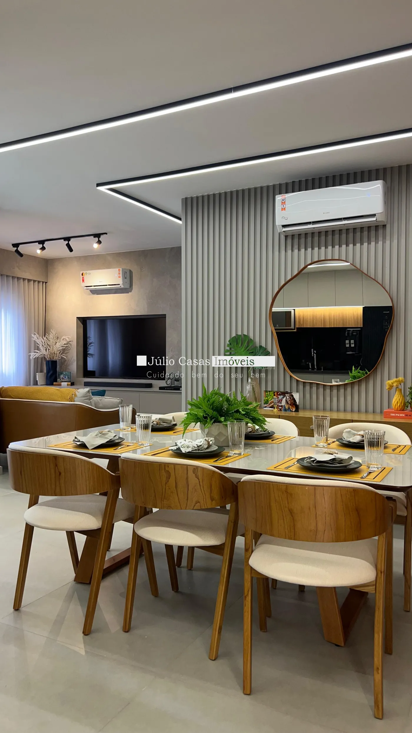 A sala, com dois ambientes integrados, proporciona um espaço harmonioso para jantar e relaxar, contando com uma Smart TV Samsung Q60CA de 65 polegadas e ar condicionado. A varanda gourmet é ideal para receber amigos e familiares.