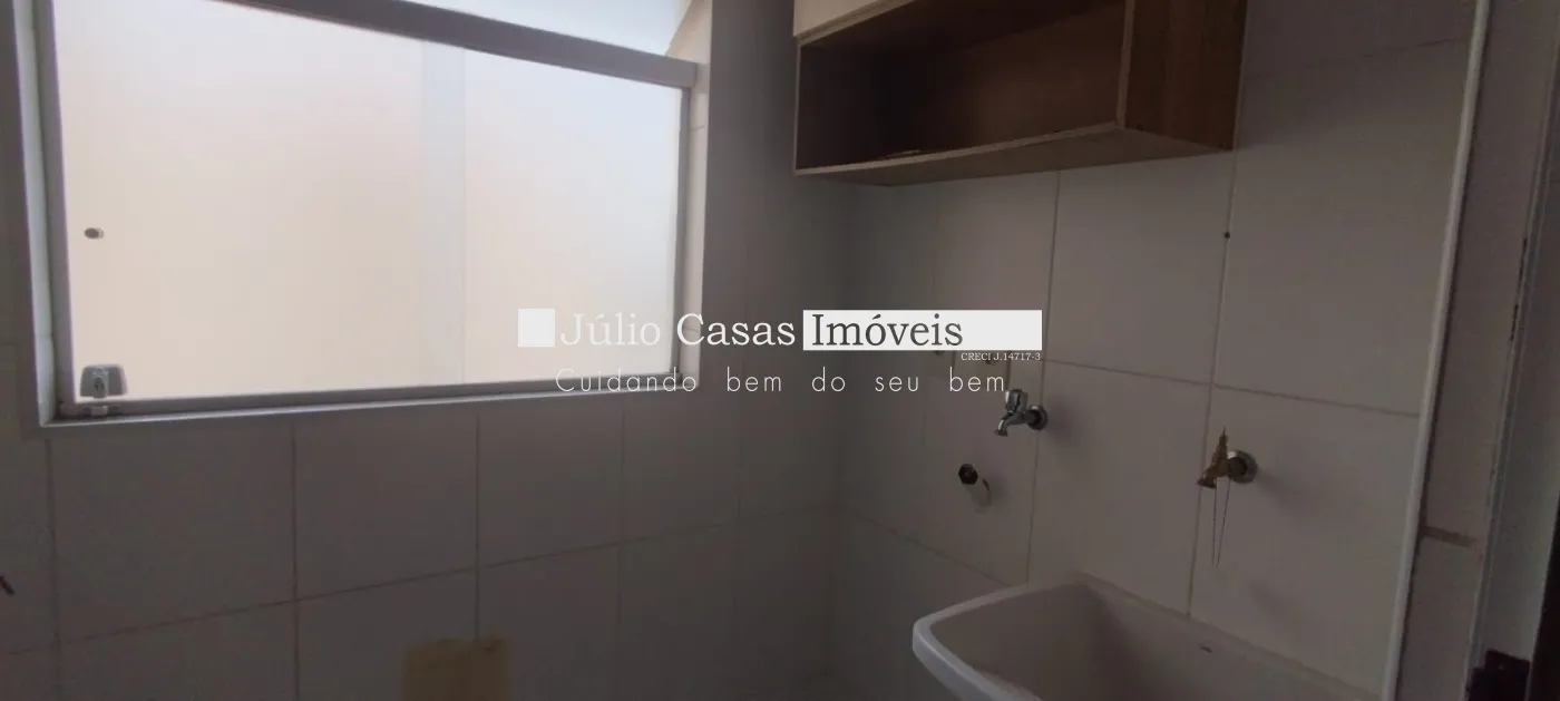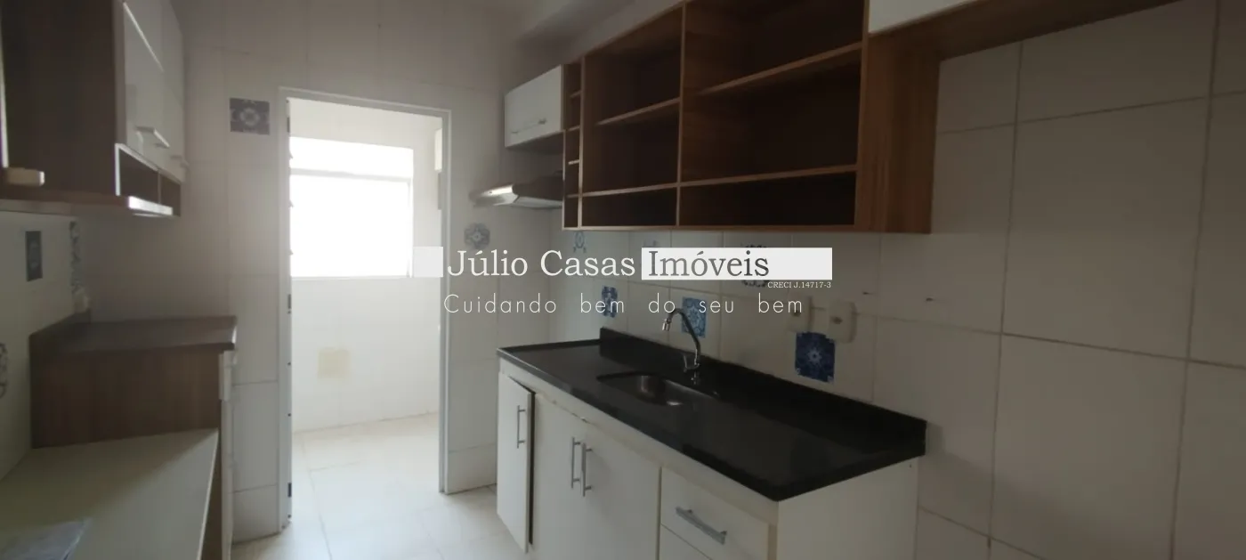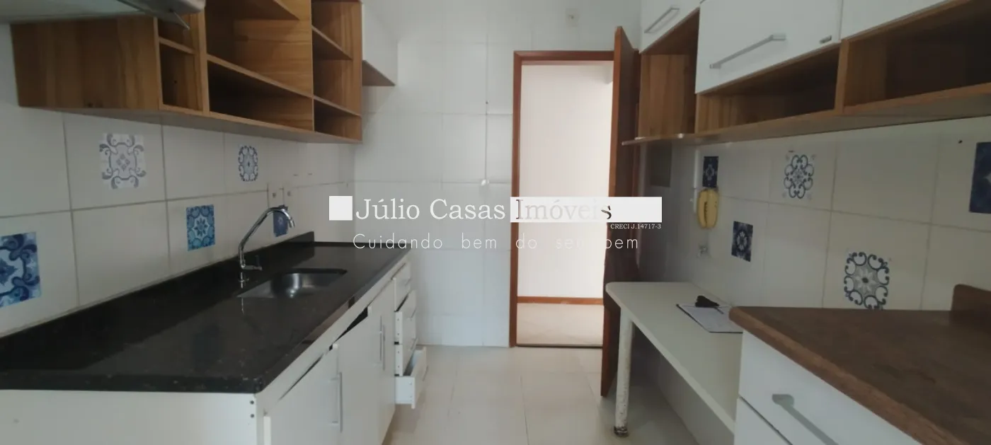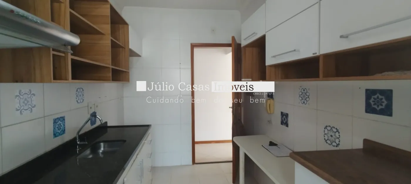 Sala para 02 ambientes, com sacada, cozinha planejada com armários, balcão, exaustor e pia em granito, lavanderia separada da cozinha.