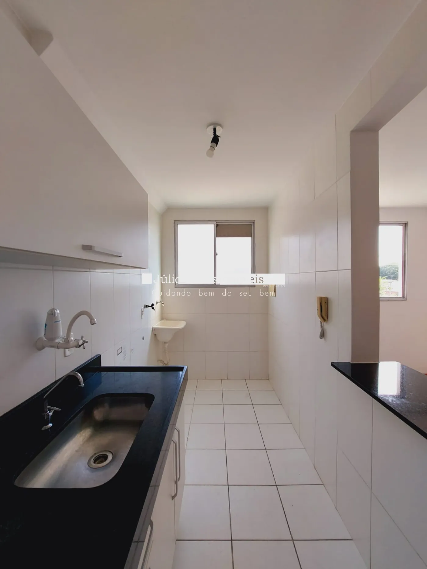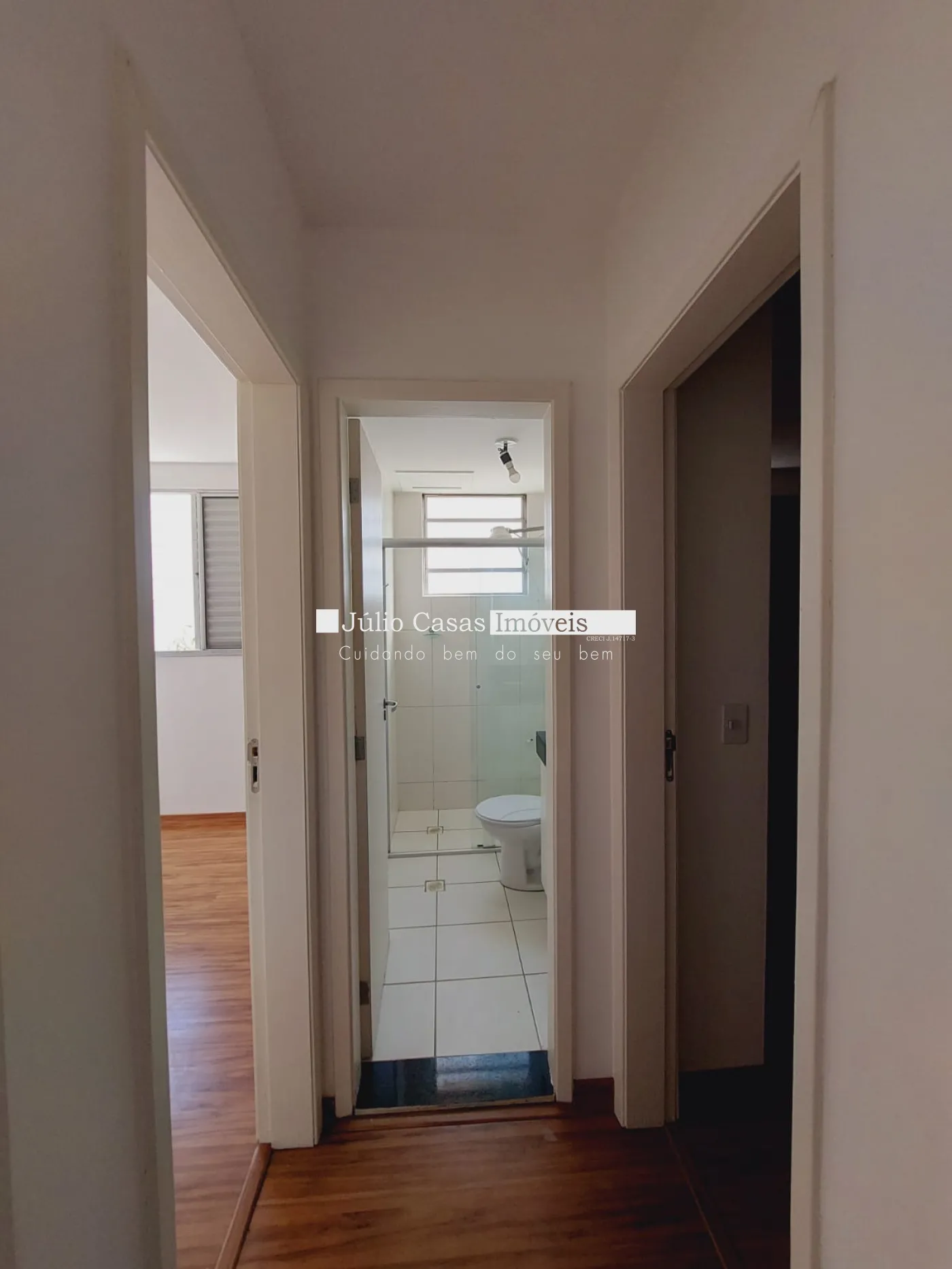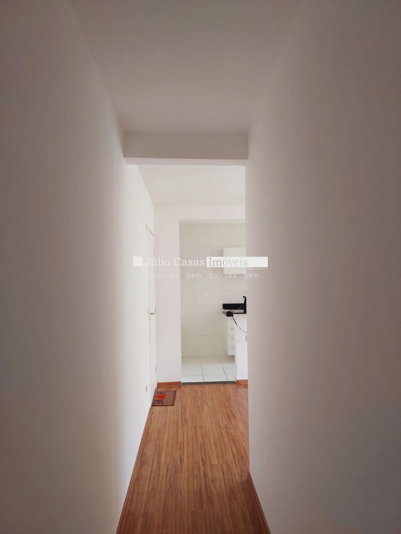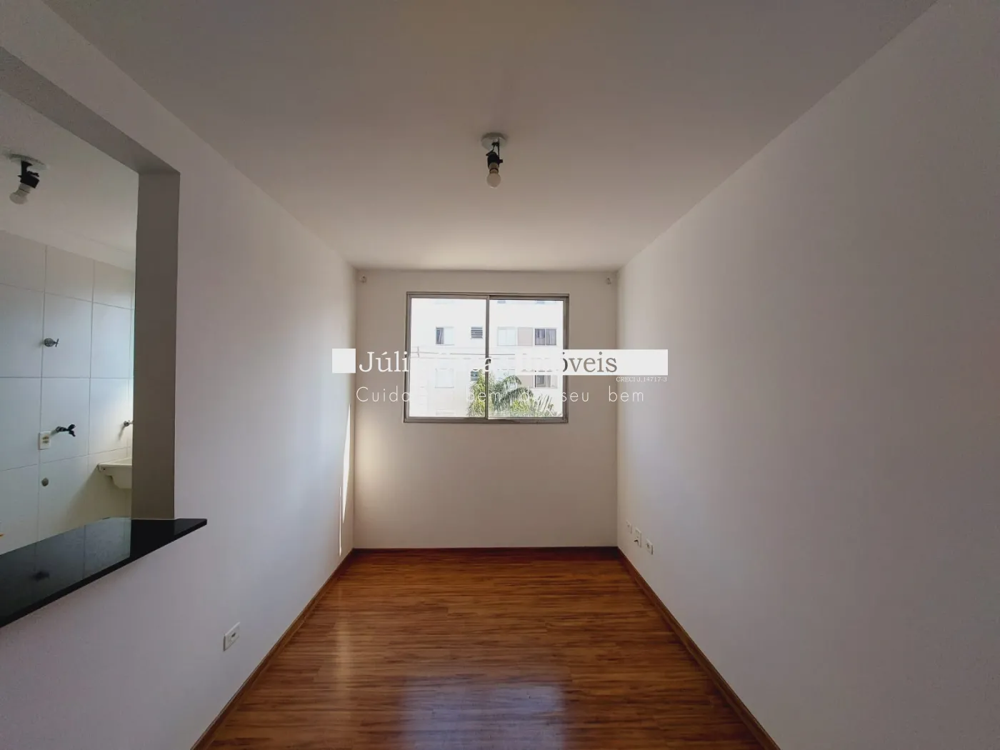 Apartamento com sala, cozinha com armários , cozinha integrada com a sala, wc social com box em vidro e gabinete, 2 quartos em piso laminado.