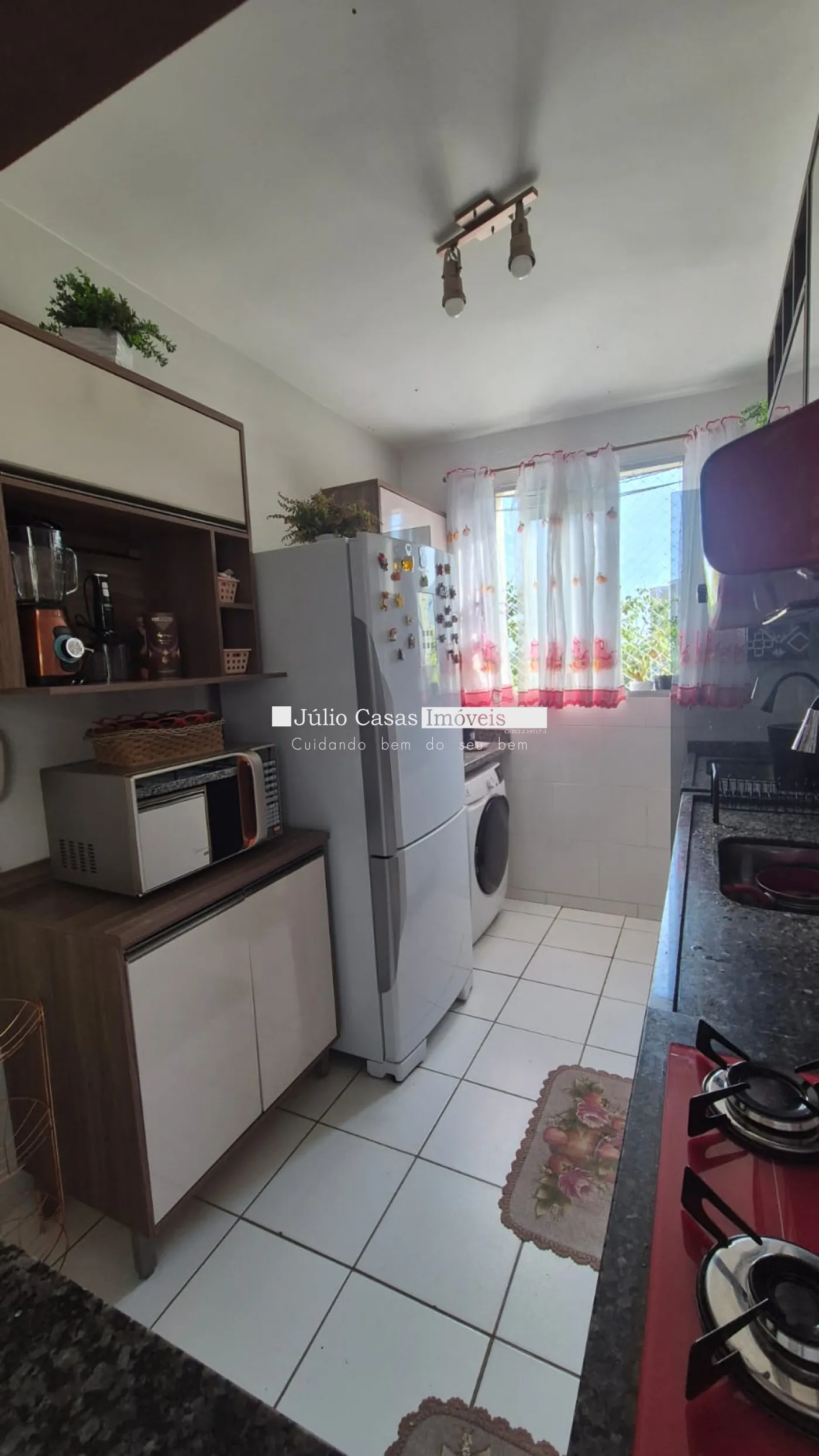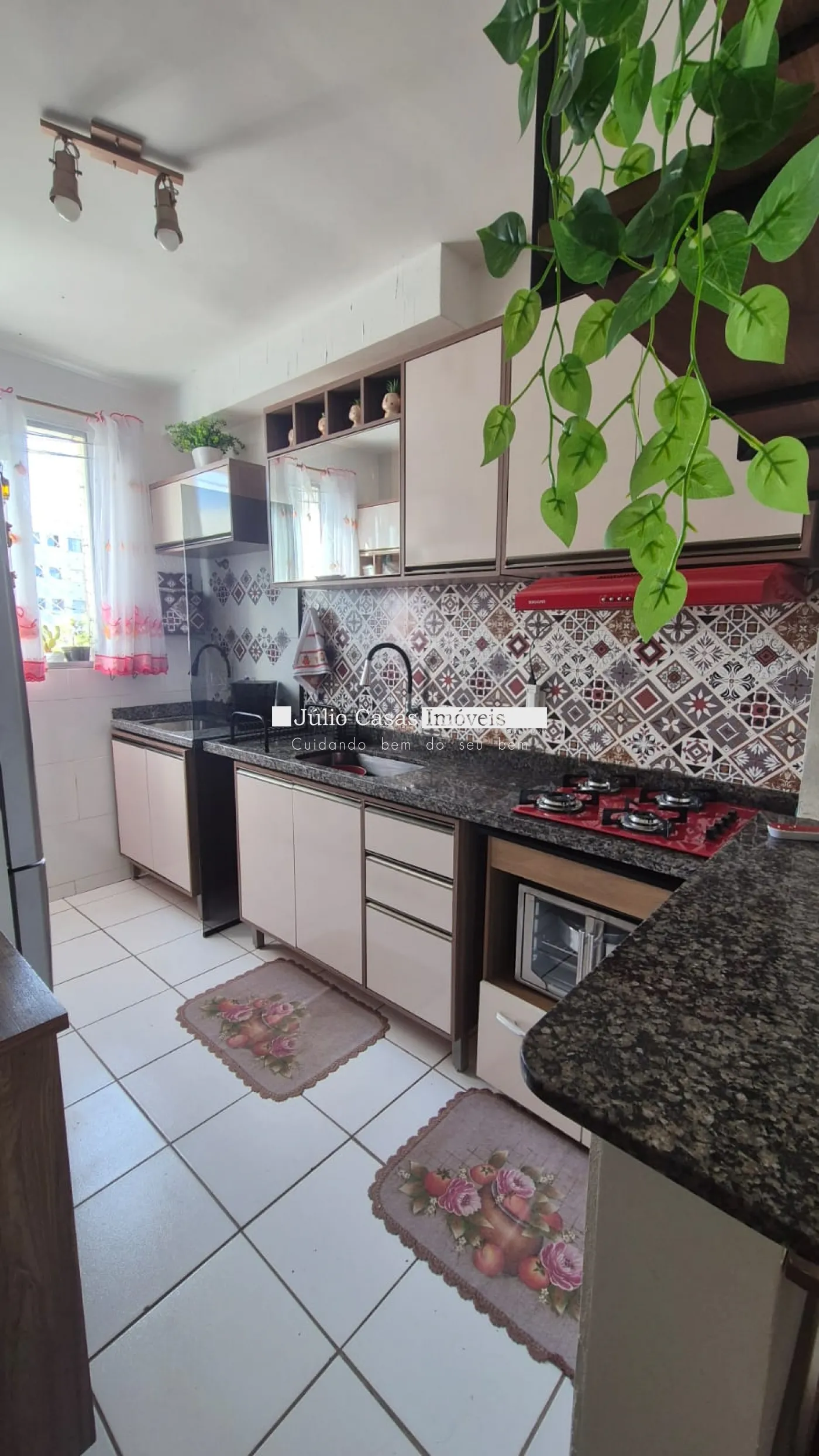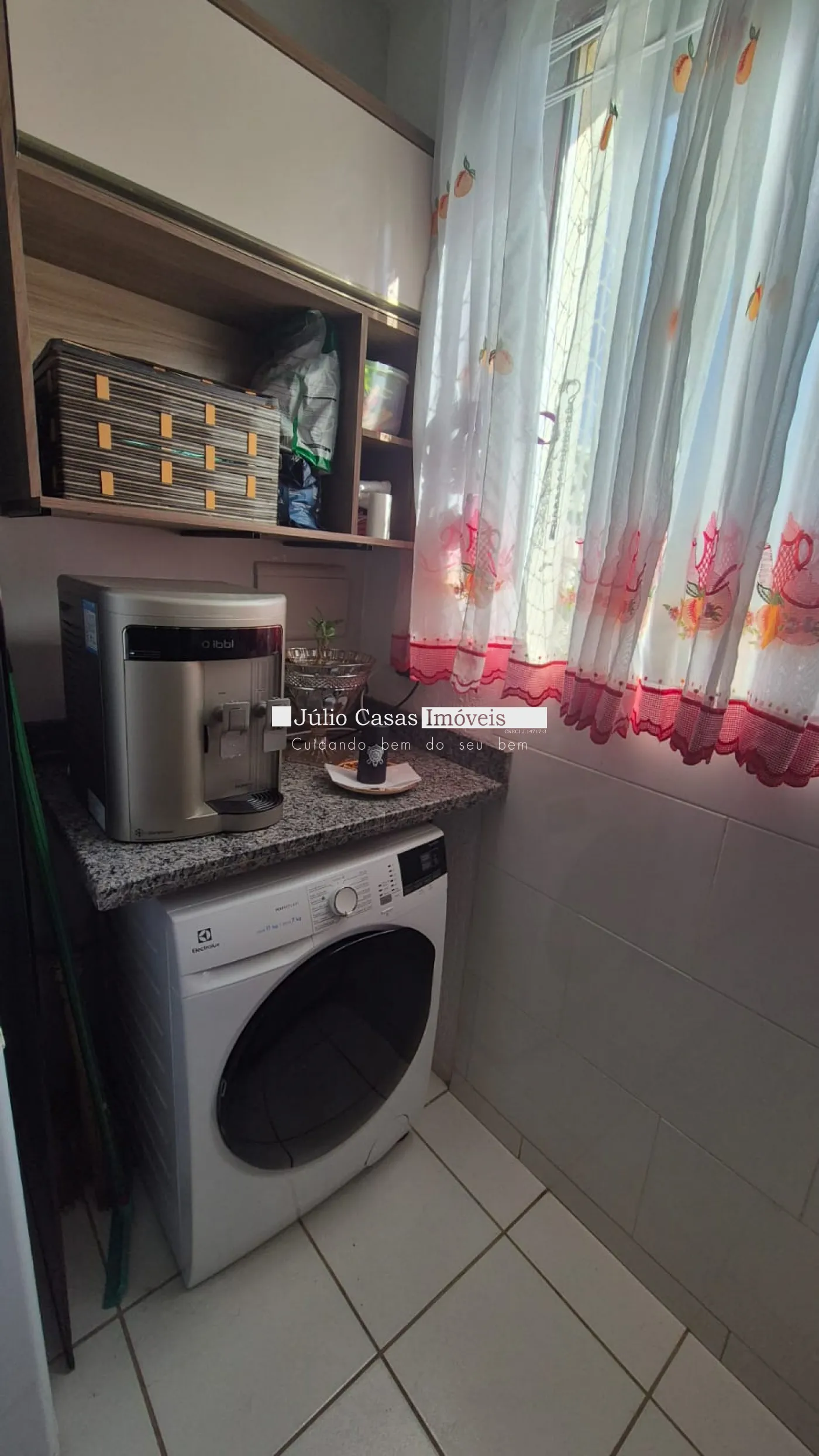 Apartamento a venda com sala de esta, cozinha com armários e lavanderia.