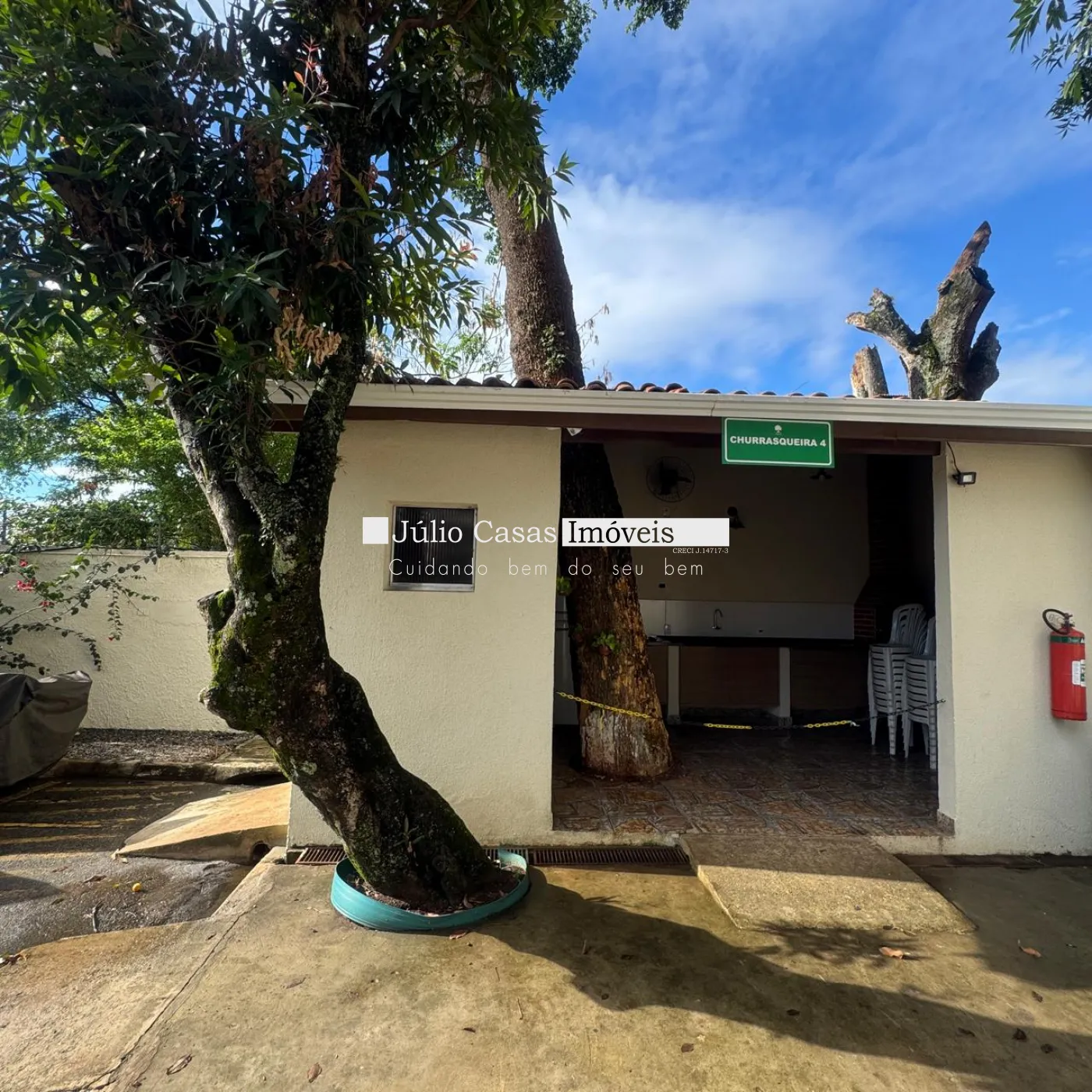Um grande espaço de convivência em meio á muitas arvores sendo algumas frutíferas.