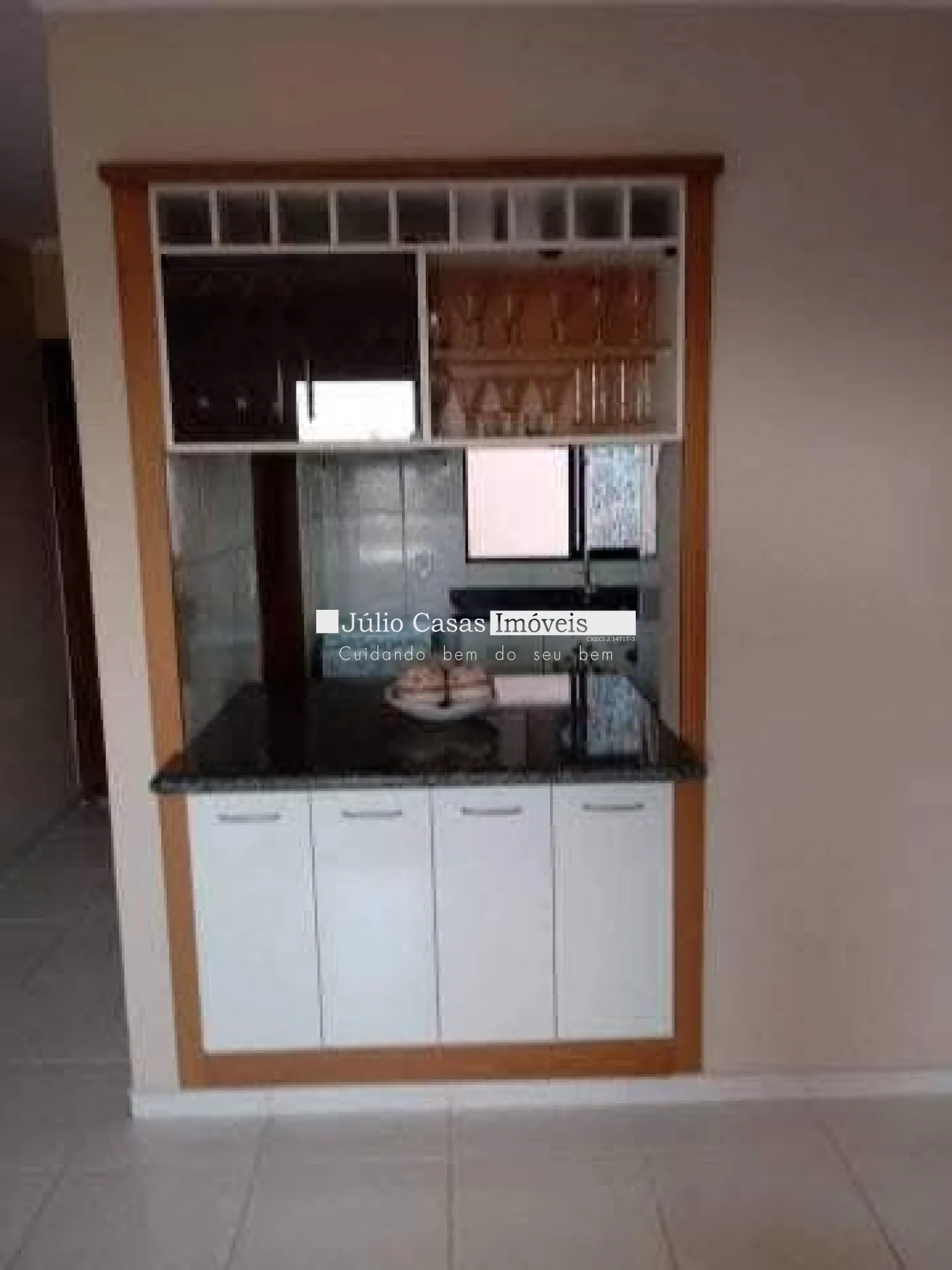 - Cozinha americana integrada à sala, com área de serviço anexa e armários modulados, garantindo funcionalidade e organização.