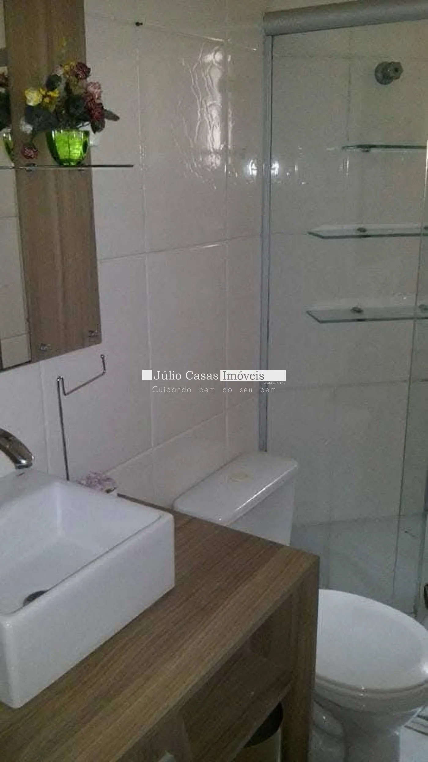 - Banheiro social moderno, equipado com box em vidro temperado e gabinete sob a pia com cuba de sobrepor em louça branca.