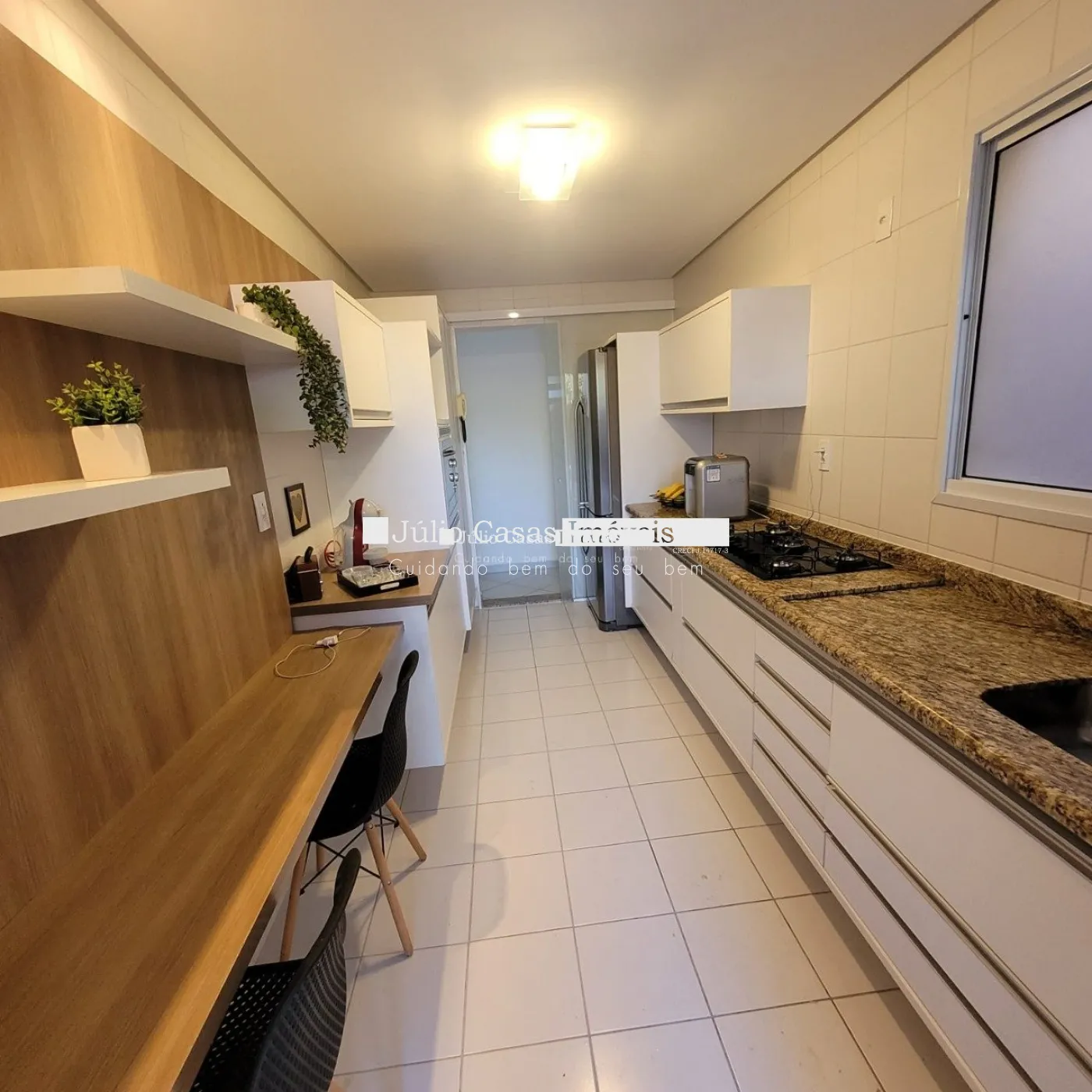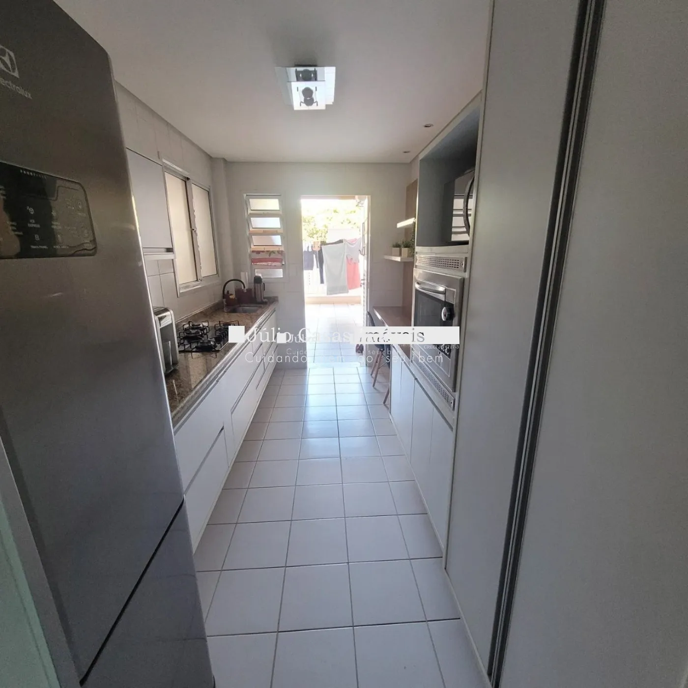 A sala, espaçosa e integrada, comporta dois ambientes e se abre para uma varanda, ideal para relaxamento e entretenimento. A cozinha é totalmente modulada e conecta-se diretamente à área gourmet, que é perfeita para eventos sociais, além de ter acesso à lavanderia externa.