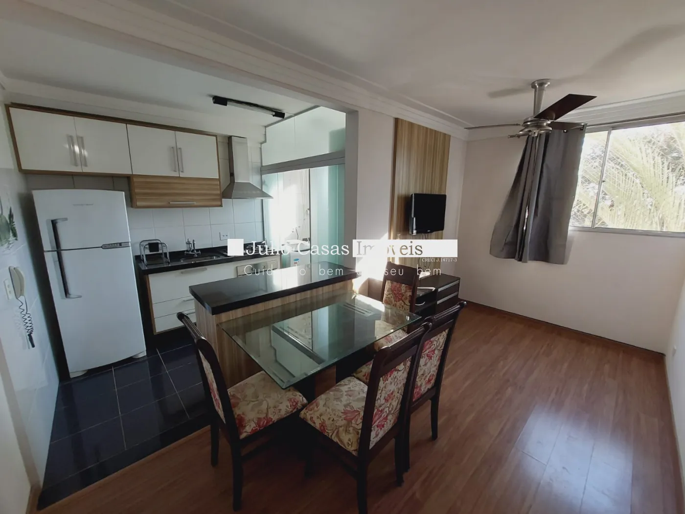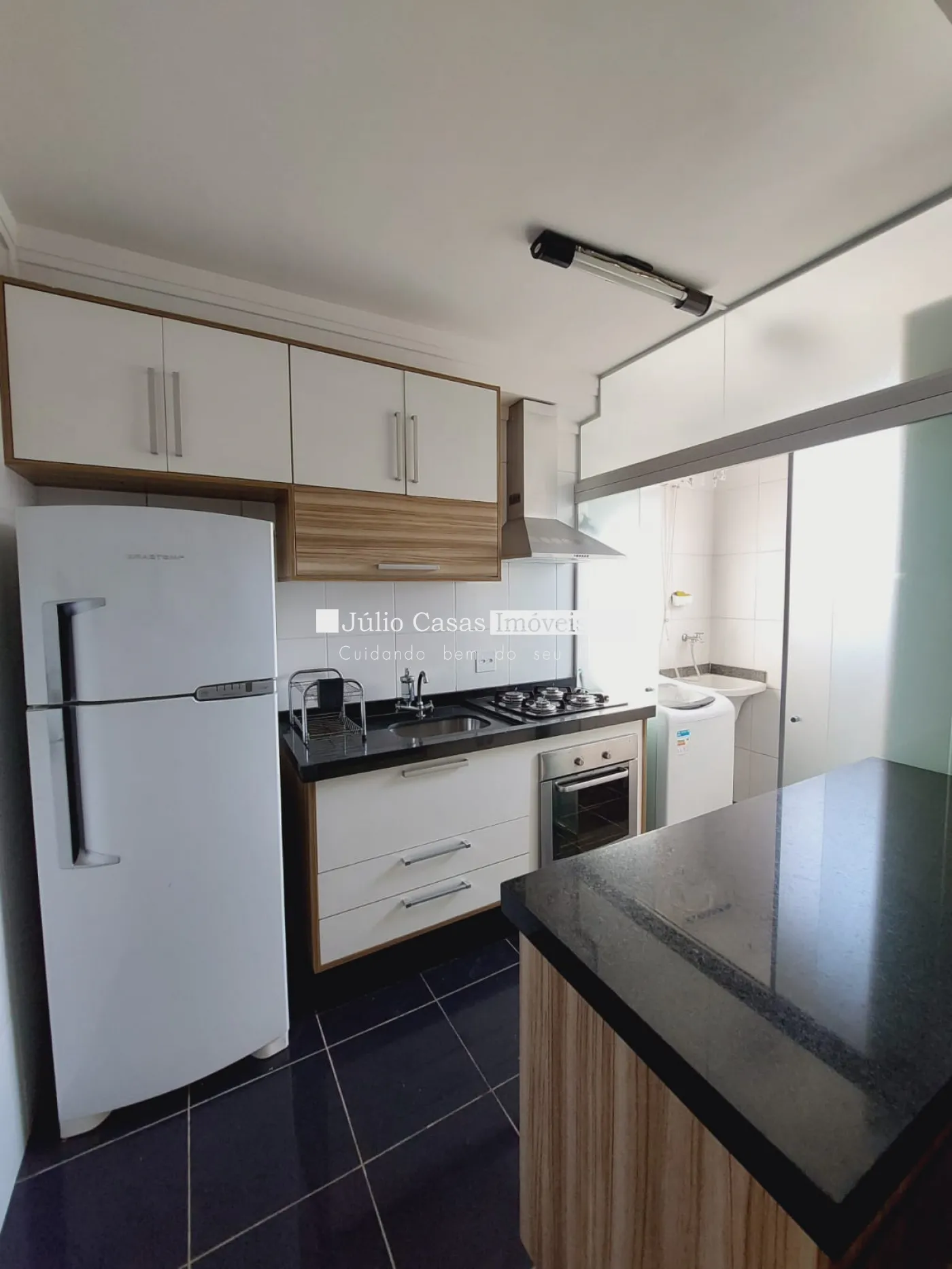 Apartamento mobiliado e modulado, com sala com cozinha americana, área de serviço com armários e separada por porta de vidro temperado, cozinha modulada com cooktop, exaustor, geladeira, fogão, mesa de jantar , rack com TV, máquina de lavar roupa e secadora.