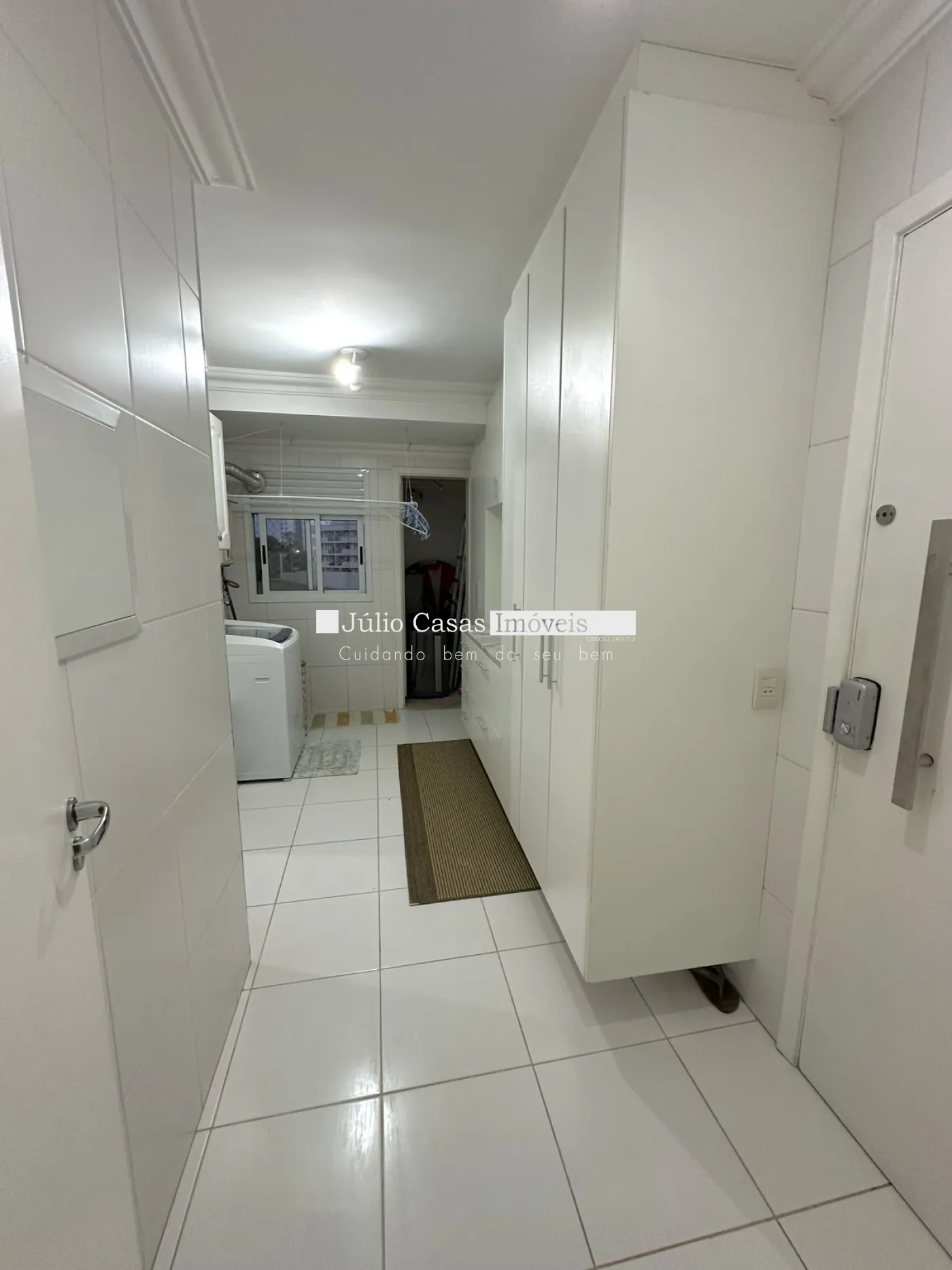 Área de serviço com armários planejados e banheiro auxiliar.