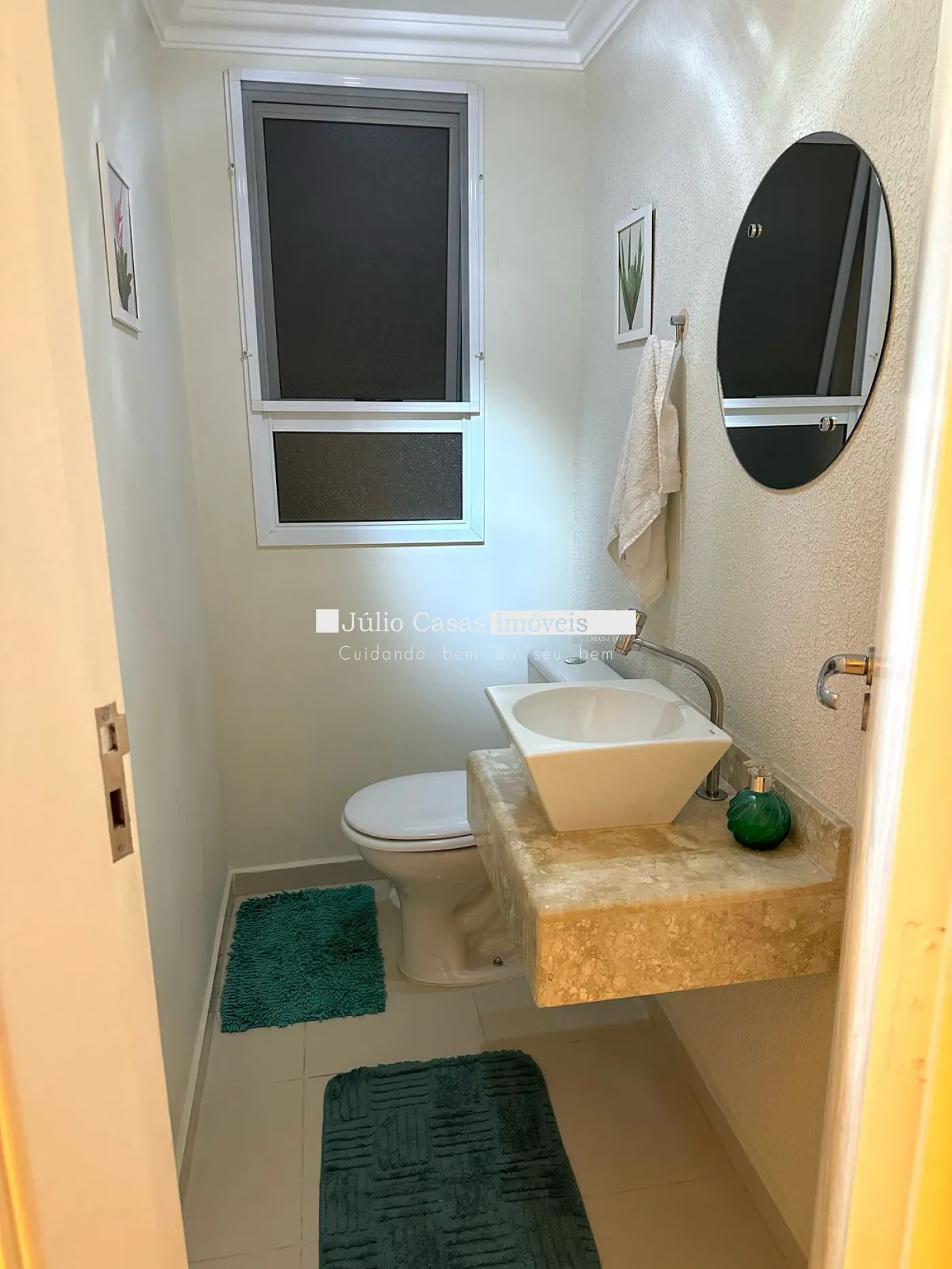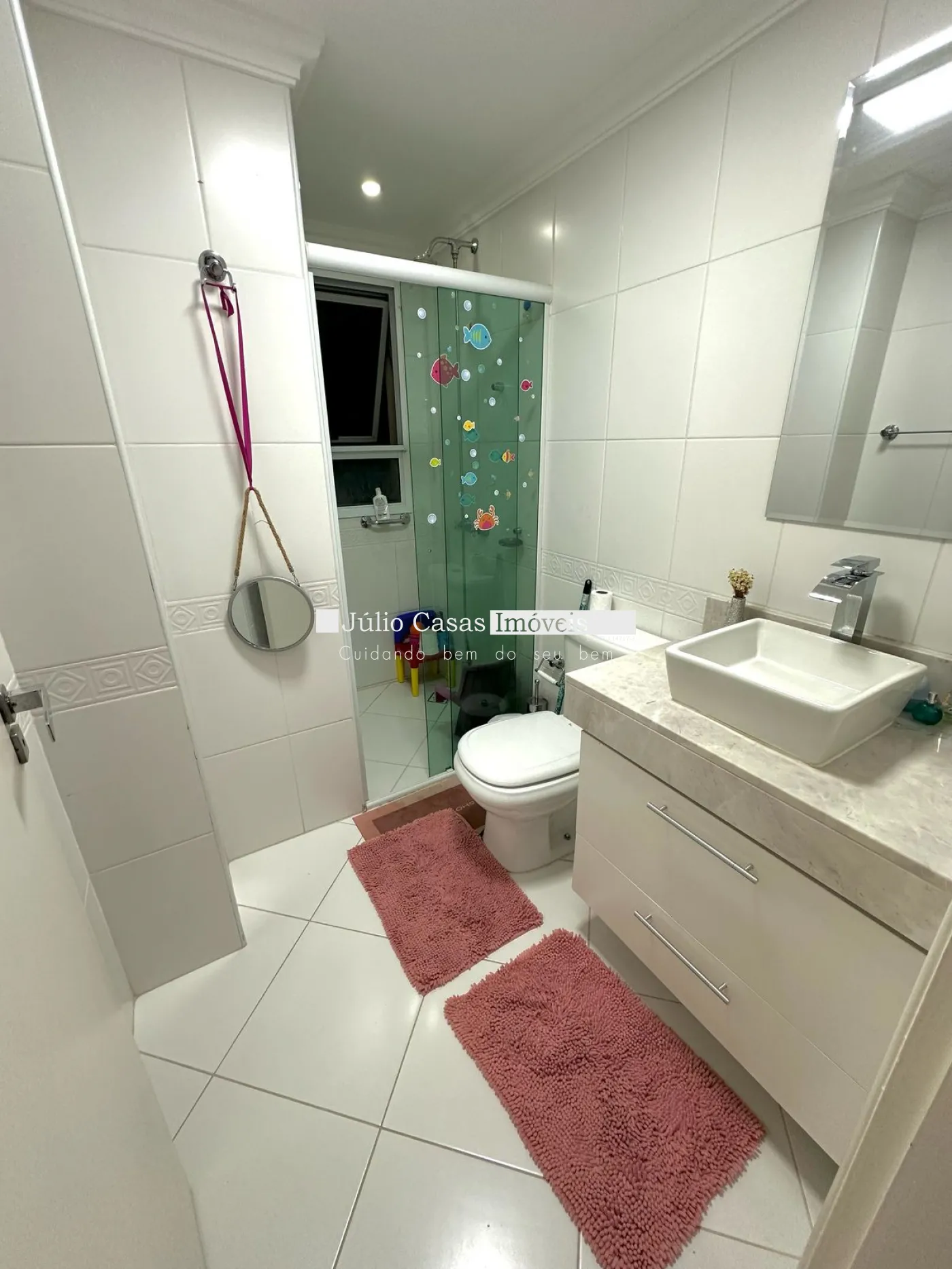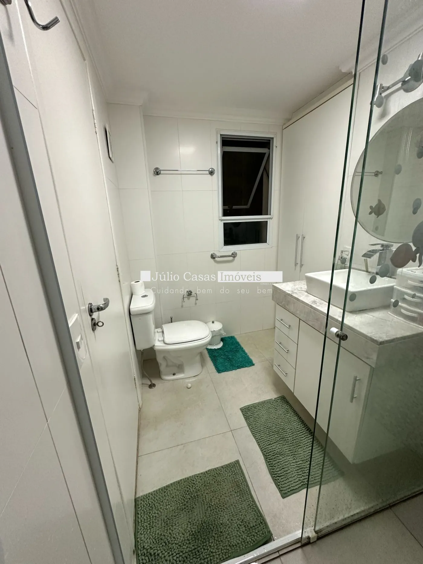 Banheiro social e suíte com box em vidro temperado e gabinetes.