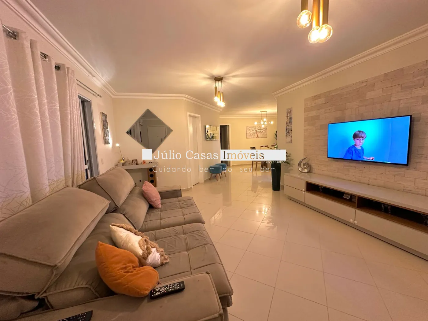 Sala ampla para dois ambientes, integrada à varanda, com rack em mármore, proporcionando conforto e sofisticação.