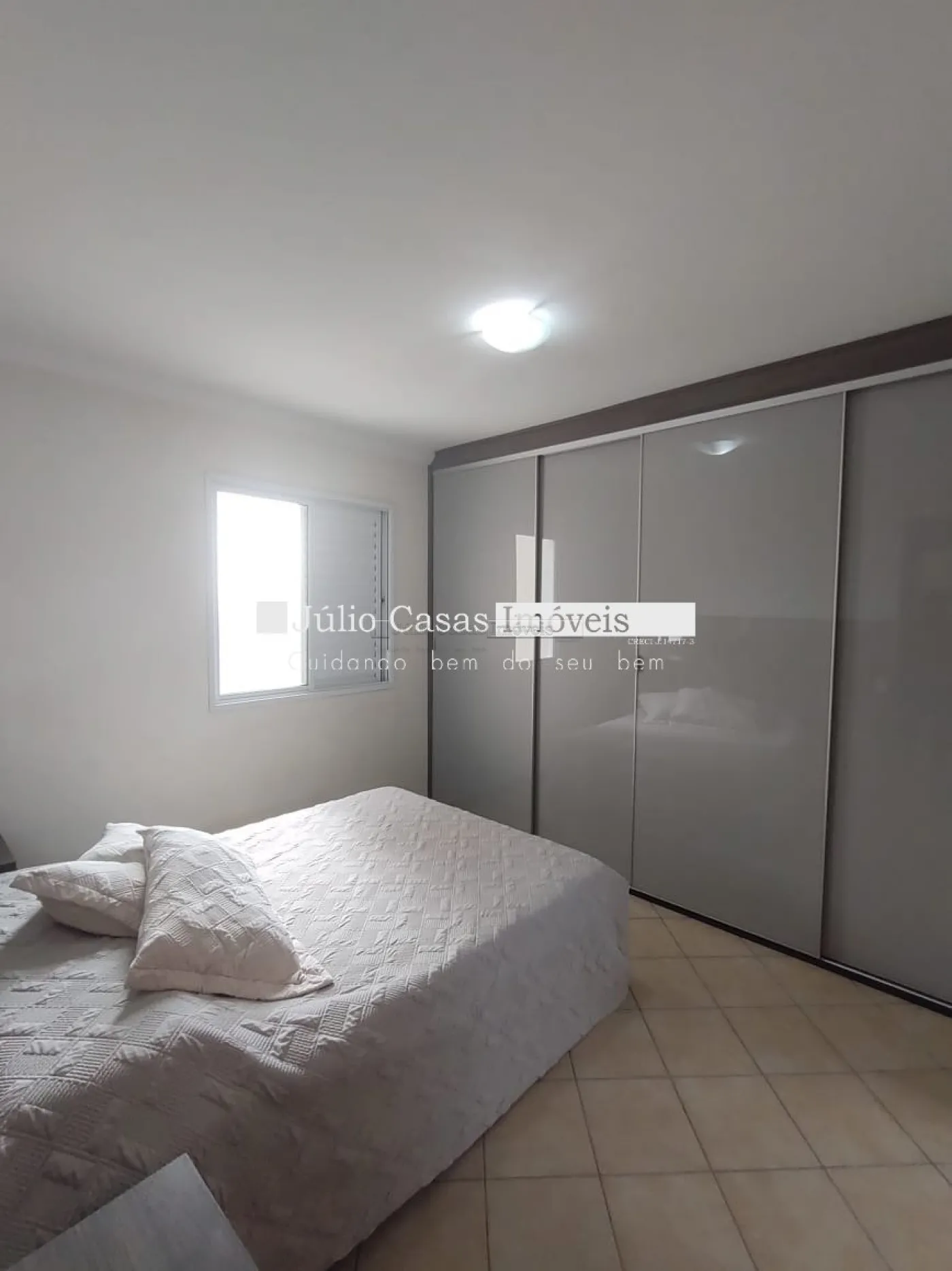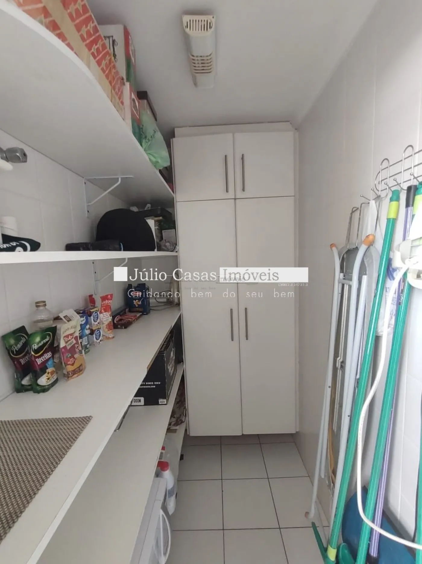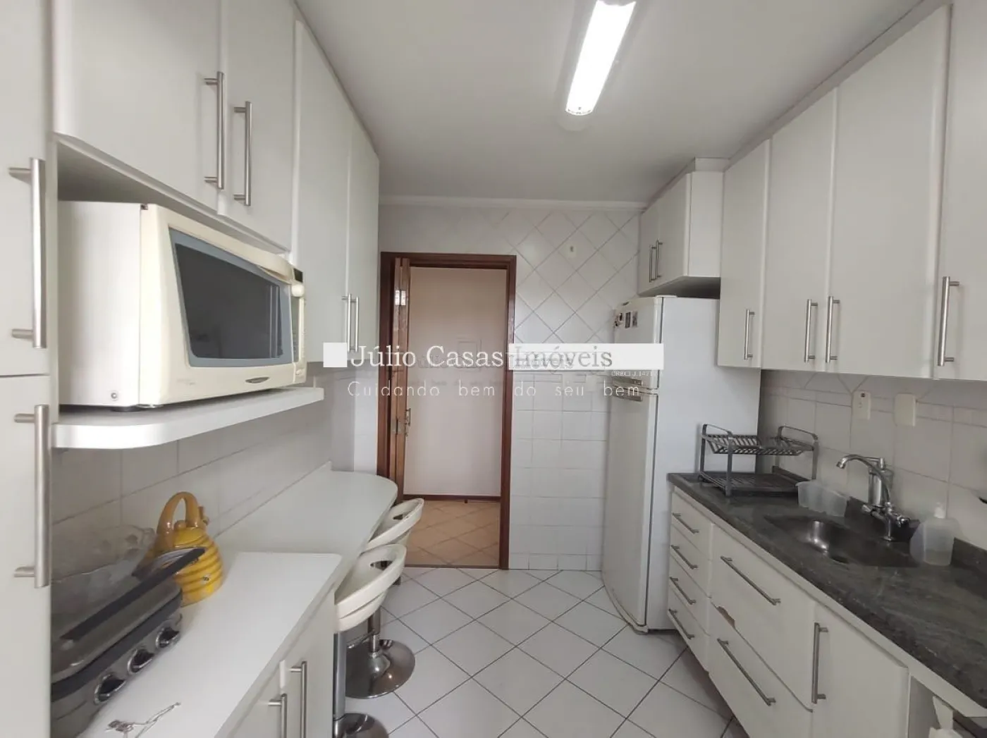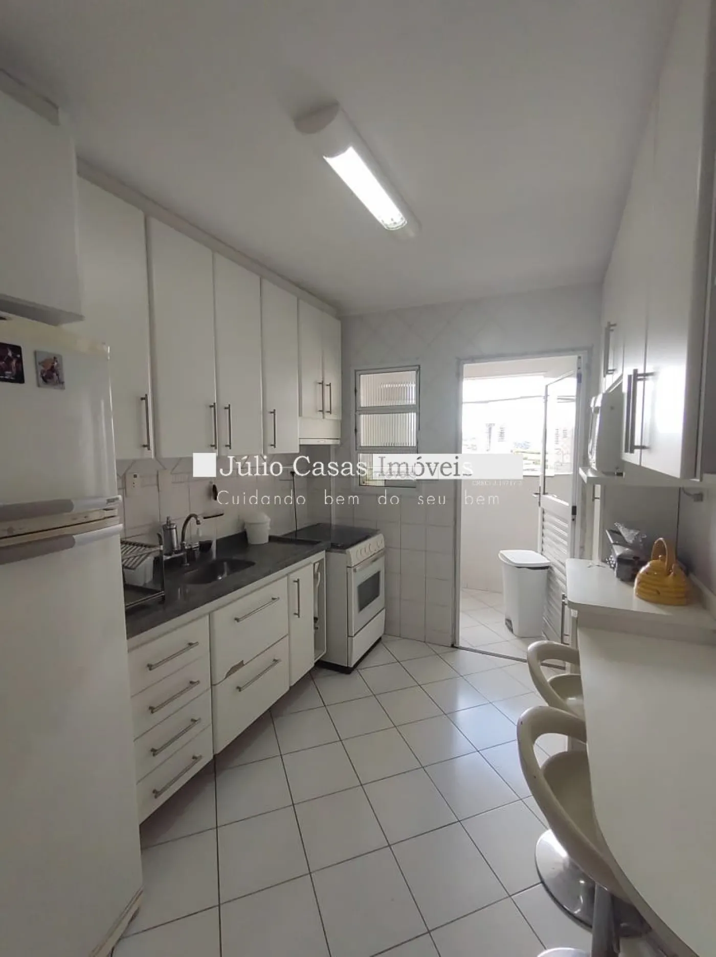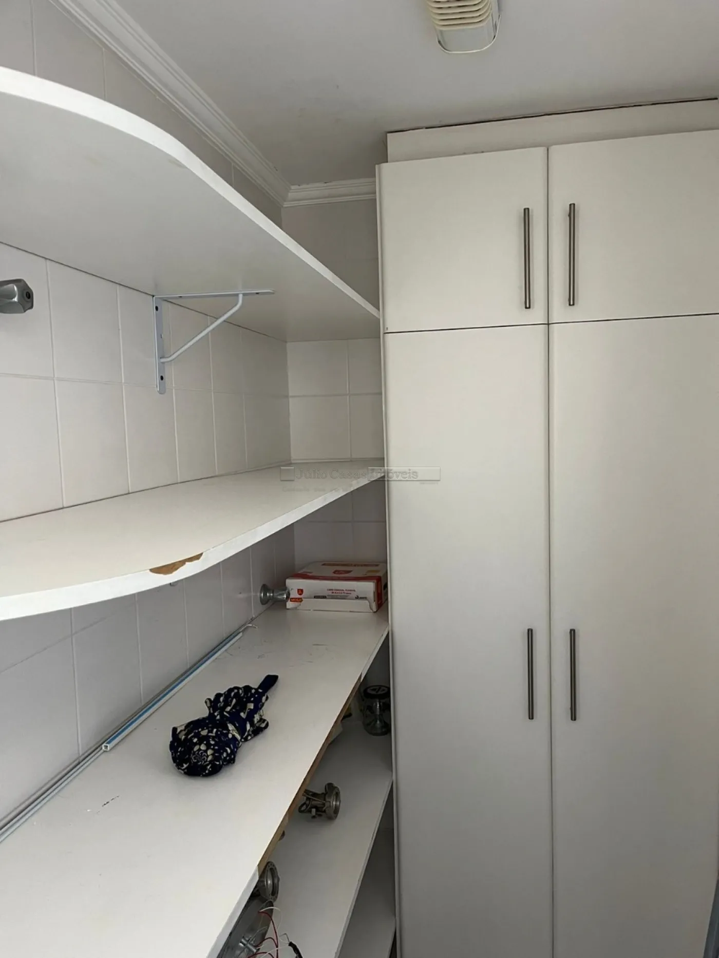 O imóvel conta com três dormitórios, incluindo uma suíte, todos equipados com armários planejados da Todeschini. O banheiro social é moderno, com box de vidro e gabinetes sob medida. A cozinha é modulada e a área de serviço é separada por uma porta, garantindo praticidade e organização. Todo o apartamento é revestido com piso cerâmico de alta qualidade.