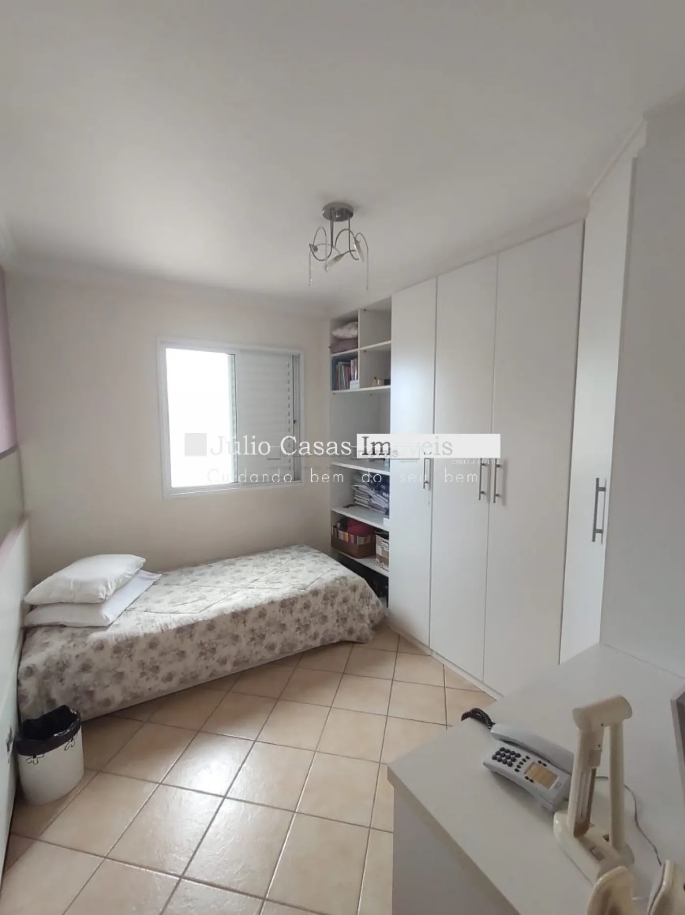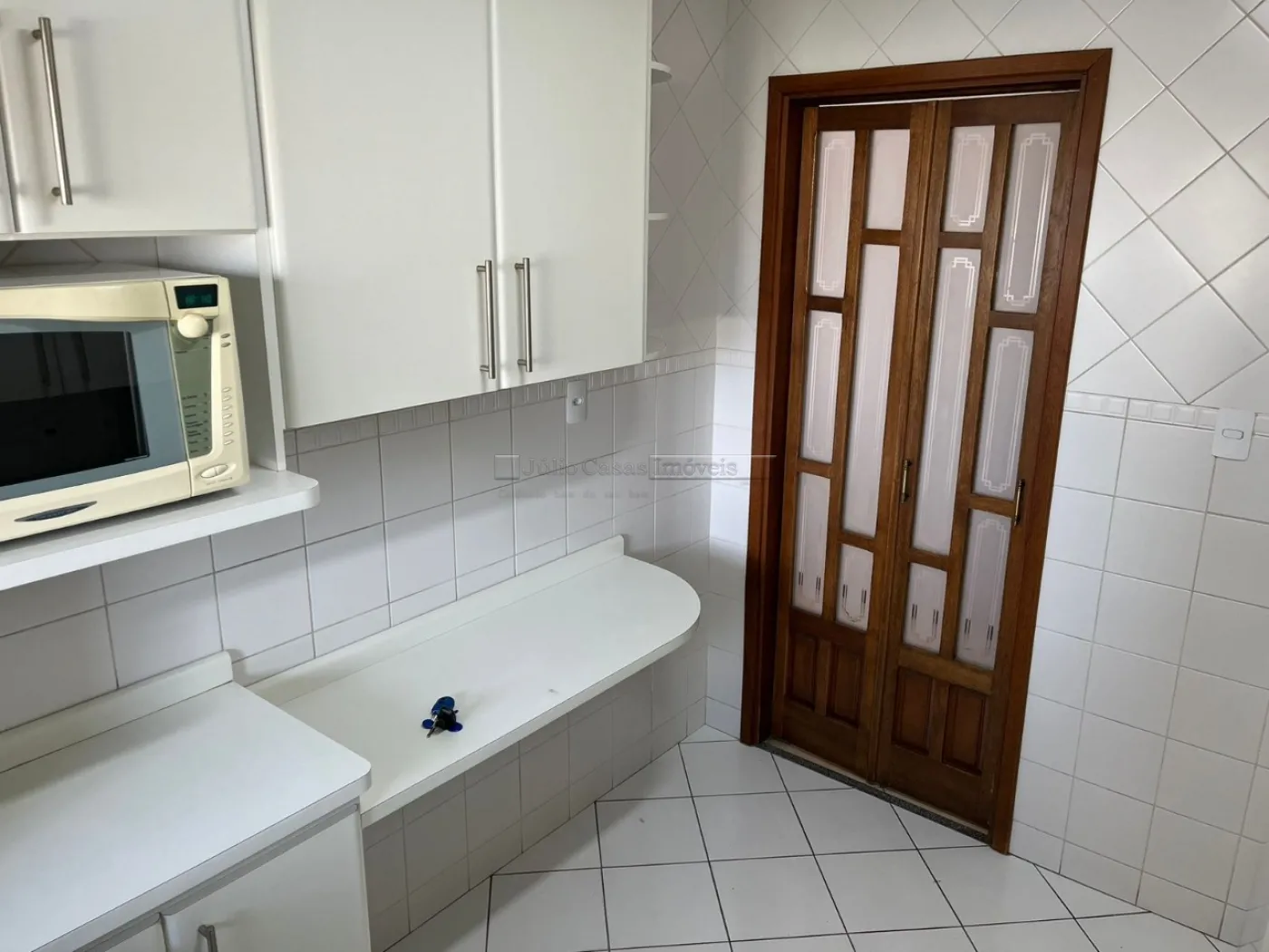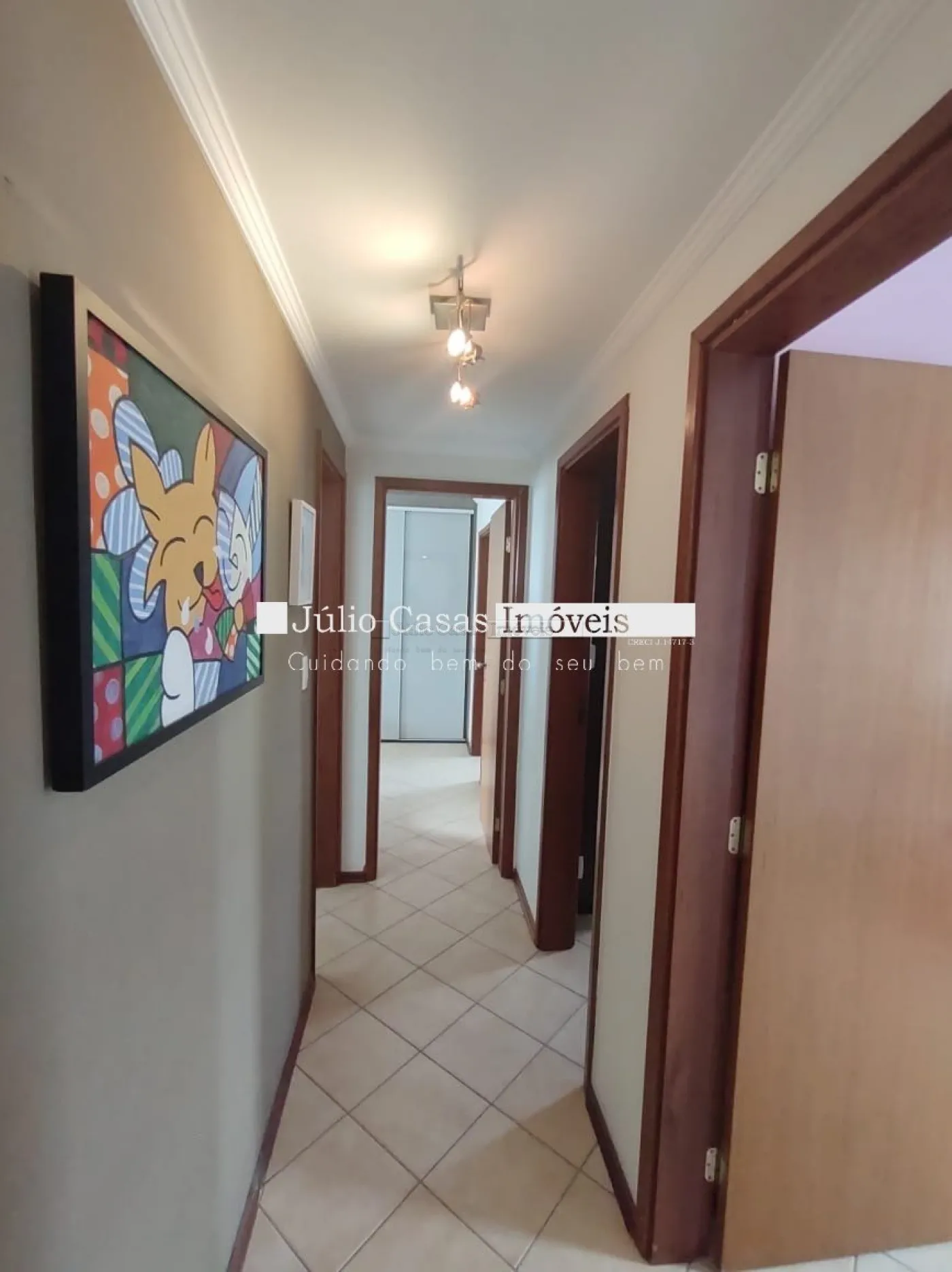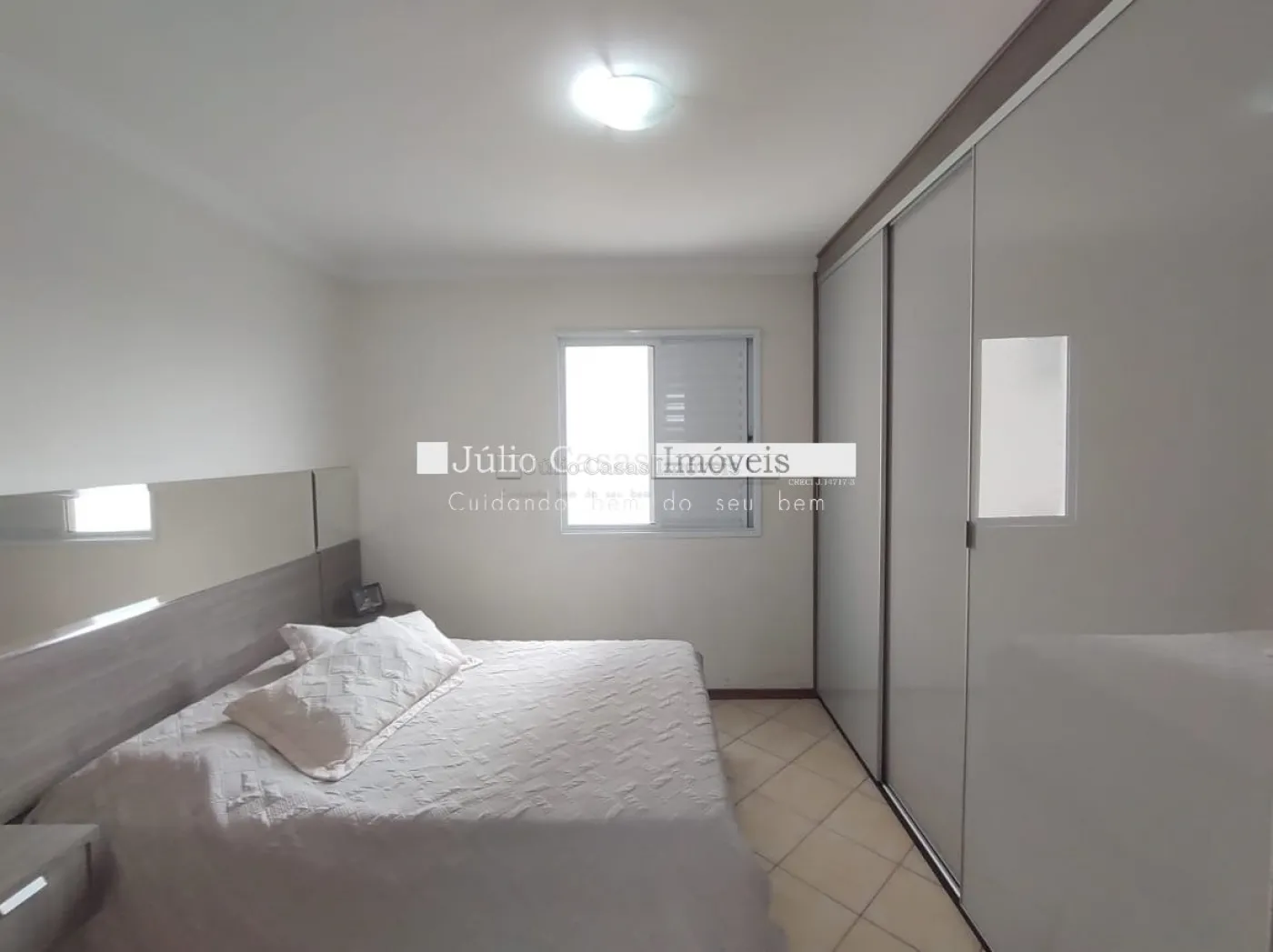 O imóvel conta com três dormitórios, incluindo uma suíte, todos equipados com armários planejados da Todeschini. O banheiro social é moderno, com box de vidro e gabinetes sob medida. A cozinha é modulada e a área de serviço é separada por uma porta, garantindo praticidade e organização. Todo o apartamento é revestido com piso cerâmico de alta qualidade.