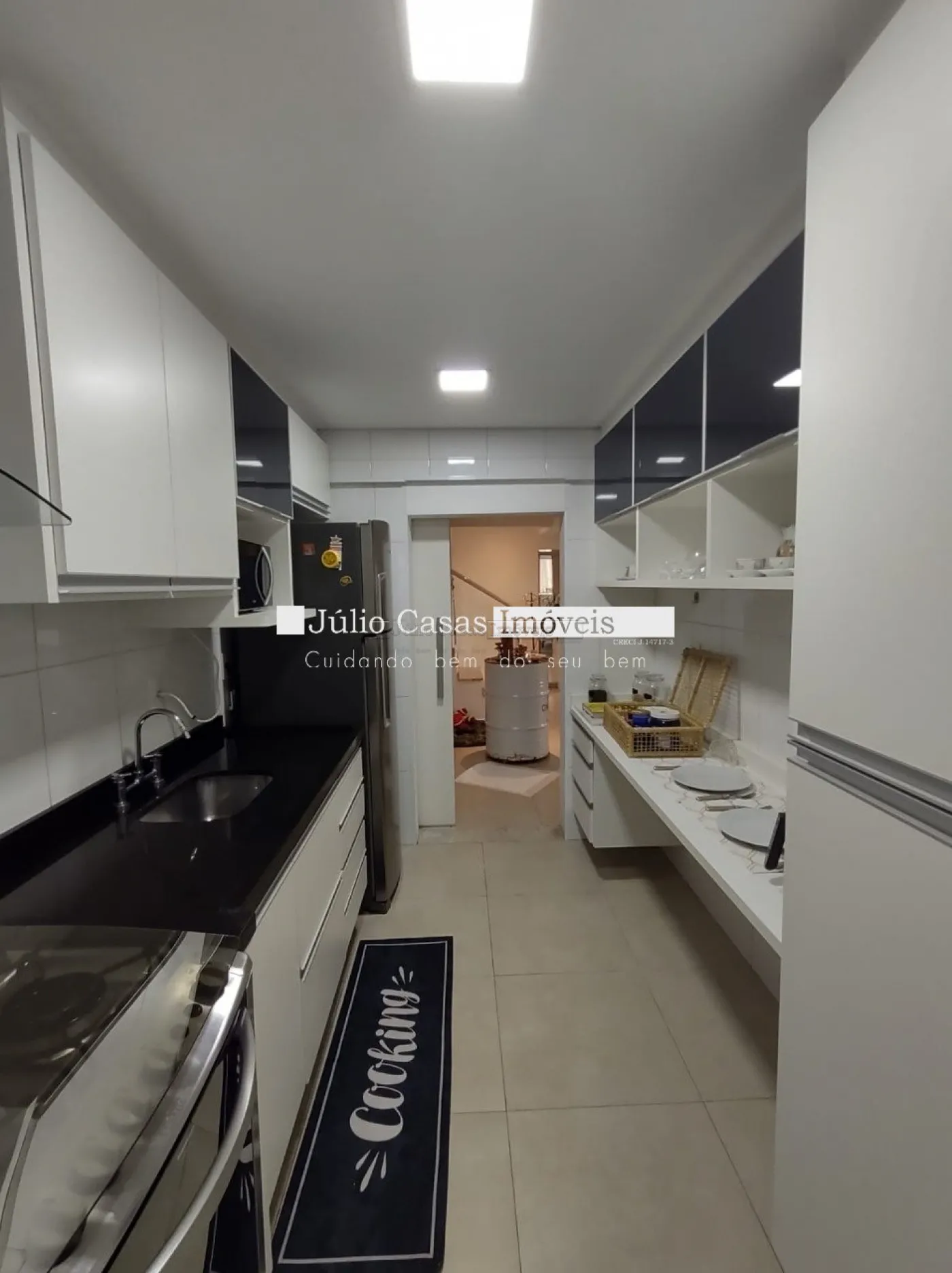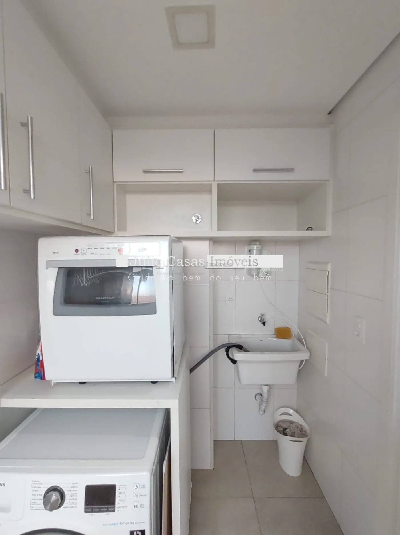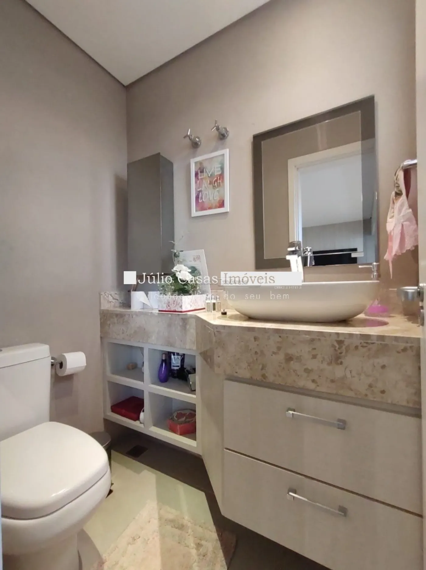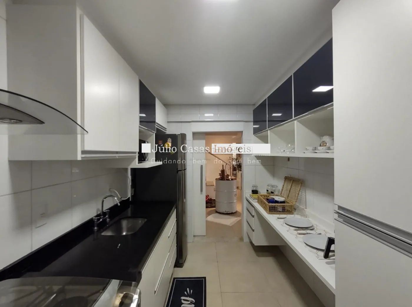 A área de serviço, também equipada com módulos planejados, oferece praticidade. O lavabo destaca-se pela pia em mármore travertino e gabinete.