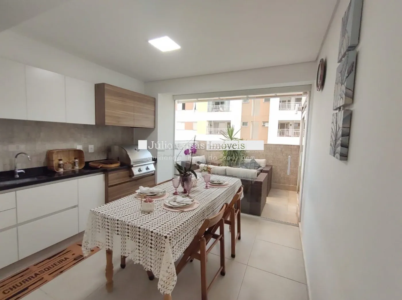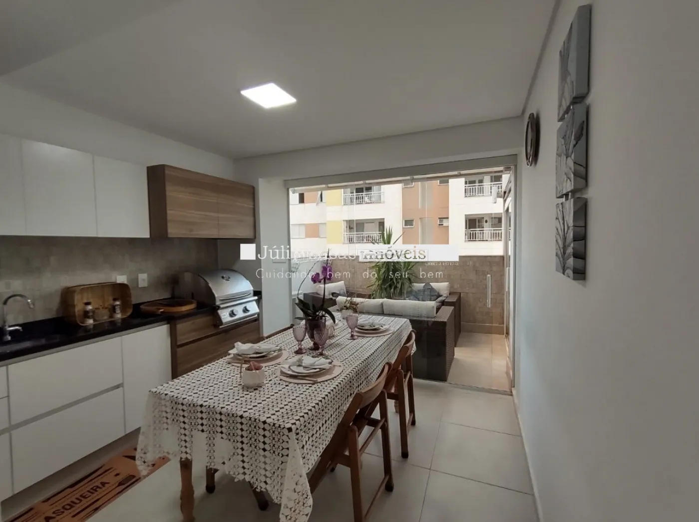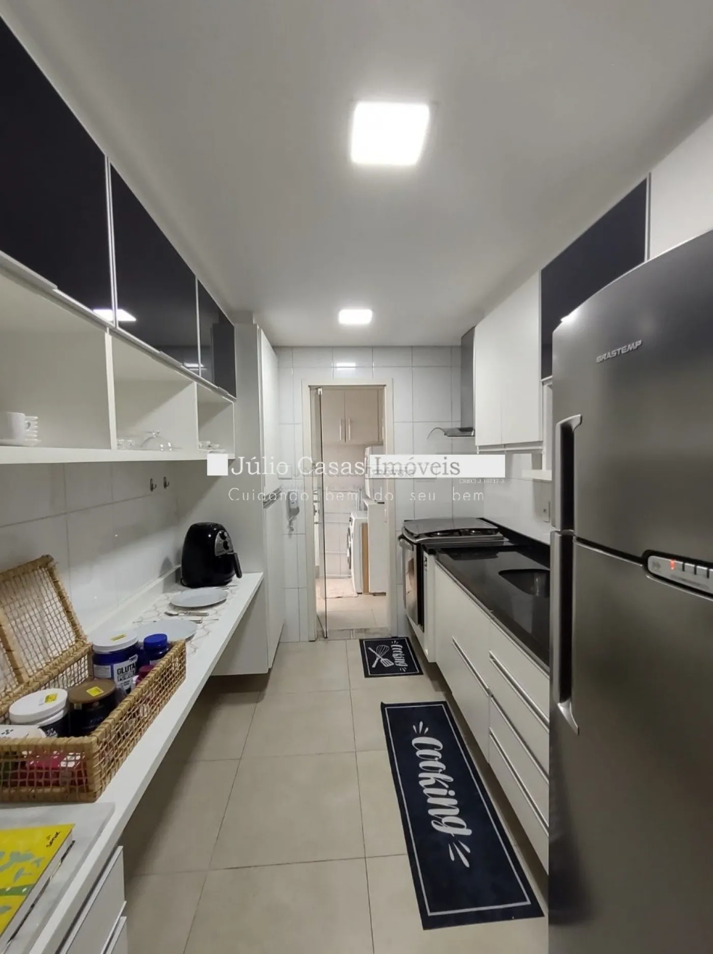 Este apartamento conta com uma elegante sala de dois ambientes, revestida em porcelanato, que se integra perfeitamente a um painel com rack para TV. A cozinha é totalmente modulada, com pia em granito, proporcionando funcionalidade e estilo.