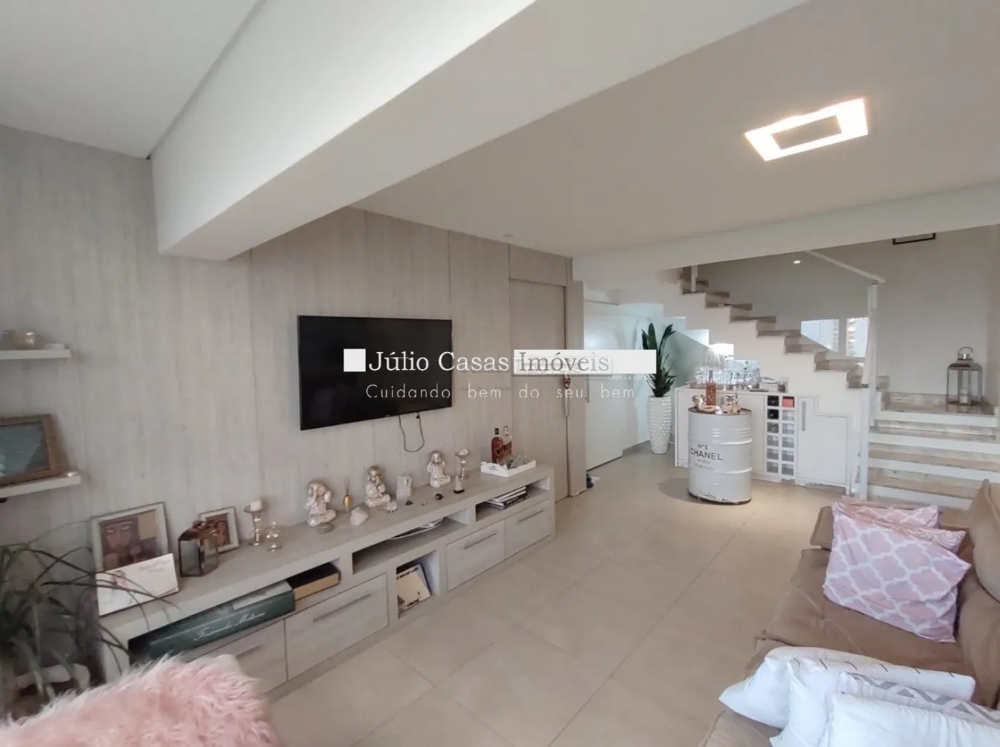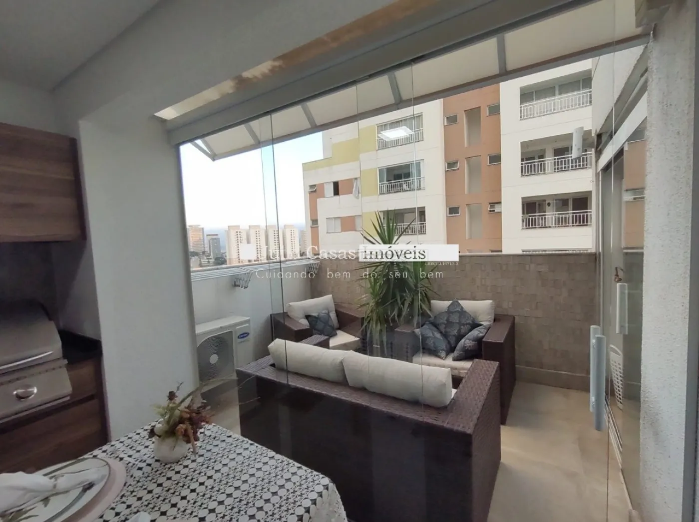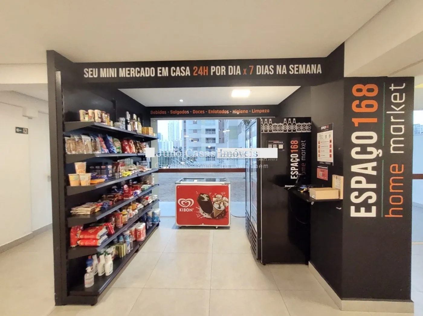 Este apartamento conta com uma elegante sala de dois ambientes, revestida em porcelanato, que se integra perfeitamente a um painel com rack para TV. A cozinha é totalmente modulada, com pia em granito, proporcionando funcionalidade e estilo.