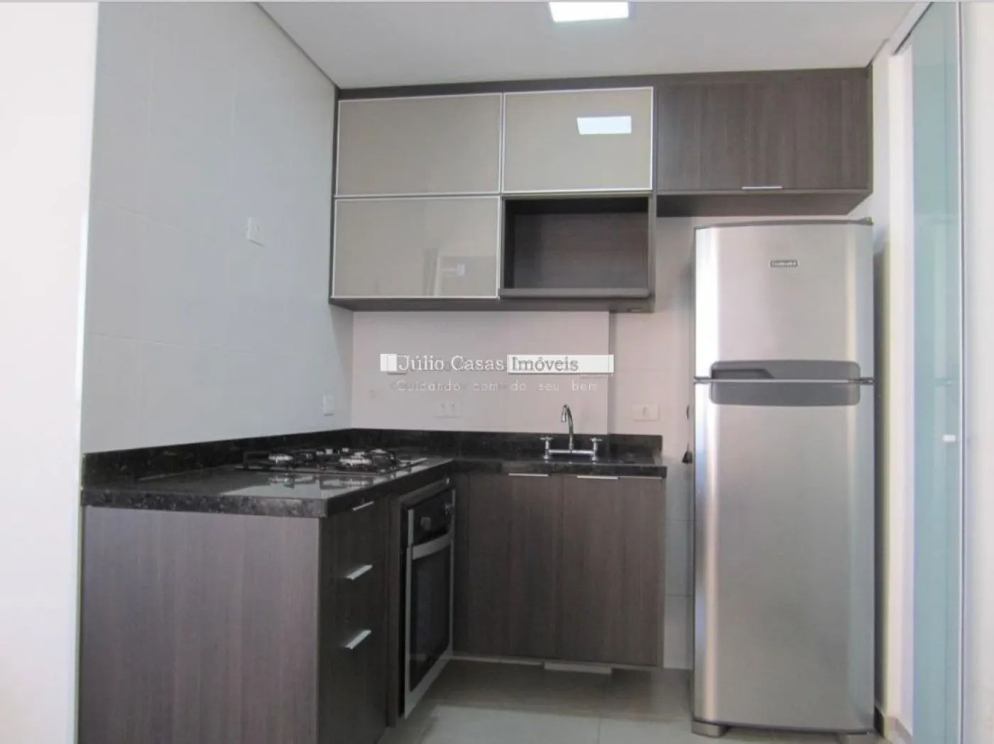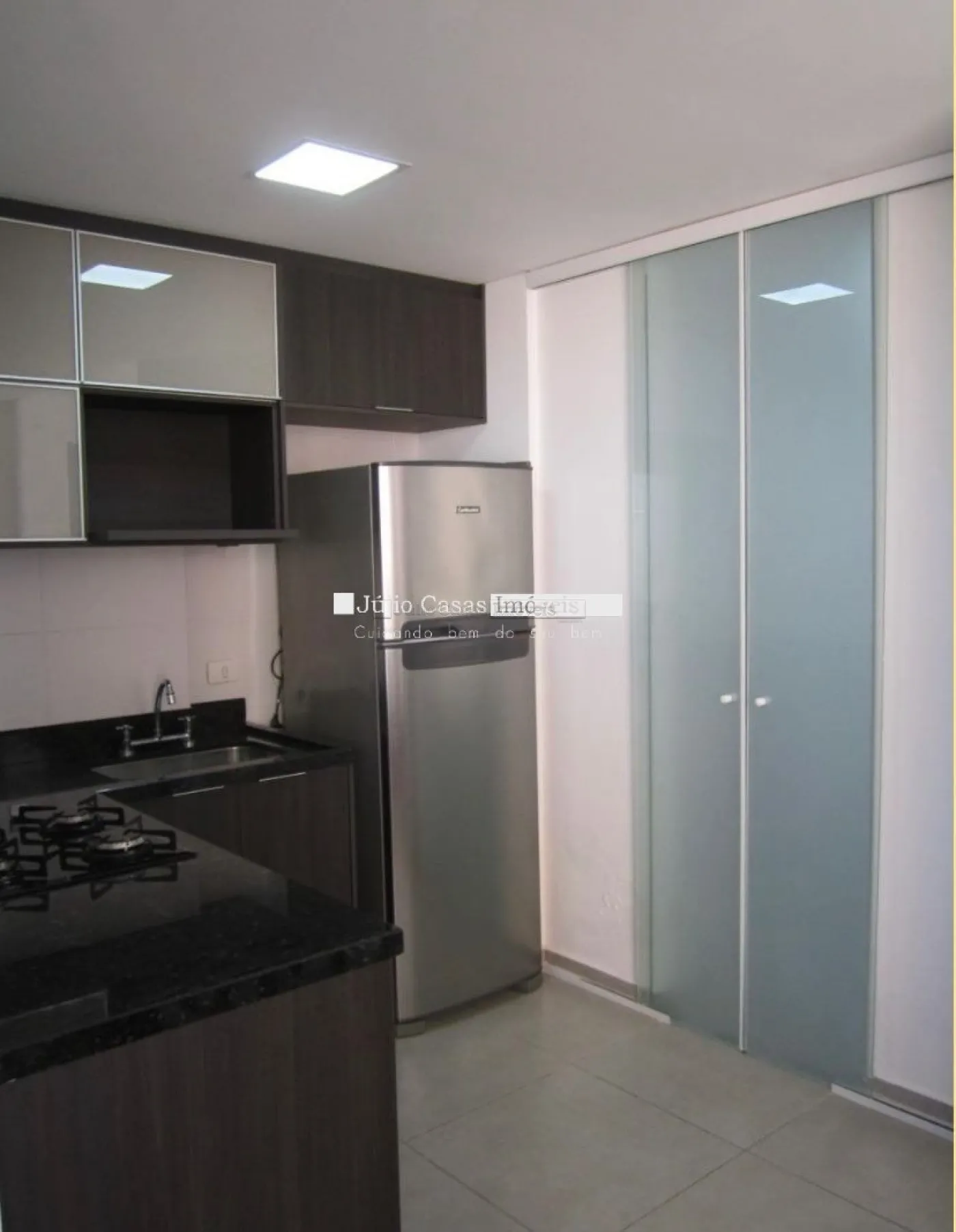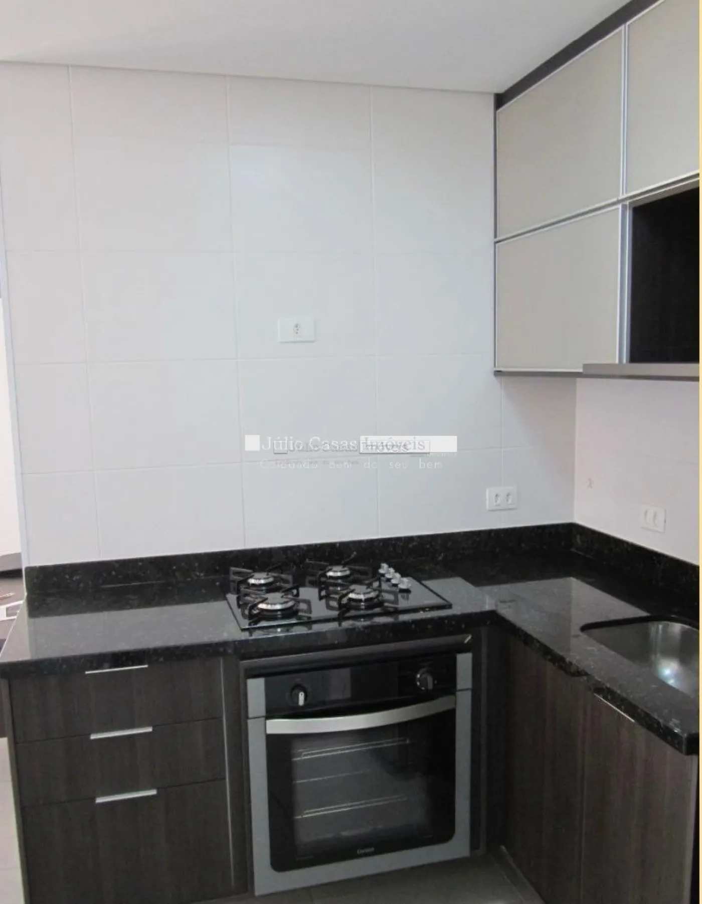 Apartamento mobiliado, cozinha com armários, fogão, forno e geladeira.