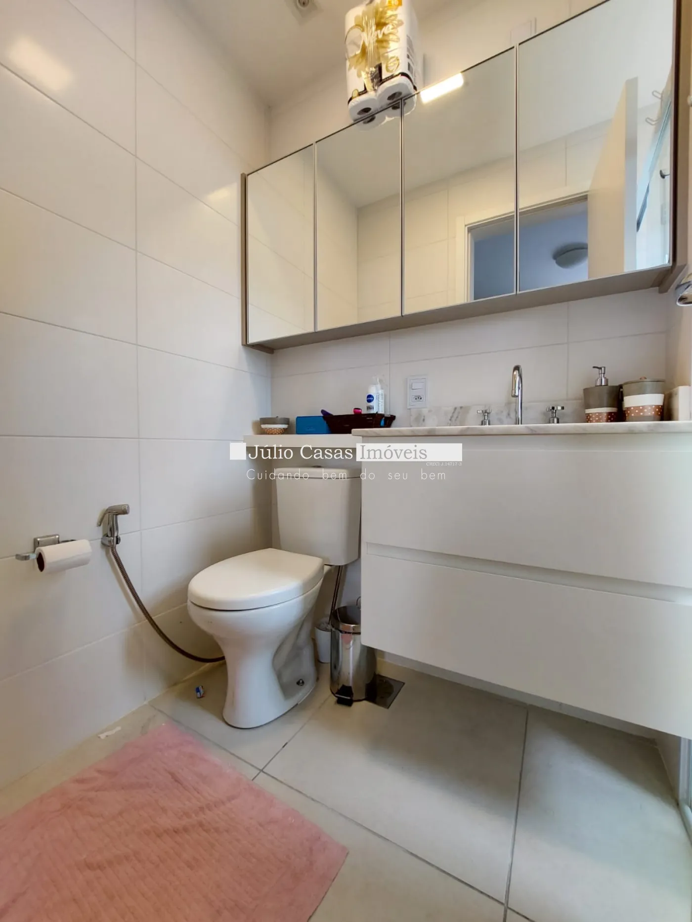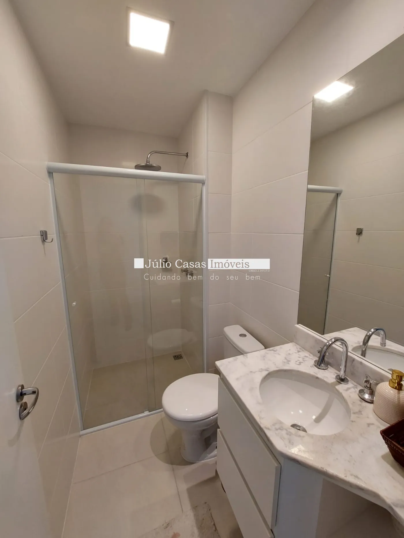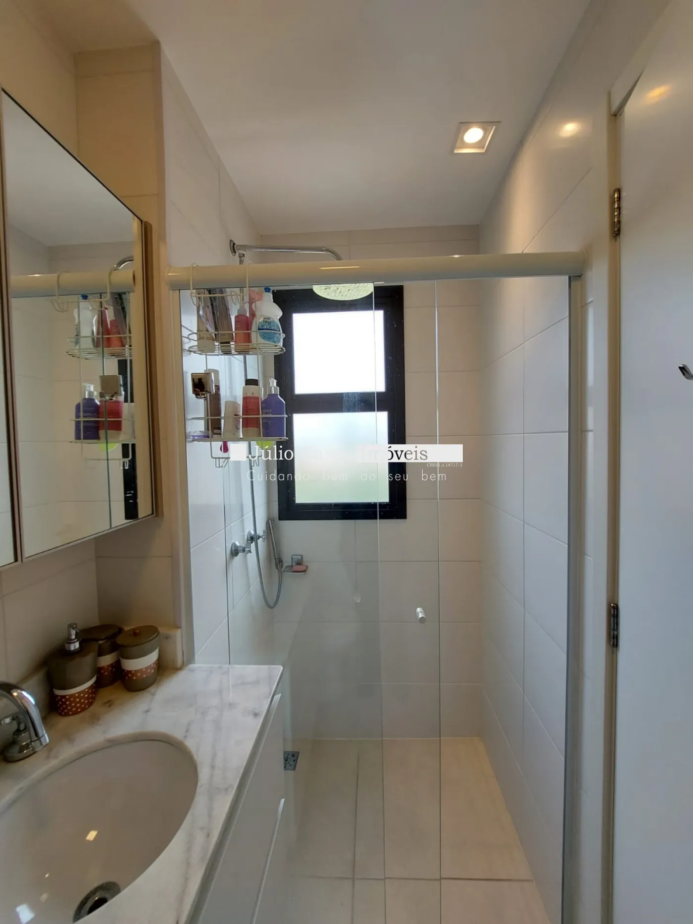 Possui 2 quartos modulados, sendo 1 suíte equipada com ar-condicionado. Os banheiros são modernos, com box em vidro e gabinetes.