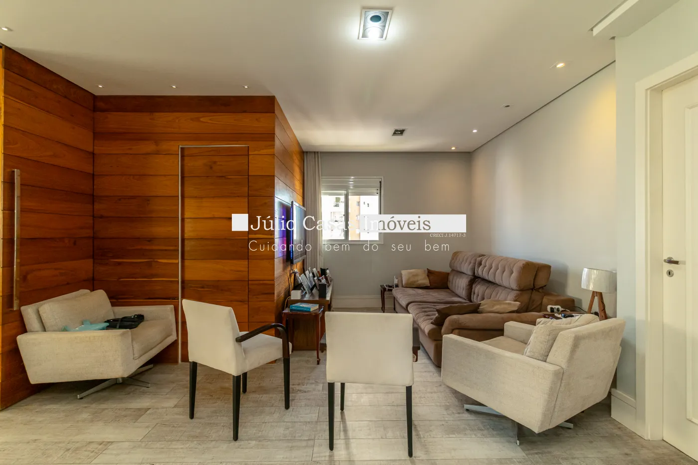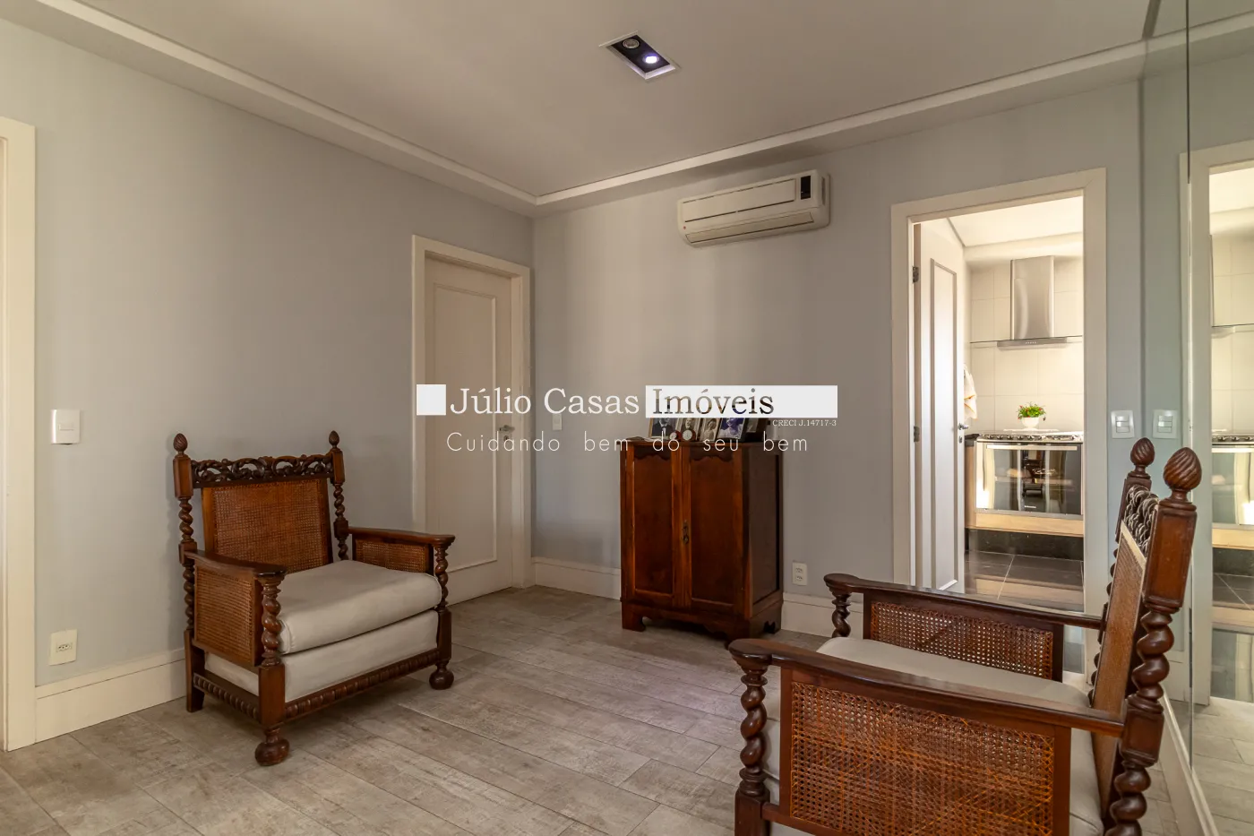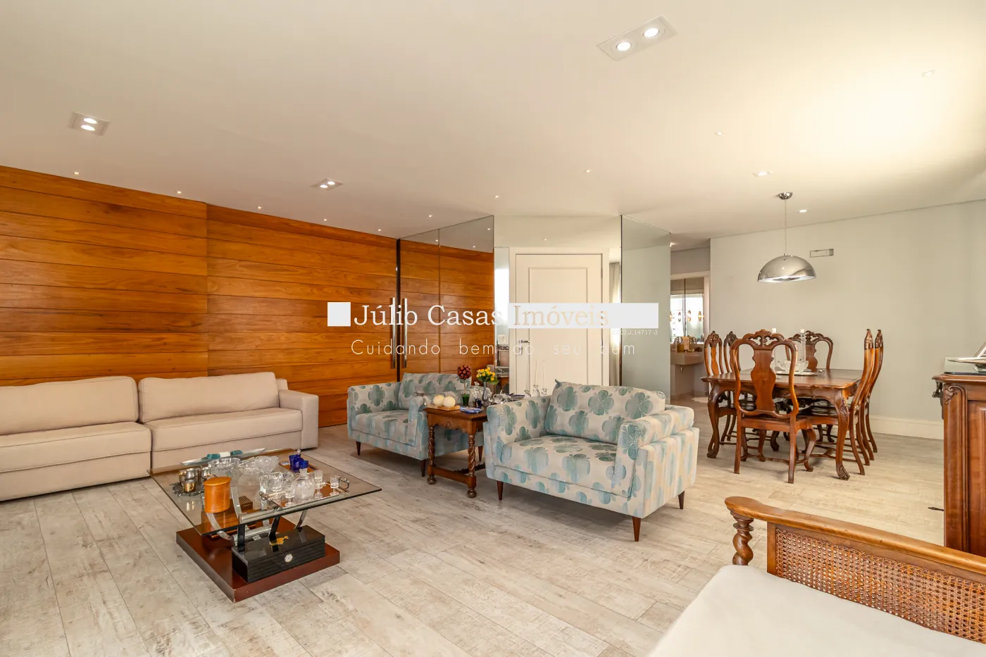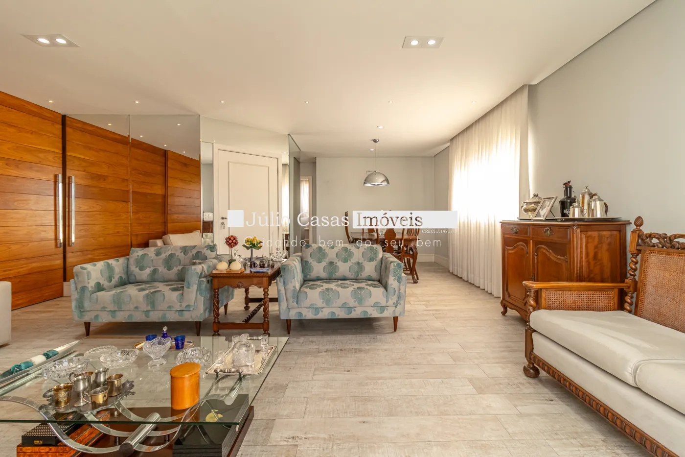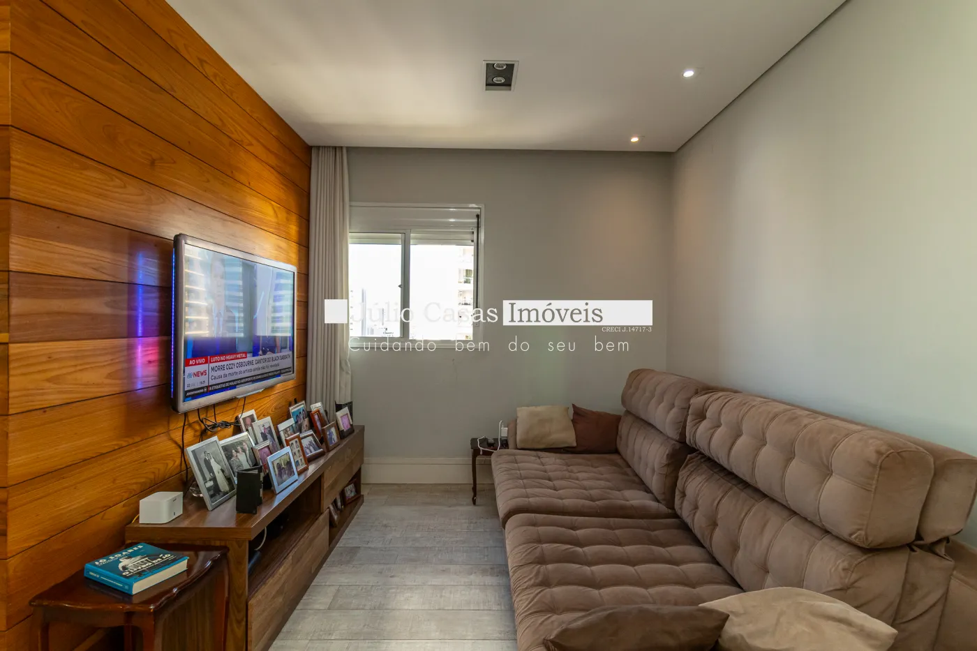 A sala conta com três ambientes definidos: sala de estar, de jantar e de TV, eis que 01 suíte foi transformada em sala de TV, preservando-se o banheiro anexo, que foram revestidos por painel de madeira e por porta de correr de madeira. Salas com teto rebaixado e com iluminação embutida. O piso da sala e dormitórios é de porcelanato, que corresponde a contornos de madeiras, porém de diferentes tons, já o piso dos quartos são madeira originais disparquet. Na suíte master é possível desfrutar de total claridade da luz do sol, quando desejar, pois há uma janela guarda corpo de vidros conjugada com janelas do tipo basculantes.