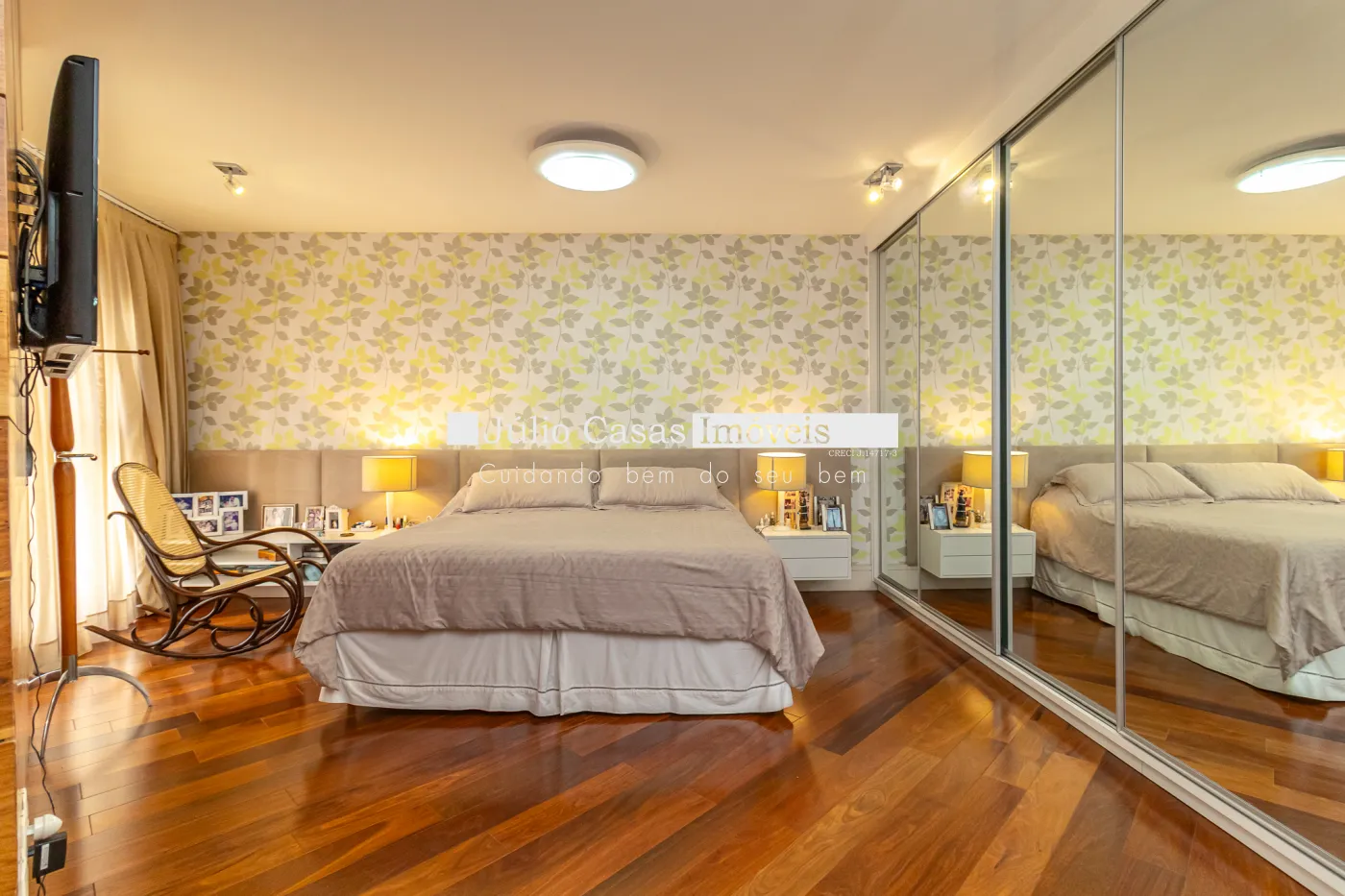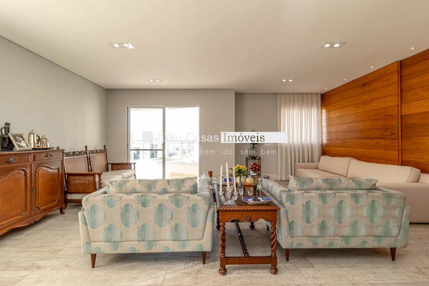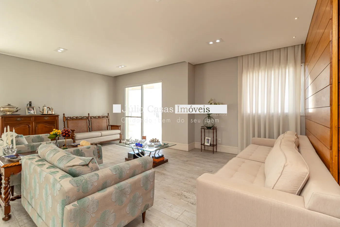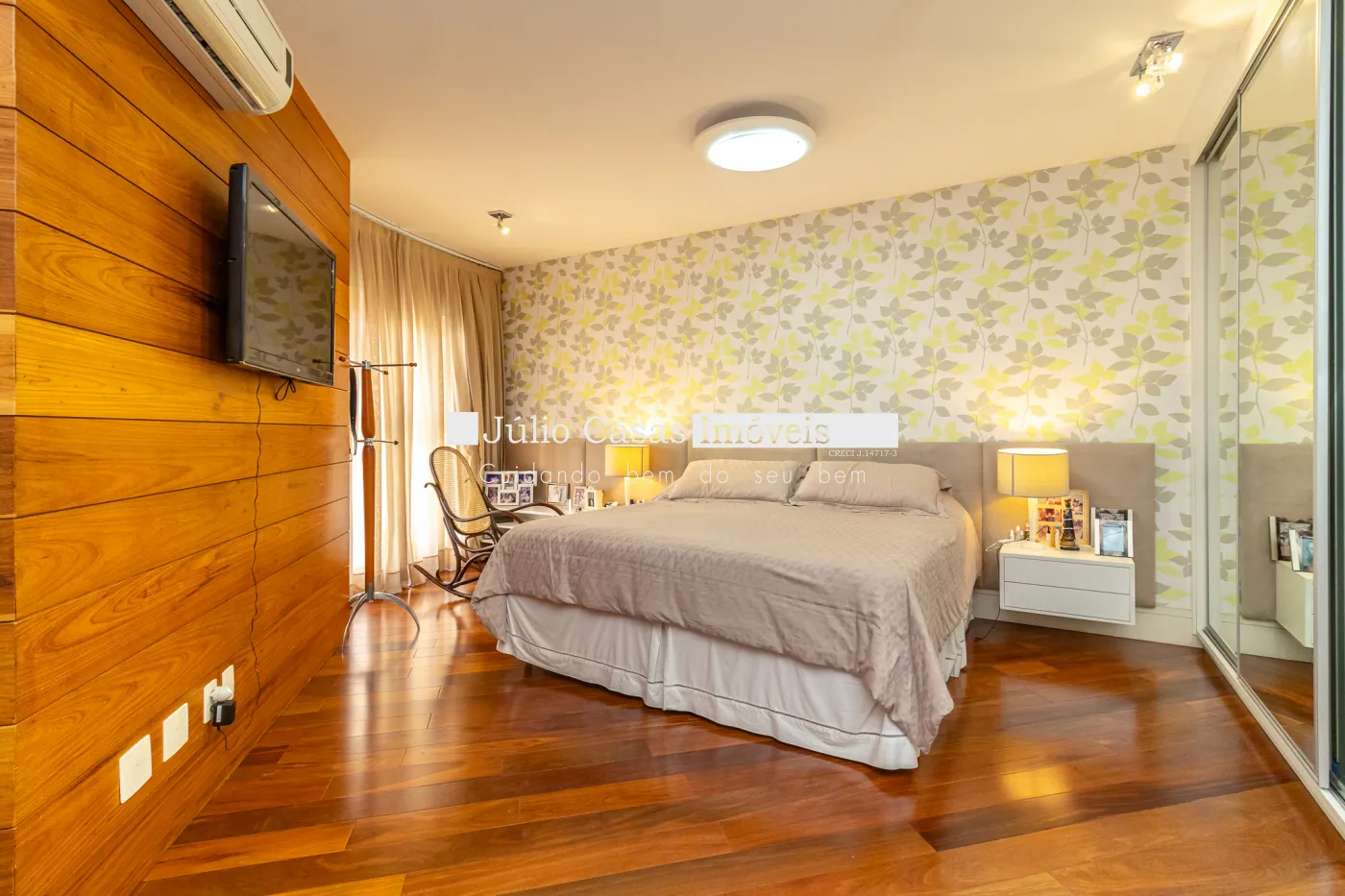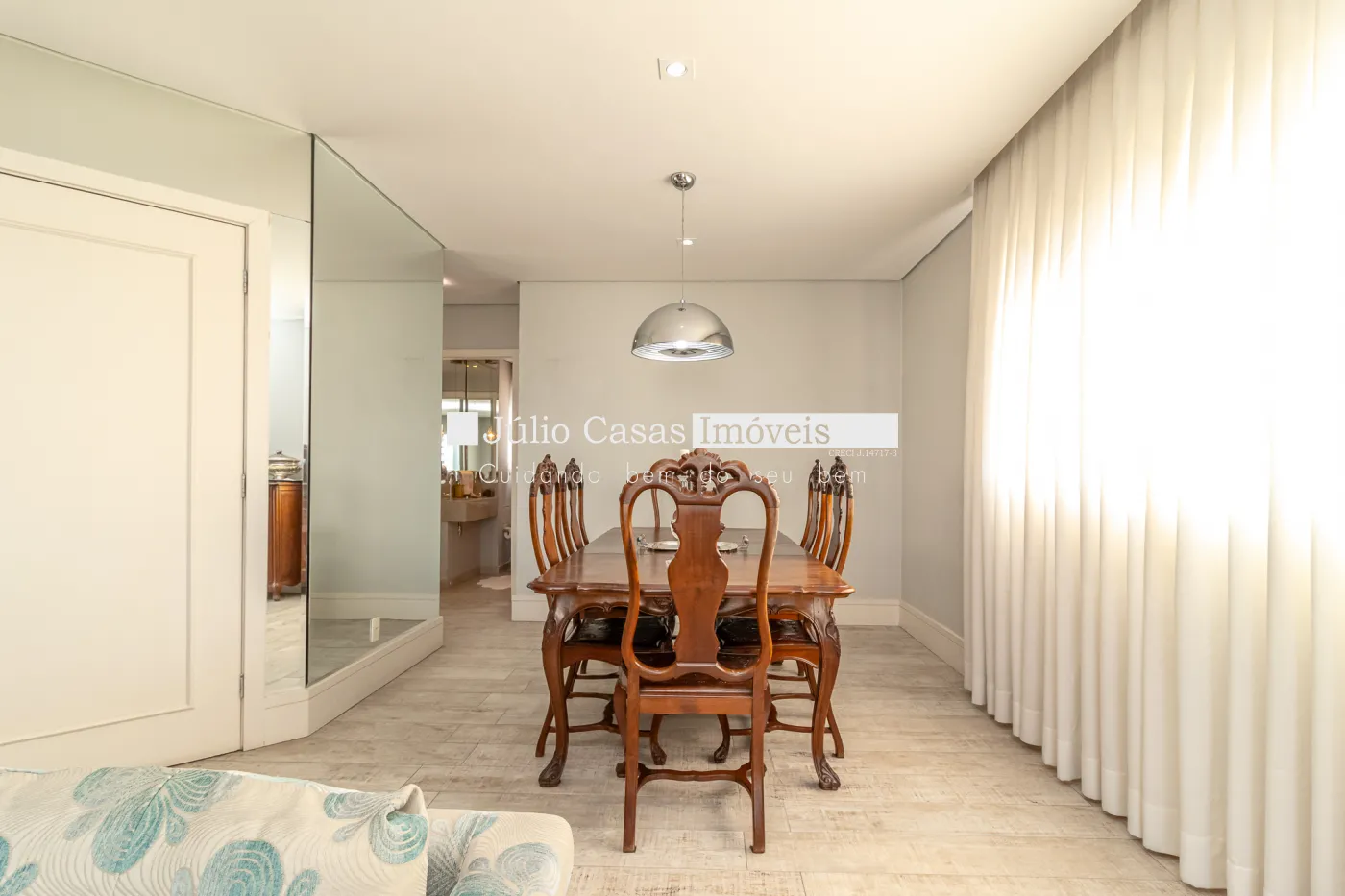A sala conta com três ambientes definidos: sala de estar, de jantar e de TV, eis que 01 suíte foi transformada em sala de TV, preservando-se o banheiro anexo, que foram revestidos por painel de madeira e por porta de correr de madeira. Salas com teto rebaixado e com iluminação embutida. O piso da sala e dormitórios é de porcelanato, que corresponde a contornos de madeiras, porém de diferentes tons, já o piso dos quartos são madeira originais disparquet. Na suíte master é possível desfrutar de total claridade da luz do sol, quando desejar, pois há uma janela guarda corpo de vidros conjugada com janelas do tipo basculantes.