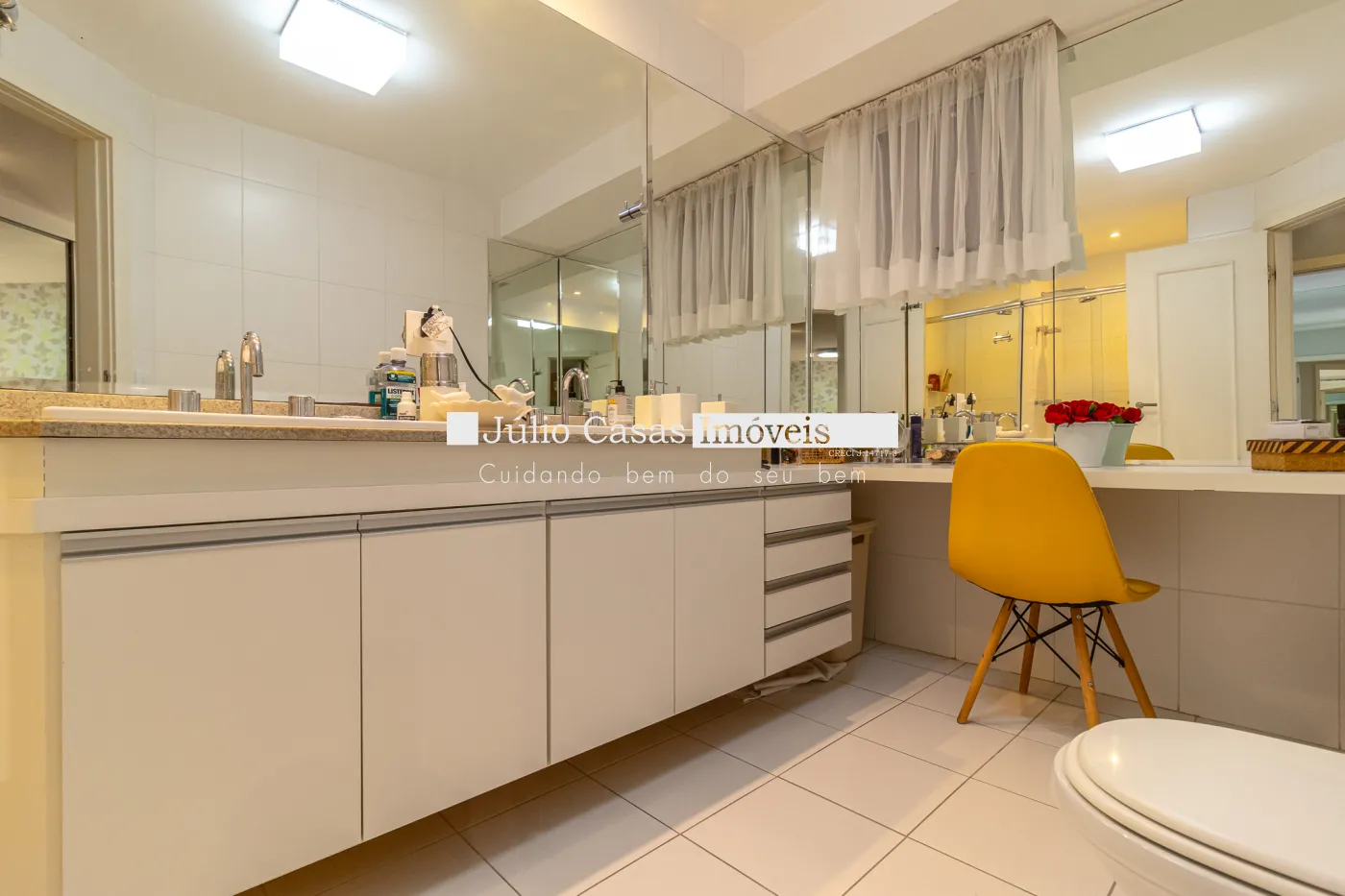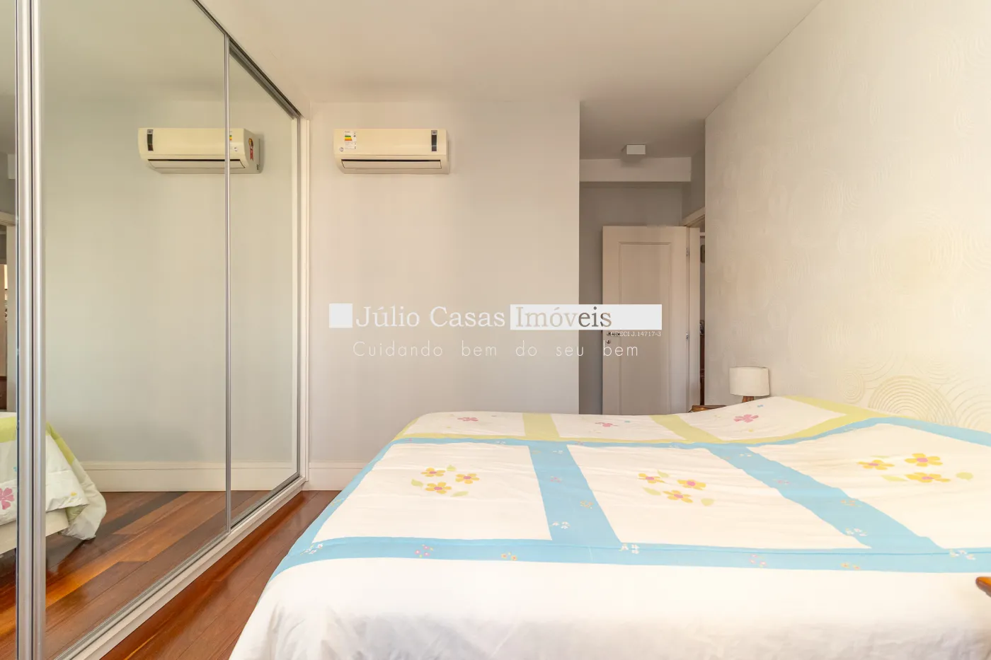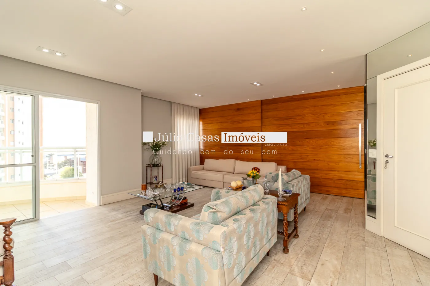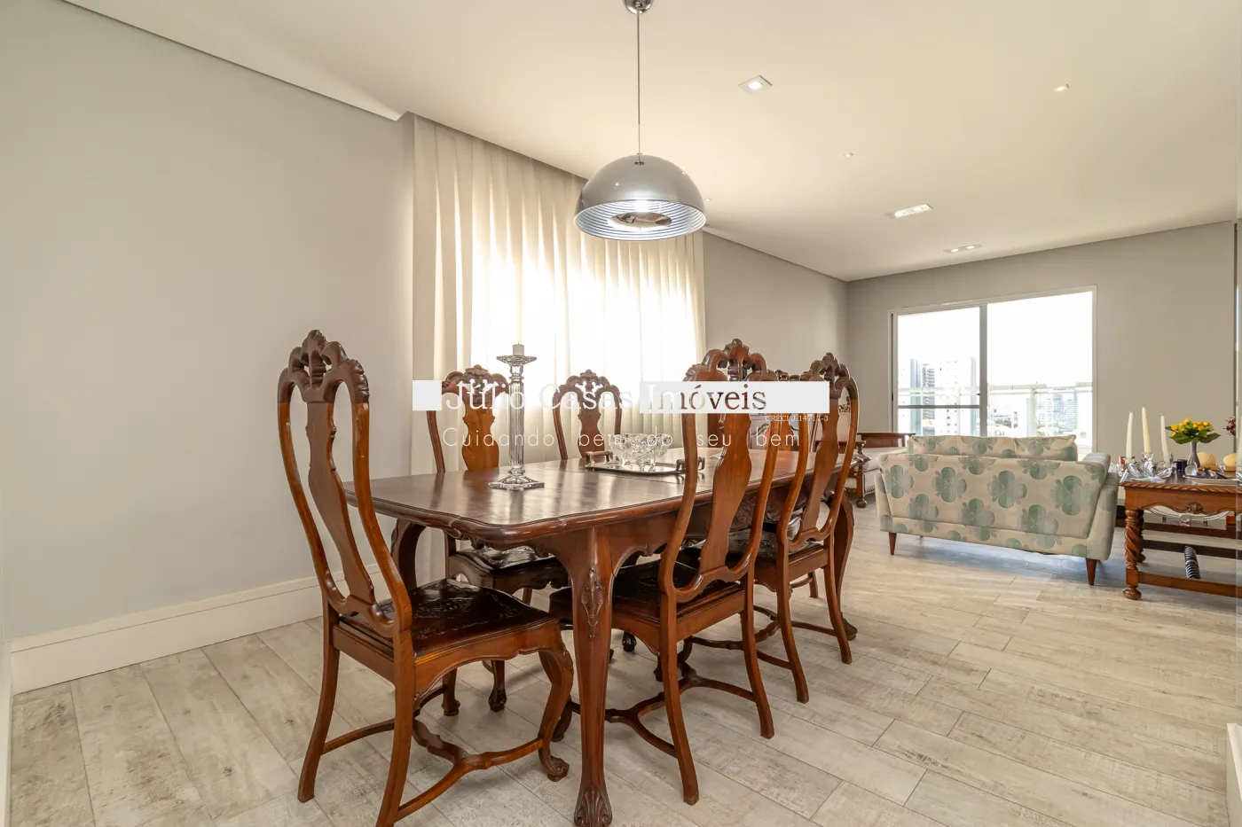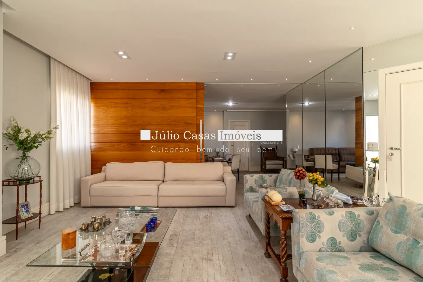 A sala conta com três ambientes definidos: sala de estar, de jantar e de TV, eis que 01 suíte foi transformada em sala de TV, preservando-se o banheiro anexo, que foram revestidos por painel de madeira e por porta de correr de madeira. Salas com teto rebaixado e com iluminação embutida. O piso da sala e dormitórios é de porcelanato, que corresponde a contornos de madeiras, porém de diferentes tons, já o piso dos quartos são madeira originais disparquet. Na suíte master é possível desfrutar de total claridade da luz do sol, quando desejar, pois há uma janela guarda corpo de vidros conjugada com janelas do tipo basculantes.