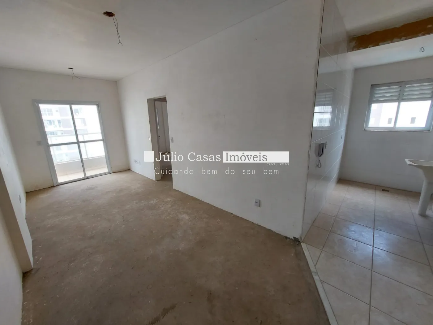 Sala ampla com sacada, wc, cozinha e 2 quarto, ambientes frios em piso e quarto e sala no contrapiso.