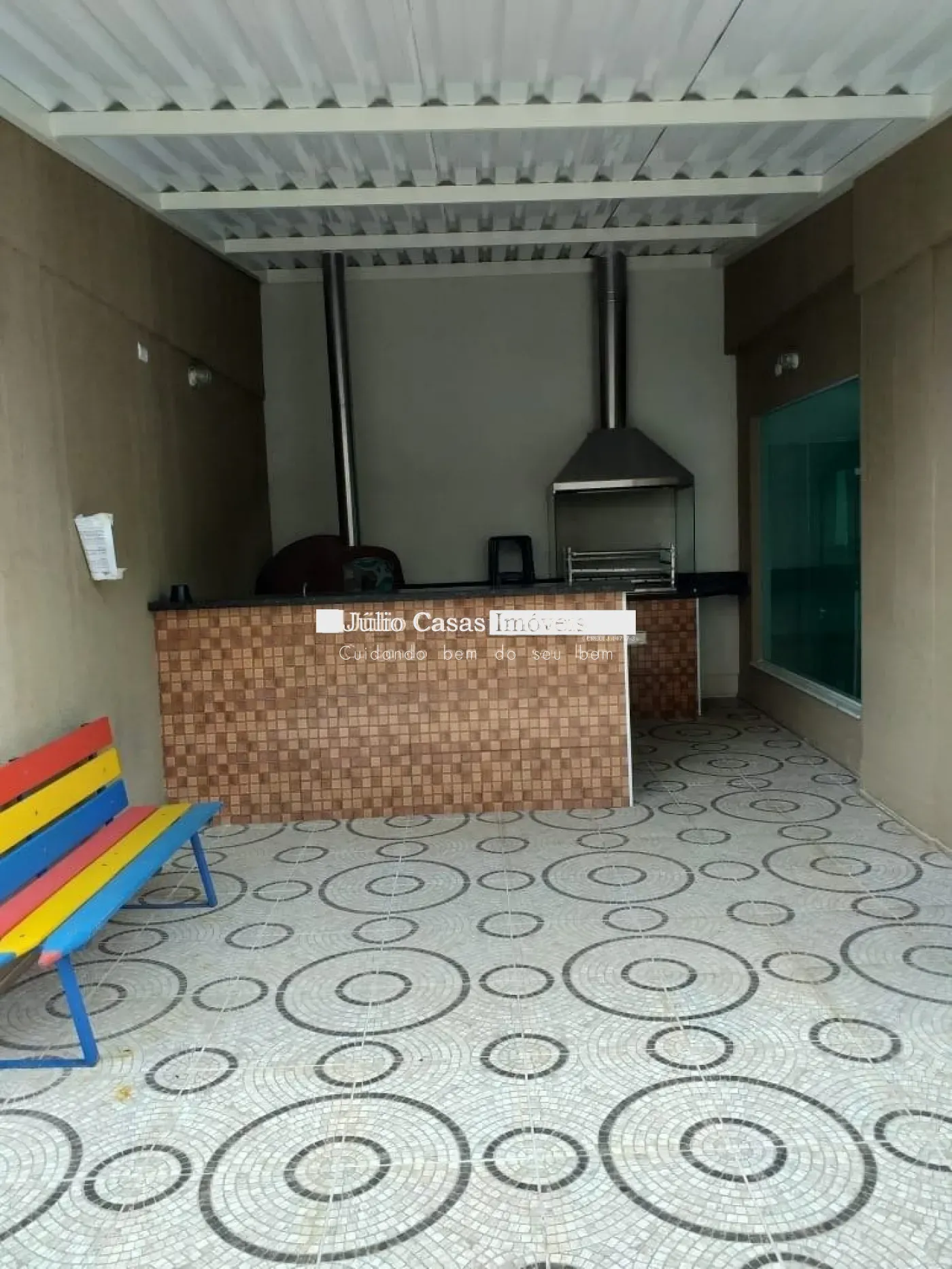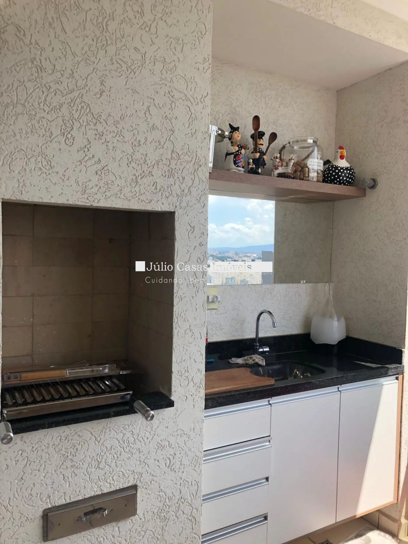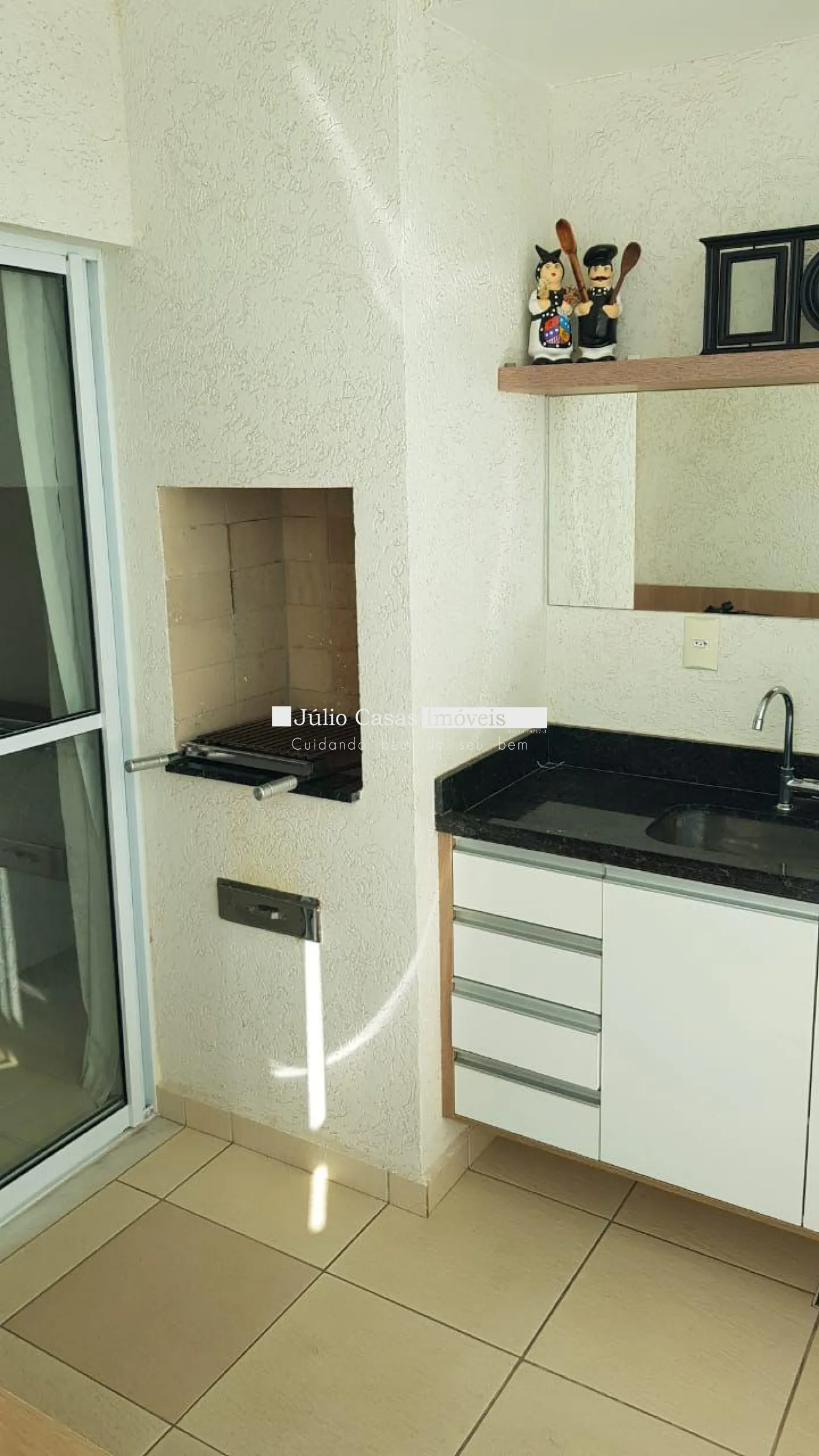 Sala 2 ambientes, varanda gourmet com churrasqueira e pia de apoio com fechamento em vidro.