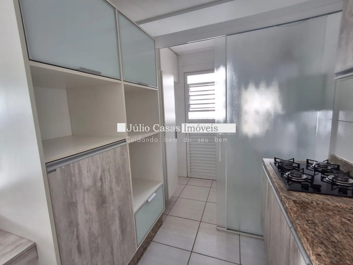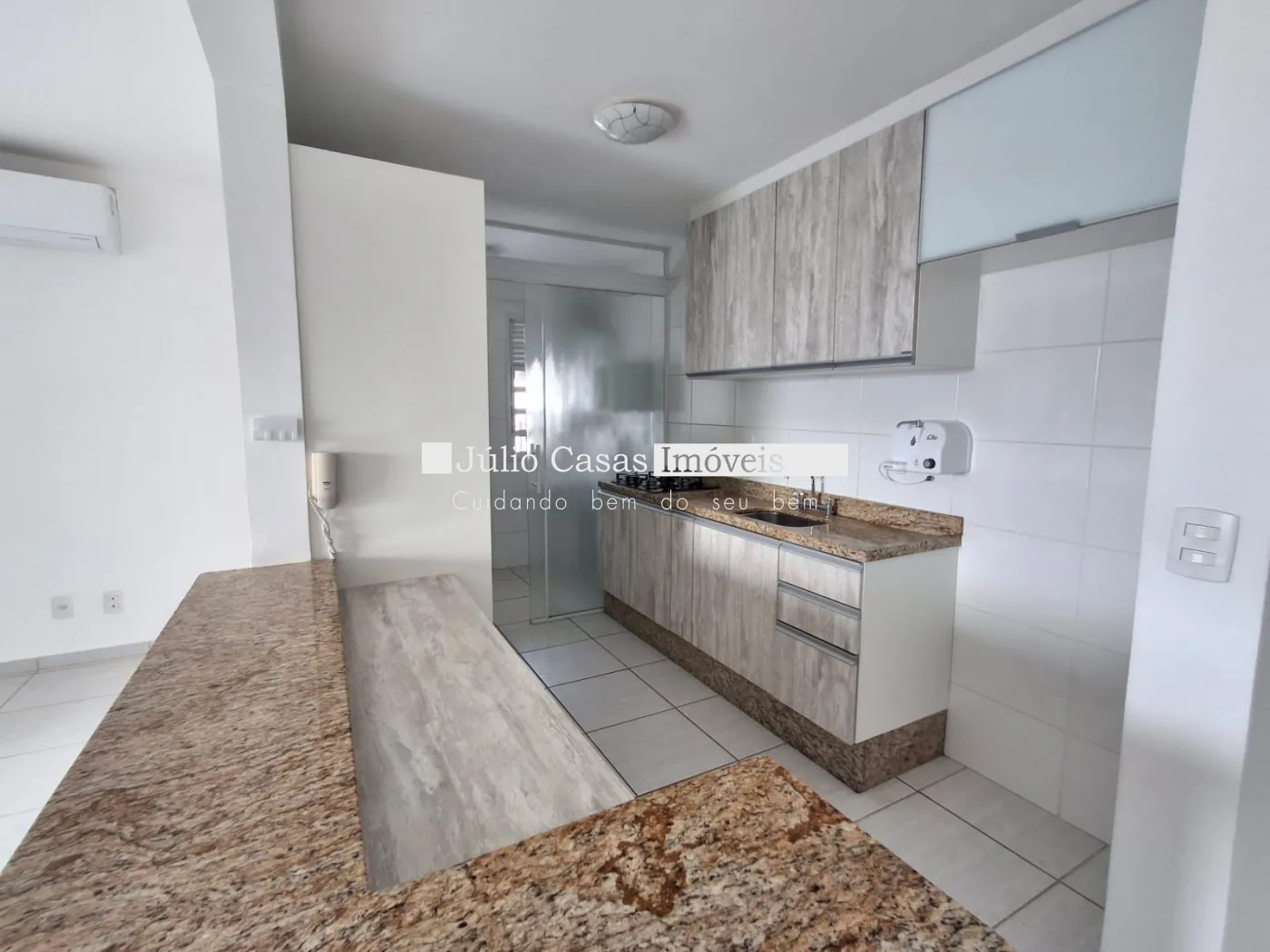 Apartamento de 89 m² em excelente estado, cozinha com bancada, mesa, pia em mármore, filtro purificador de água, armários embutidos e fogão cooktop.