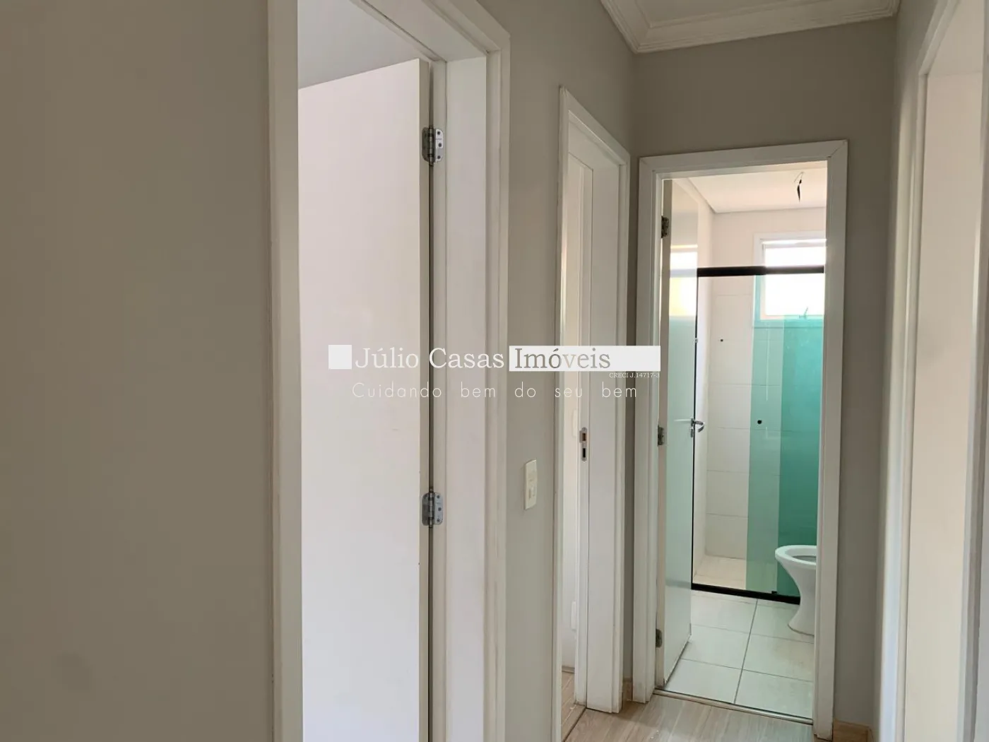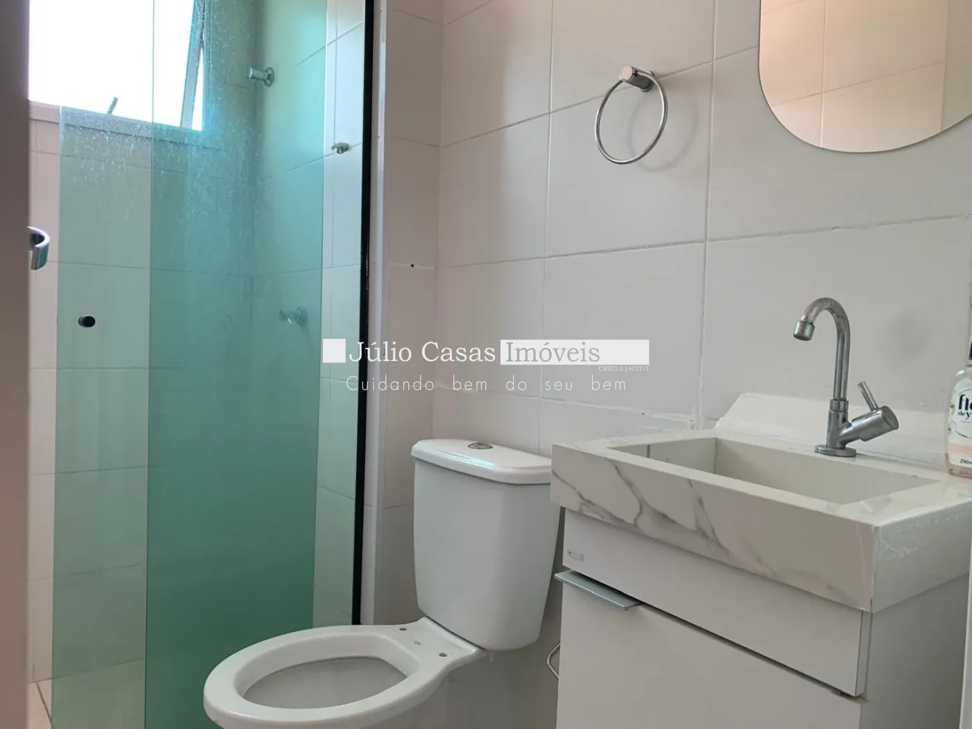 - Banheiro com box em vidro e pia com armário