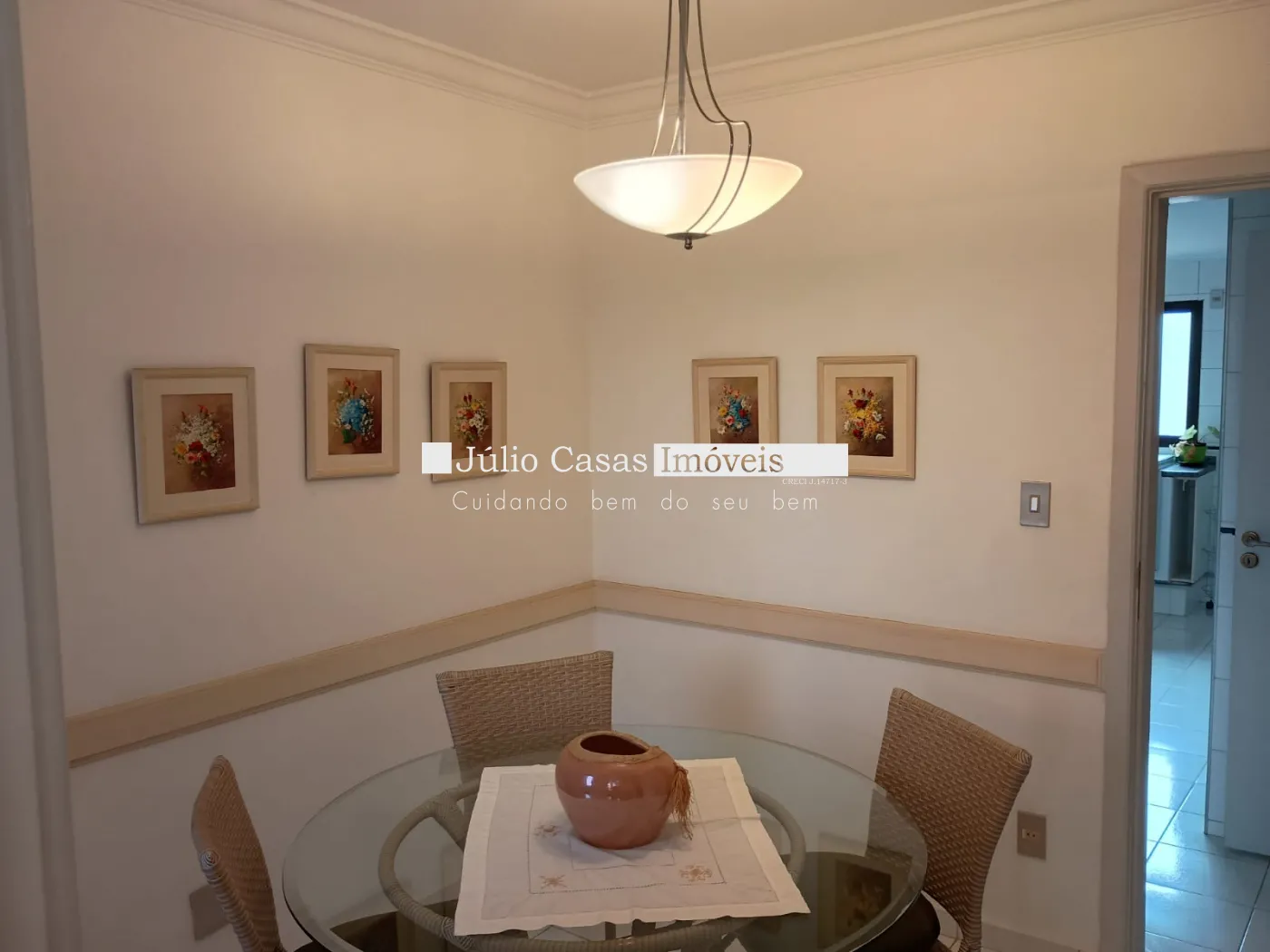 O apartamento conta com uma ampla sala de estar com porta balcão e sacada, salas de TV, jantar e almoço que se integram harmoniosamente. A cozinha, toda modulada, está conectada à área de serviço funcional, além de quarto e banheiro de empregada. São três dormitórios, sendo duas suítes, incluindo a master com banheira e closet. Há também um banheiro social, todos com aquecimento a gás.