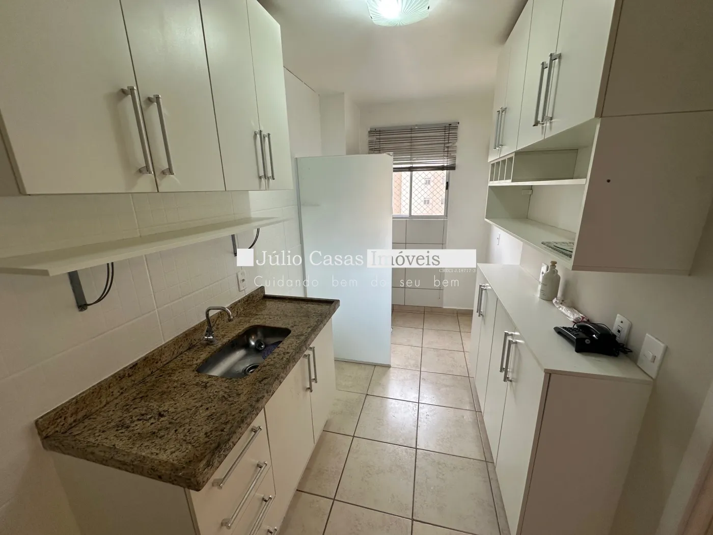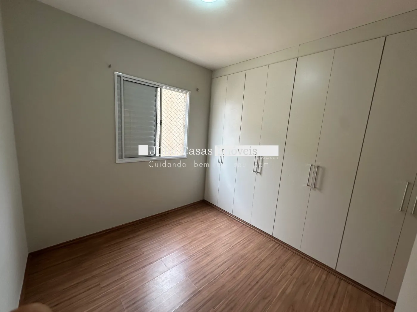 2 quartos em piso laminado, cozinha com armários e lavanderia.