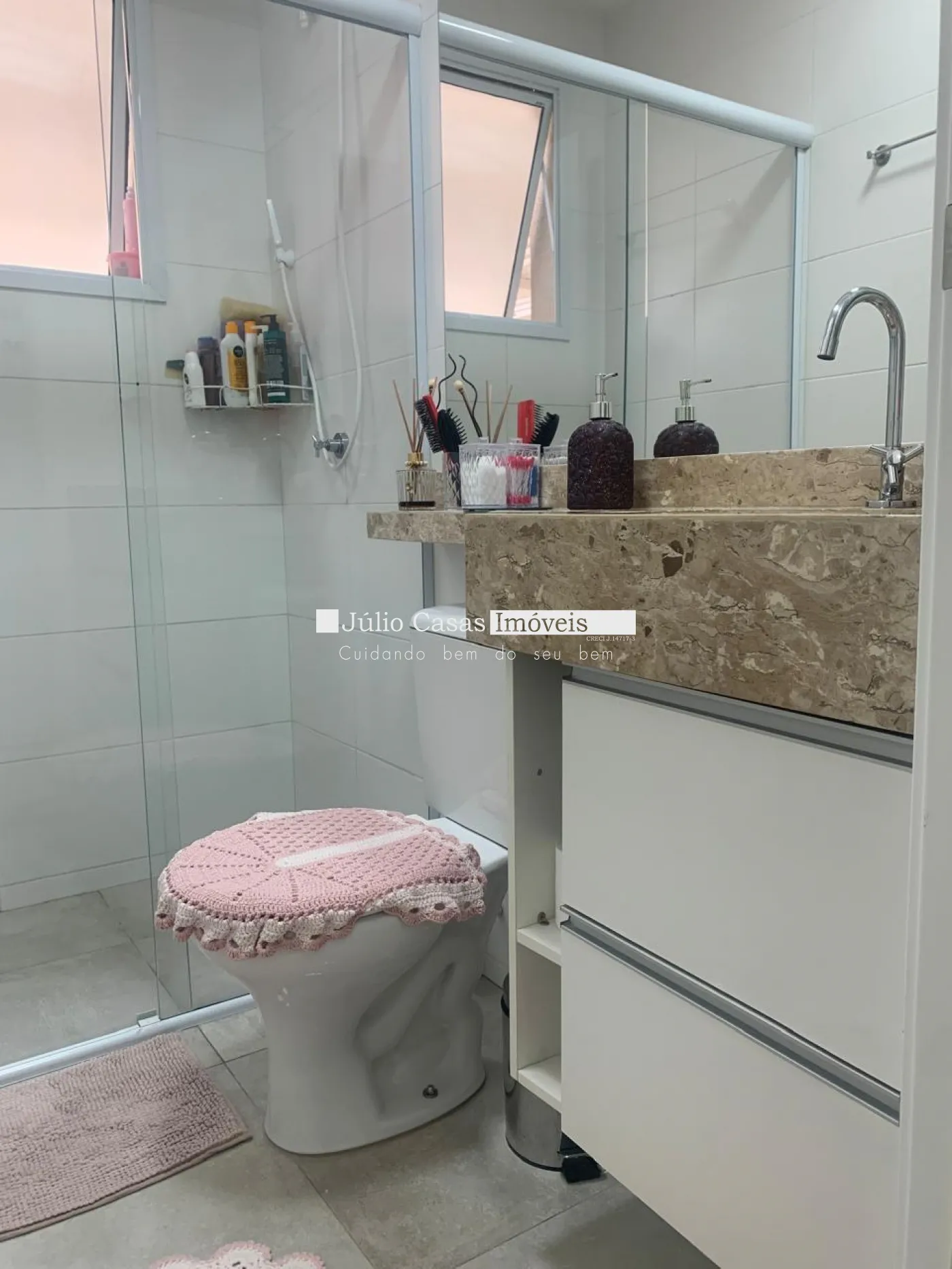 Banheiros com bancada em mármore e armários