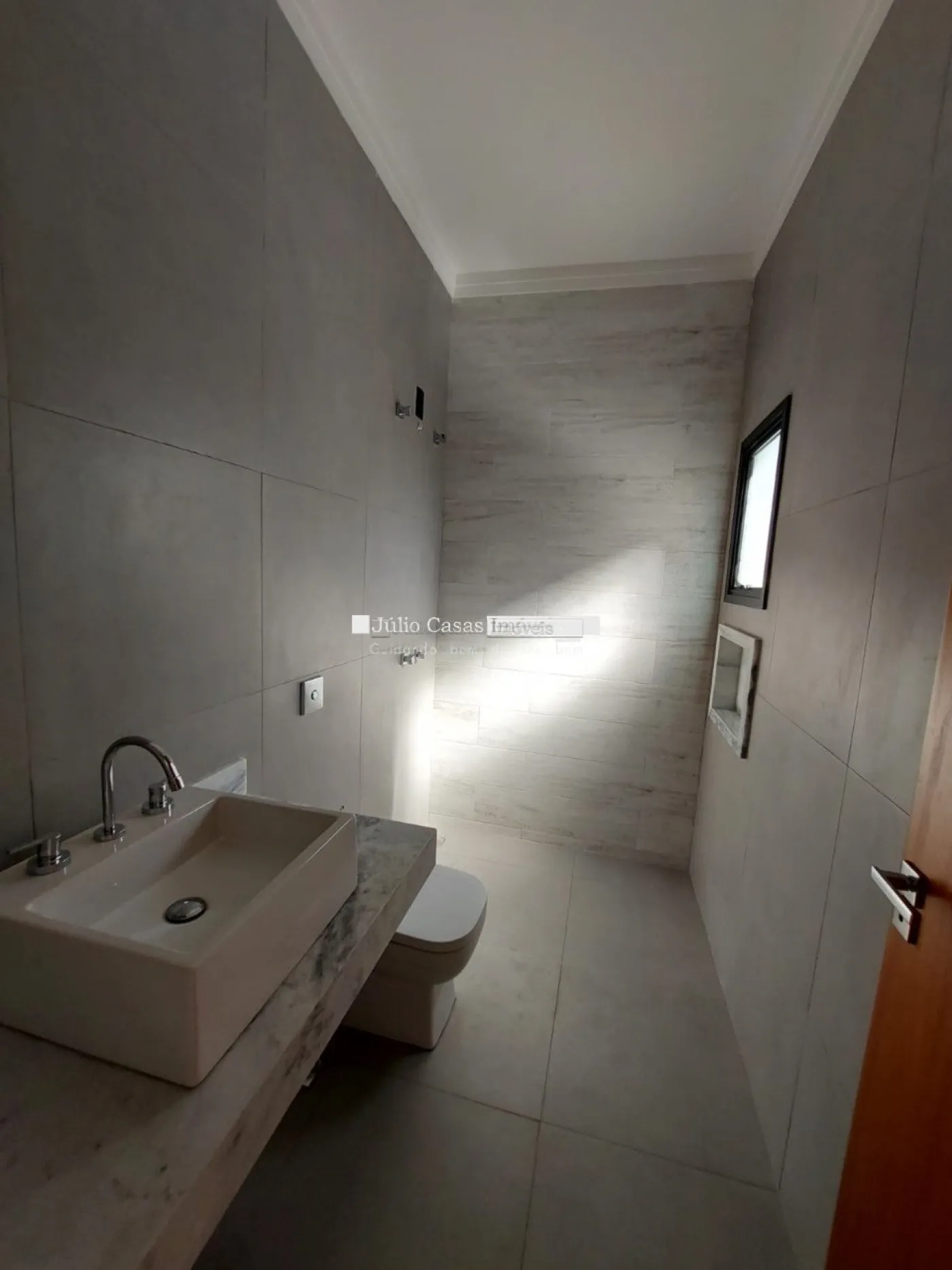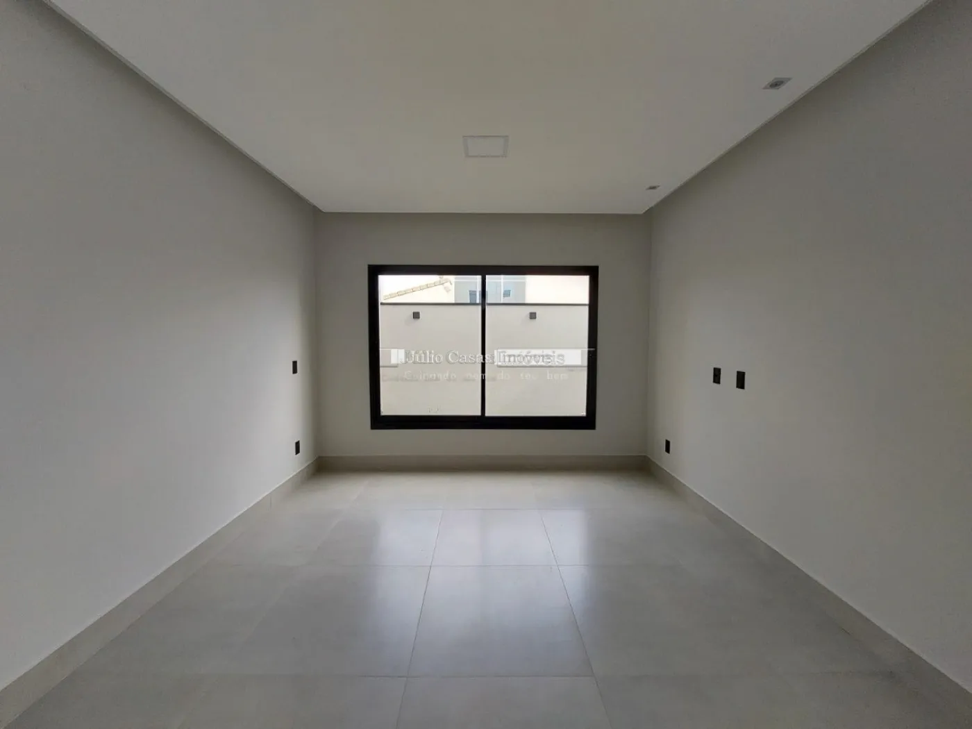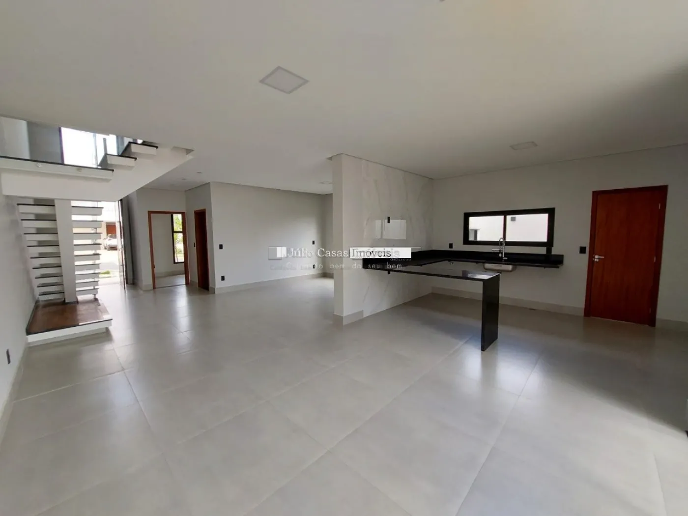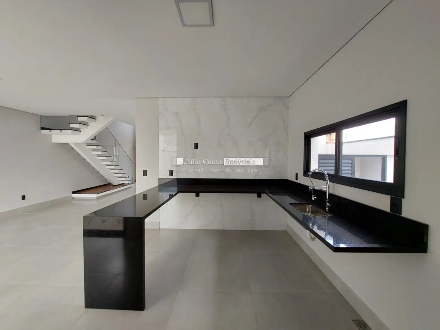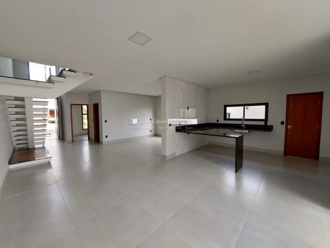 Casa estilo sobrado com design moderno e sofisticado. O imóvel possui uma sala de estar ampla com dois ambientes e pé-direito duplo, proporcionando um espaço arejado e iluminado. Há um lavabo de fácil acesso.