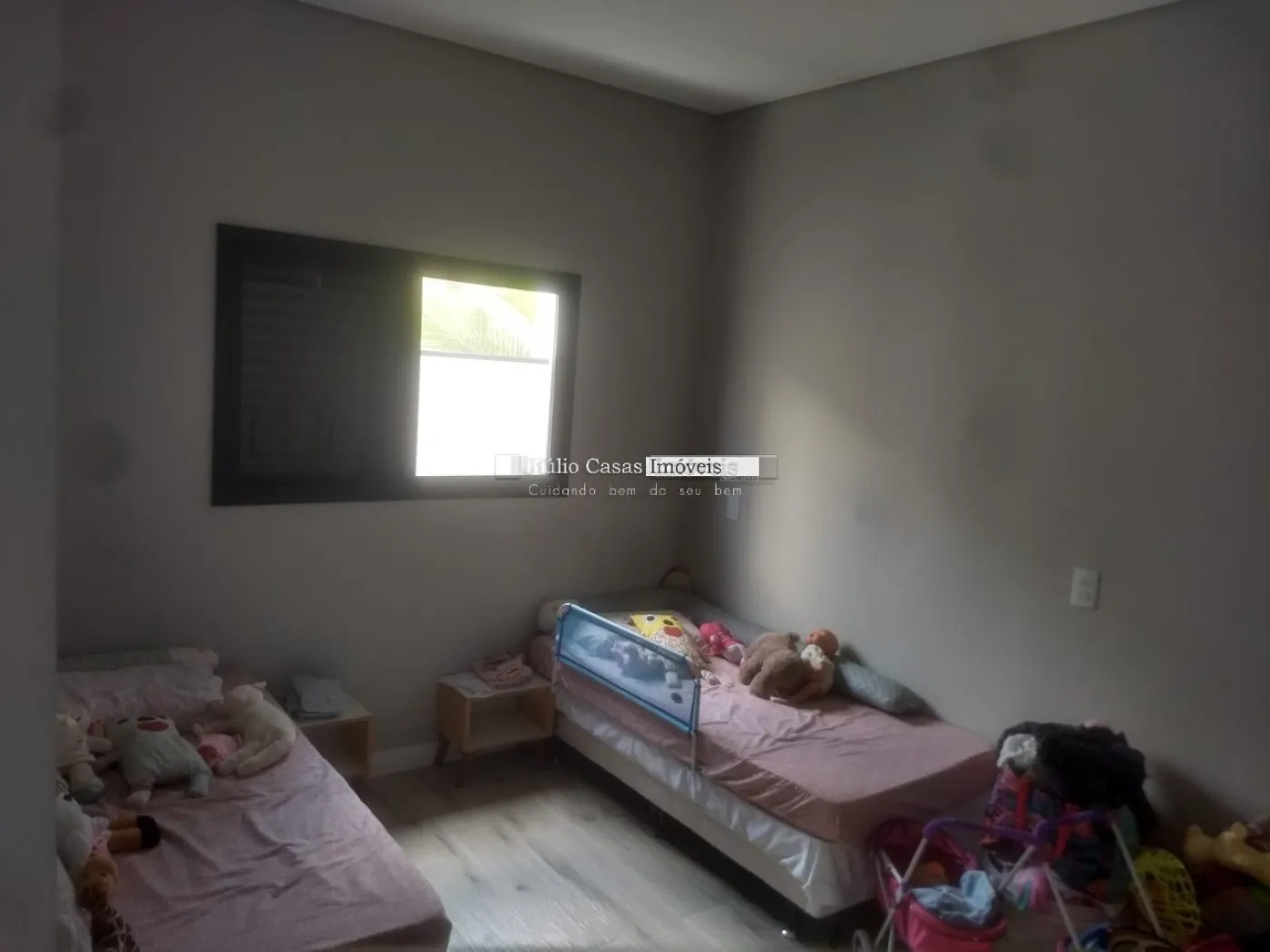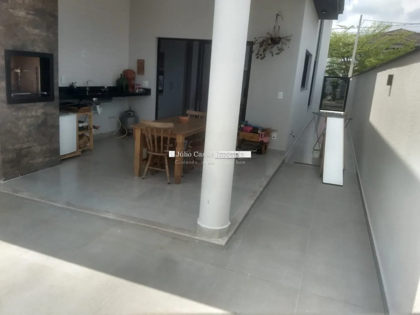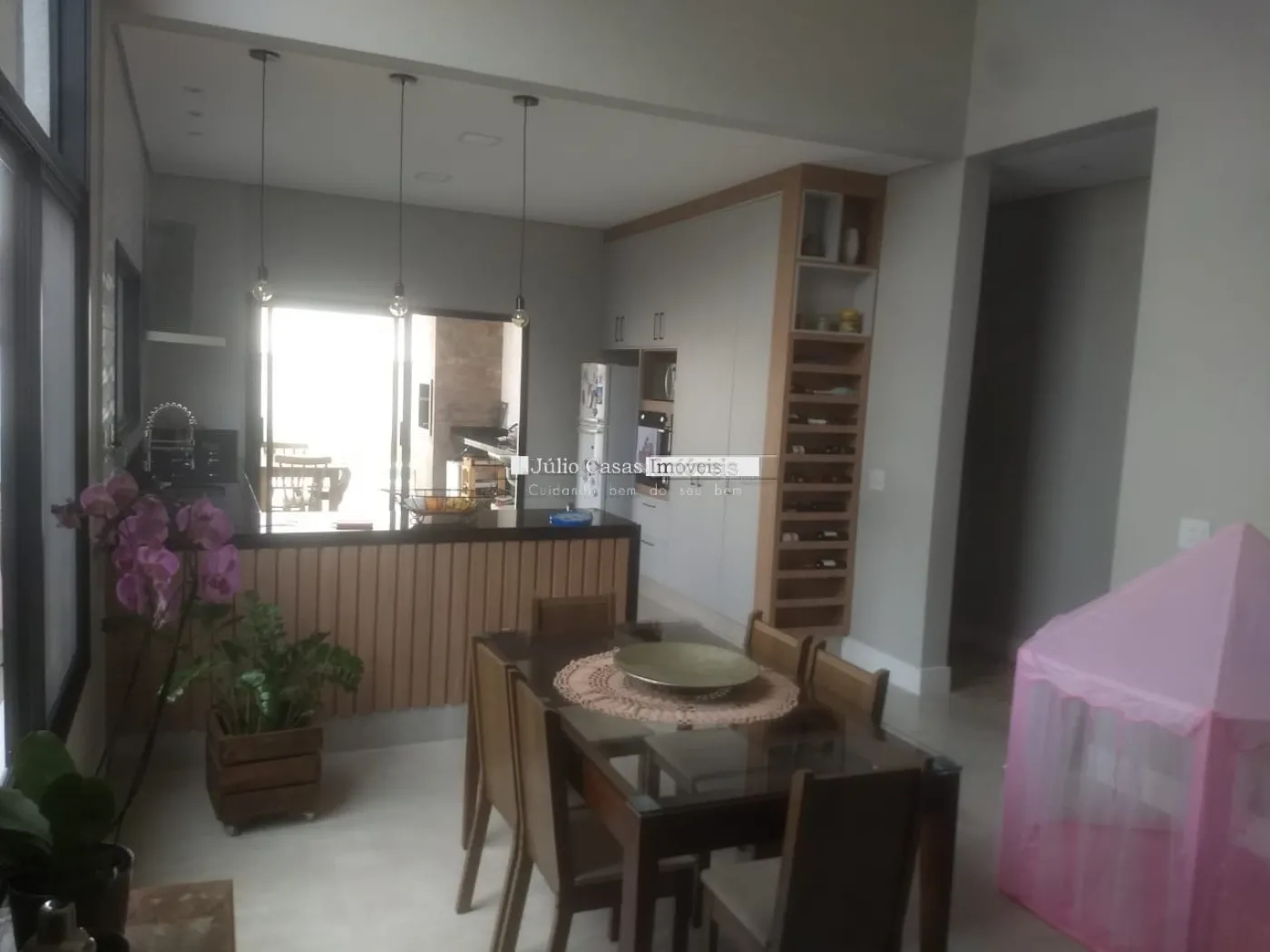 Casa térrea com Sala ampla em piso porcelanato, cozinha integrada com sala de almoço/jantar, cozinha planejada com bancadas em mármore, despensa, área de luz, lavanderia com quintal. 3 dormitórios 1 sendo suíte, 2 dormitórios com armários planejados, piso nos dormitórios em laminado, wc social com box em vidro e gabinete, azulejado até o teto