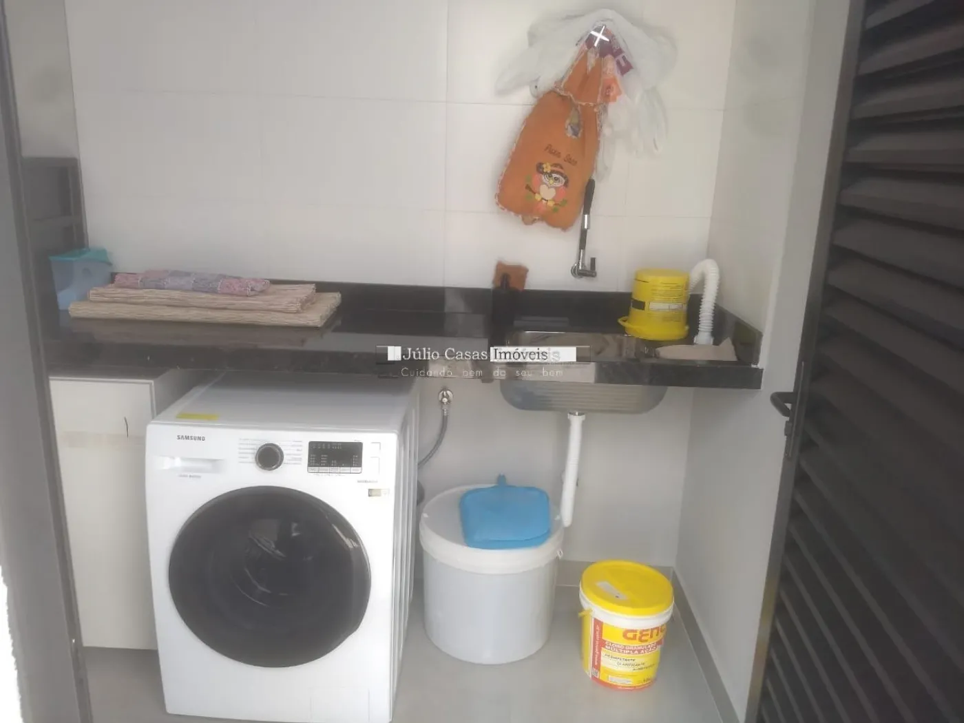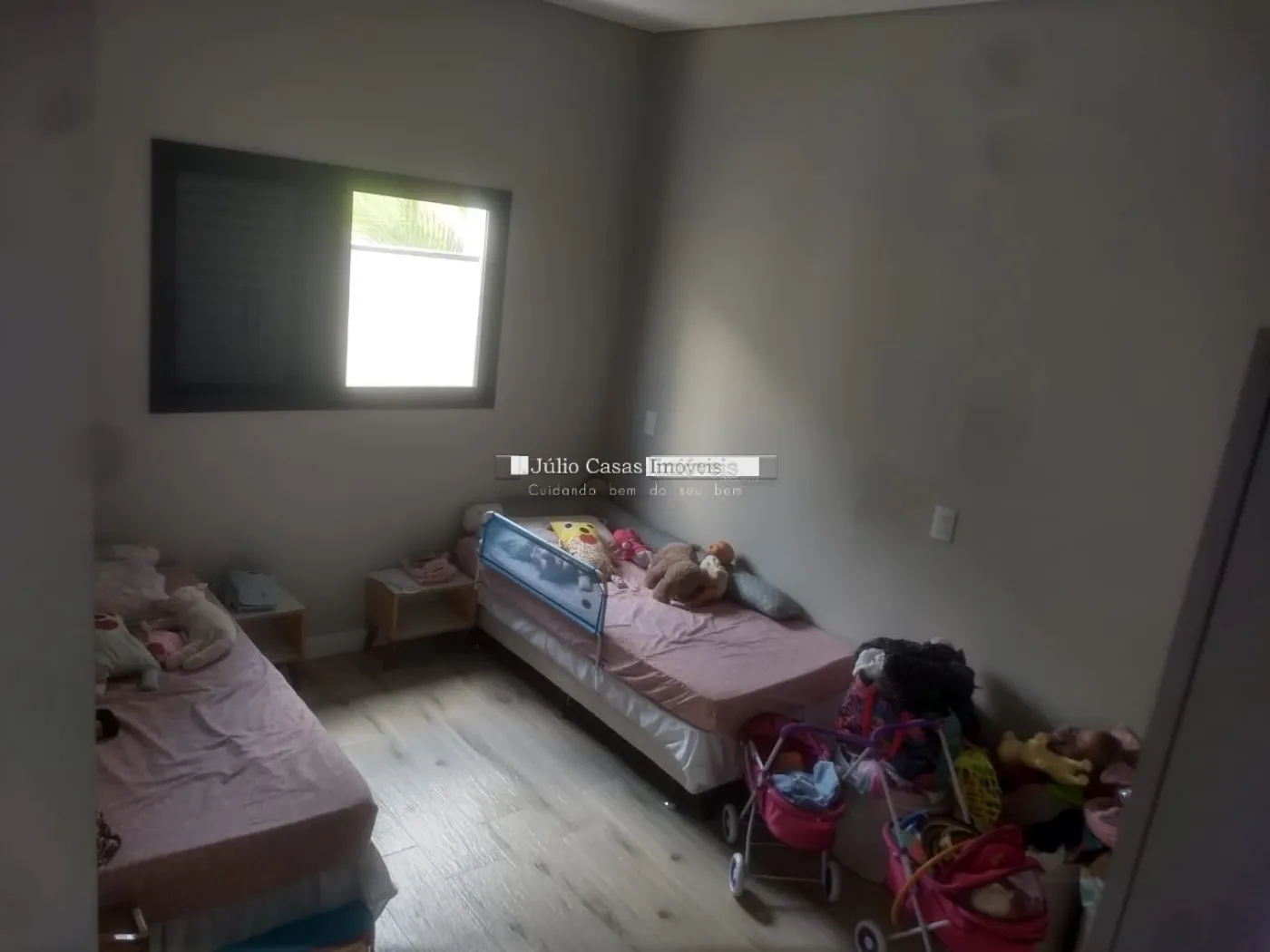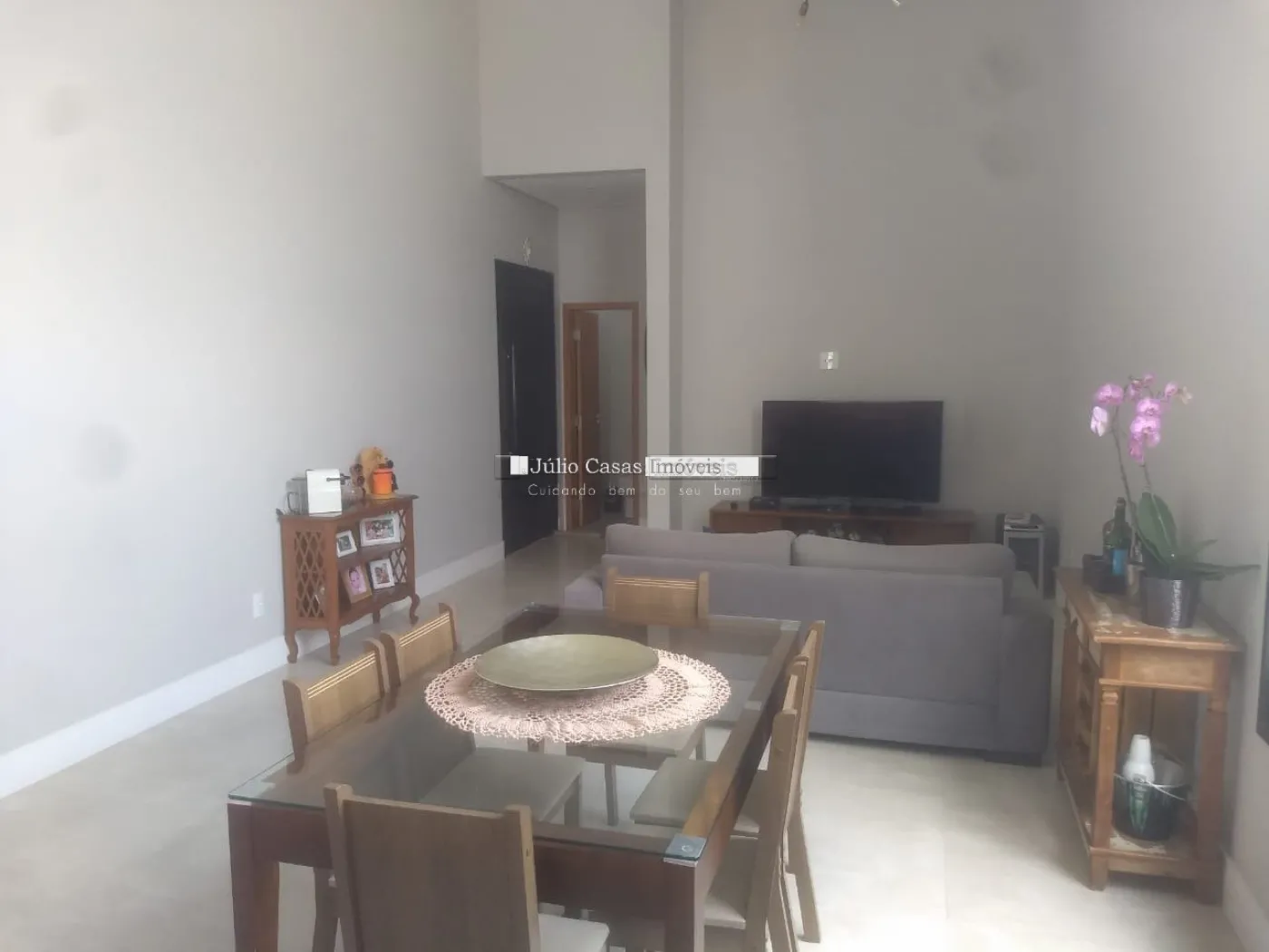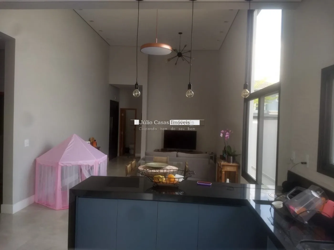Casa térrea com Sala ampla em piso porcelanato, cozinha integrada com sala de almoço/jantar, cozinha planejada com bancadas em mármore, despensa, área de luz, lavanderia com quintal. 3 dormitórios 1 sendo suíte, 2 dormitórios com armários planejados, piso nos dormitórios em laminado, wc social com box em vidro e gabinete, azulejado até o teto