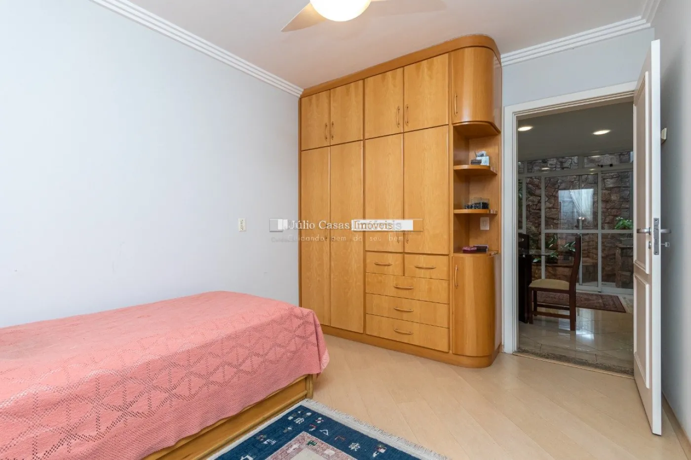 Cozinha com armários planejados despensa e lavanderia. Ampla área gourmet com churrasqueira, forno para pizza, balcão de apoio em `U` em pedra são gabriel, integrado a área com piscina circundado por um exuberante jardim e sauna à vapor. Além de uma sala de repouso podendo ser utilizada como sala de ginástica. E dependência de empregada com banheiro independente. No andar superior são quatro dormitórios sendo três suítes com banheiras de hidro massagem, todos com armários modulados e em três deles com sacadas. A suíte master conta ainda com um magnífico closet em `L` e ar condicionado. A casa conta com sistema de aquecimento solar para a piscina.