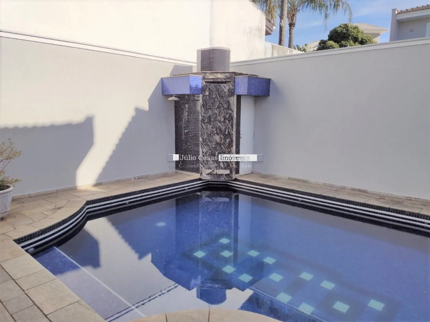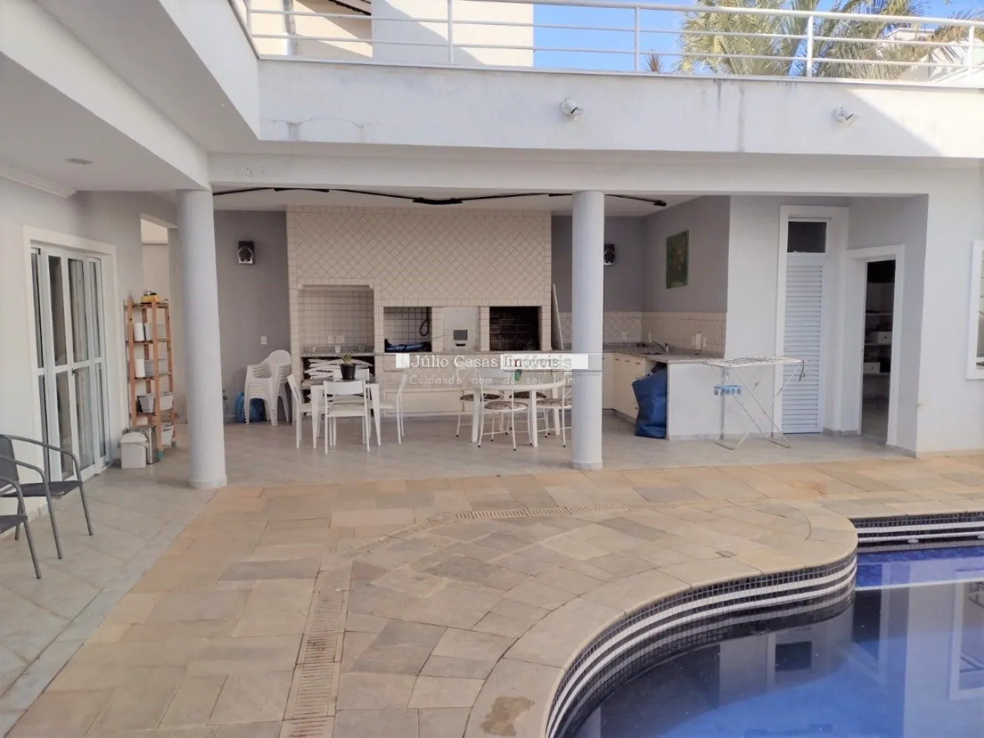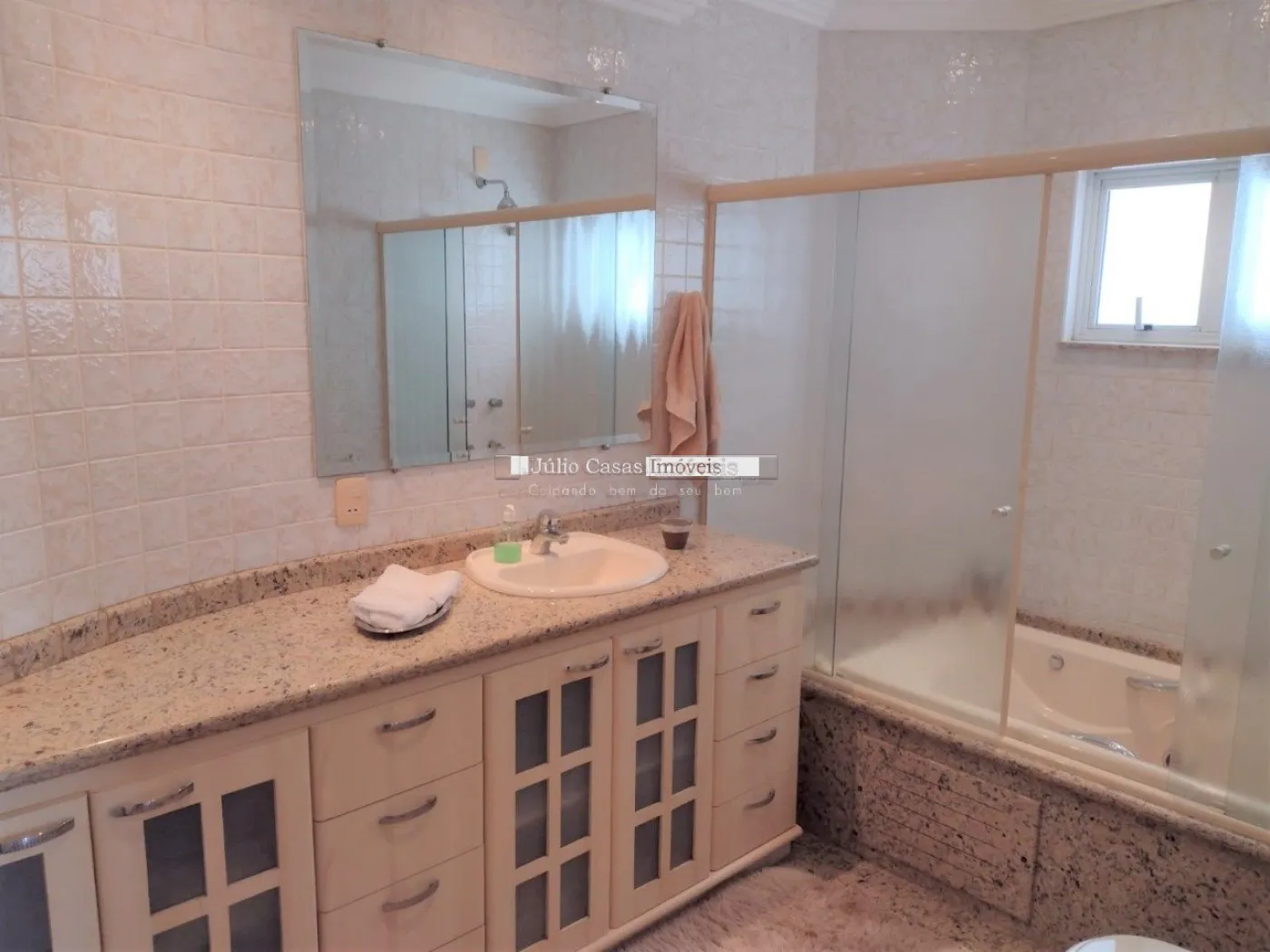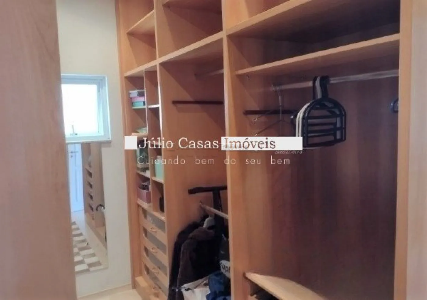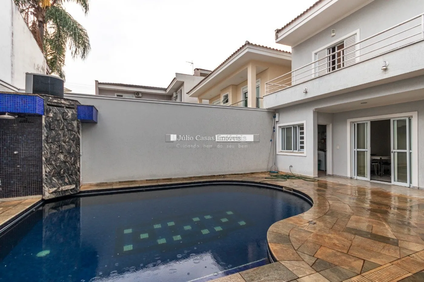 Cozinha com armários planejados despensa e lavanderia. Ampla área gourmet com churrasqueira, forno para pizza, balcão de apoio em `U` em pedra são gabriel, integrado a área com piscina circundado por um exuberante jardim e sauna à vapor. Além de uma sala de repouso podendo ser utilizada como sala de ginástica. E dependência de empregada com banheiro independente. No andar superior são quatro dormitórios sendo três suítes com banheiras de hidro massagem, todos com armários modulados e em três deles com sacadas. A suíte master conta ainda com um magnífico closet em `L` e ar condicionado. A casa conta com sistema de aquecimento solar para a piscina.