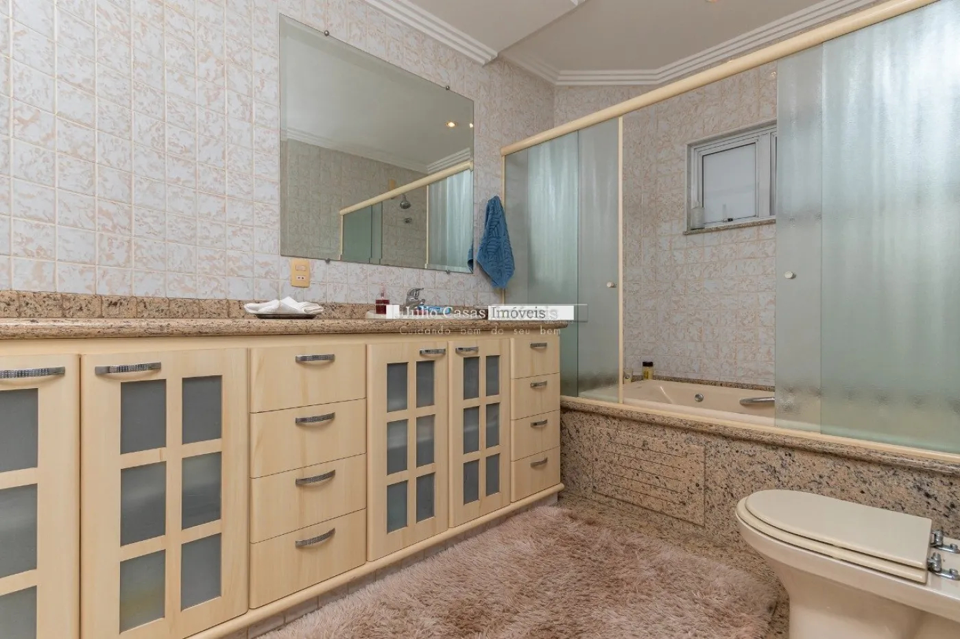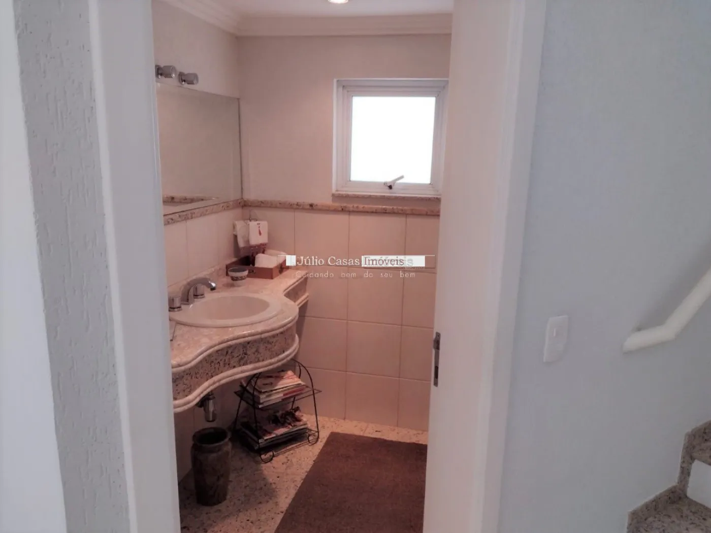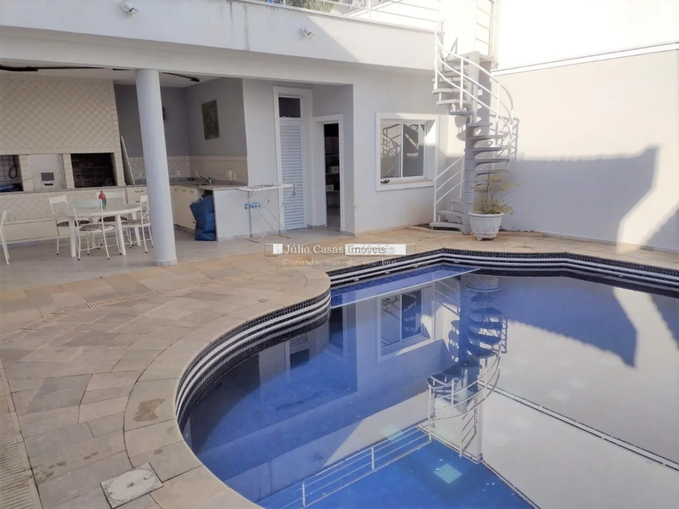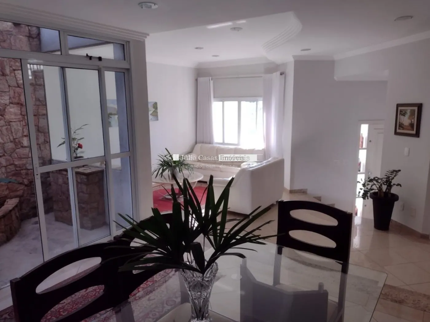 Cozinha com armários planejados despensa e lavanderia. Ampla área gourmet com churrasqueira, forno para pizza, balcão de apoio em `U` em pedra são gabriel, integrado a área com piscina circundado por um exuberante jardim e sauna à vapor. Além de uma sala de repouso podendo ser utilizada como sala de ginástica. E dependência de empregada com banheiro independente. No andar superior são quatro dormitórios sendo três suítes com banheiras de hidro massagem, todos com armários modulados e em três deles com sacadas. A suíte master conta ainda com um magnífico closet em `L` e ar condicionado. A casa conta com sistema de aquecimento solar para a piscina.