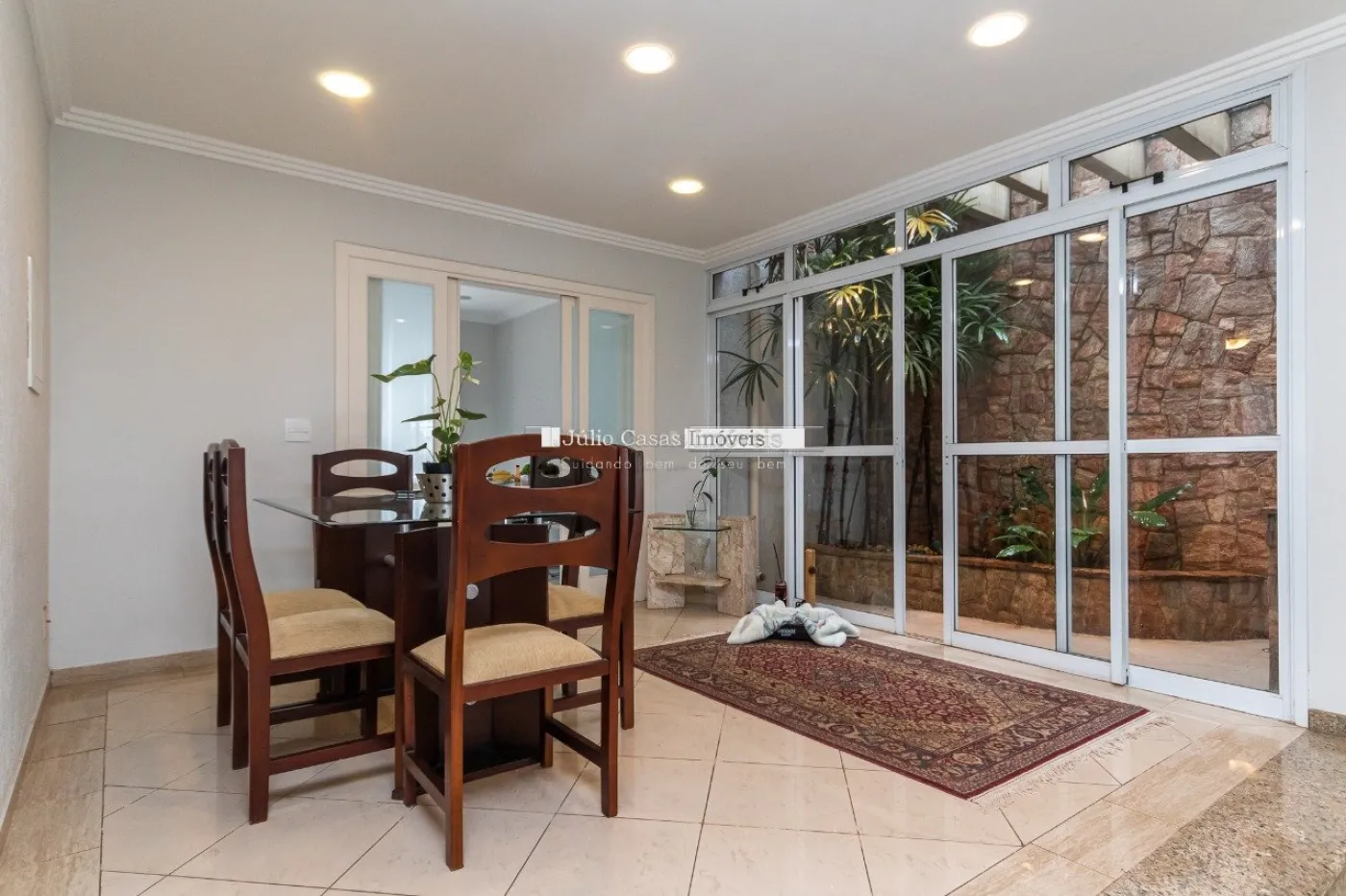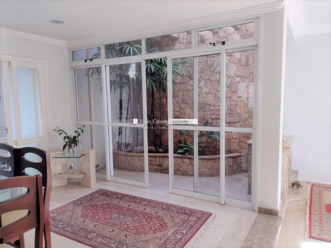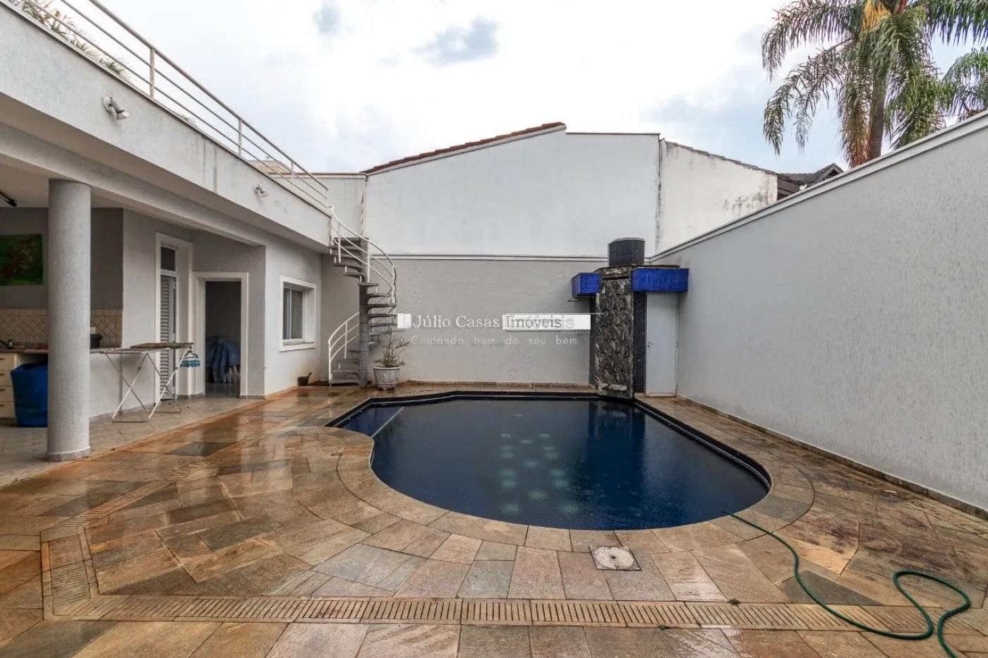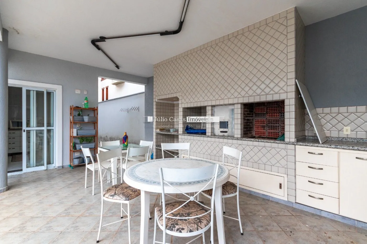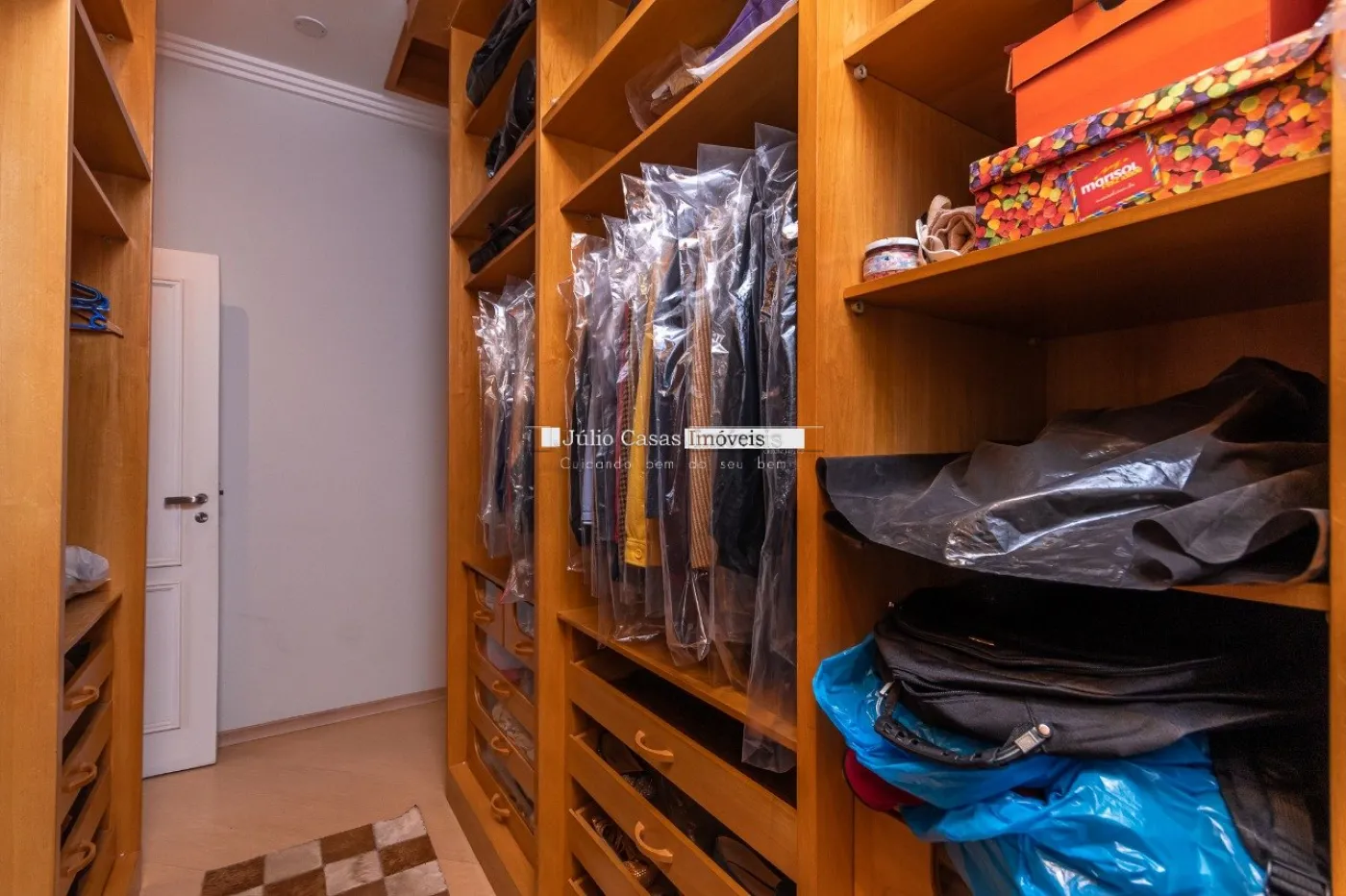 Cozinha com armários planejados despensa e lavanderia. Ampla área gourmet com churrasqueira, forno para pizza, balcão de apoio em `U` em pedra são gabriel, integrado a área com piscina circundado por um exuberante jardim e sauna à vapor. Além de uma sala de repouso podendo ser utilizada como sala de ginástica. E dependência de empregada com banheiro independente. No andar superior são quatro dormitórios sendo três suítes com banheiras de hidro massagem, todos com armários modulados e em três deles com sacadas. A suíte master conta ainda com um magnífico closet em `L` e ar condicionado. A casa conta com sistema de aquecimento solar para a piscina.