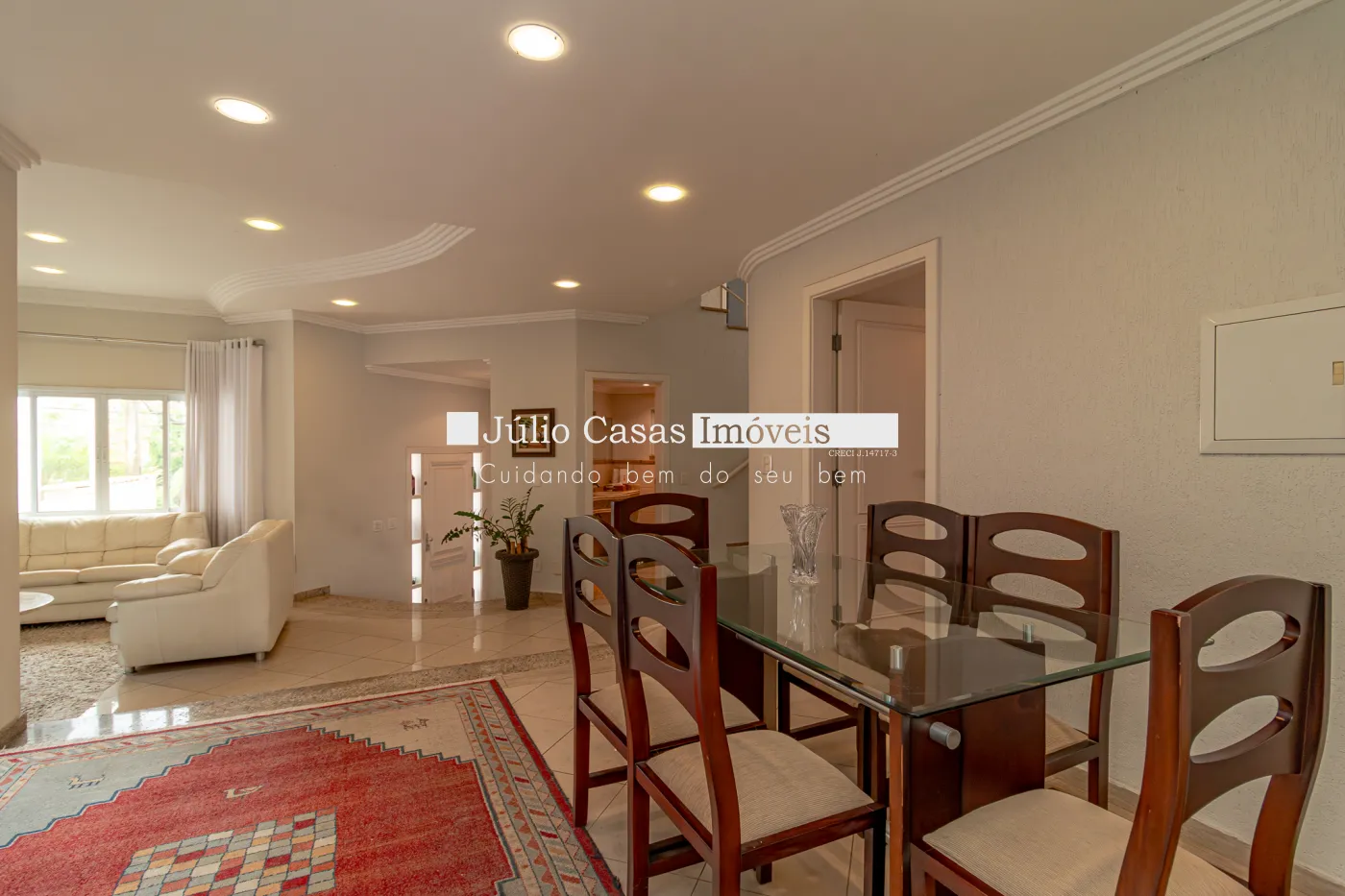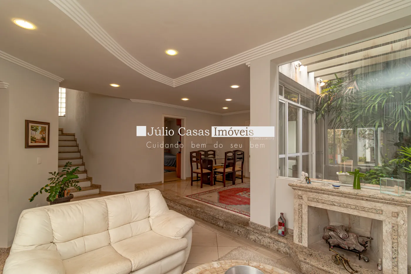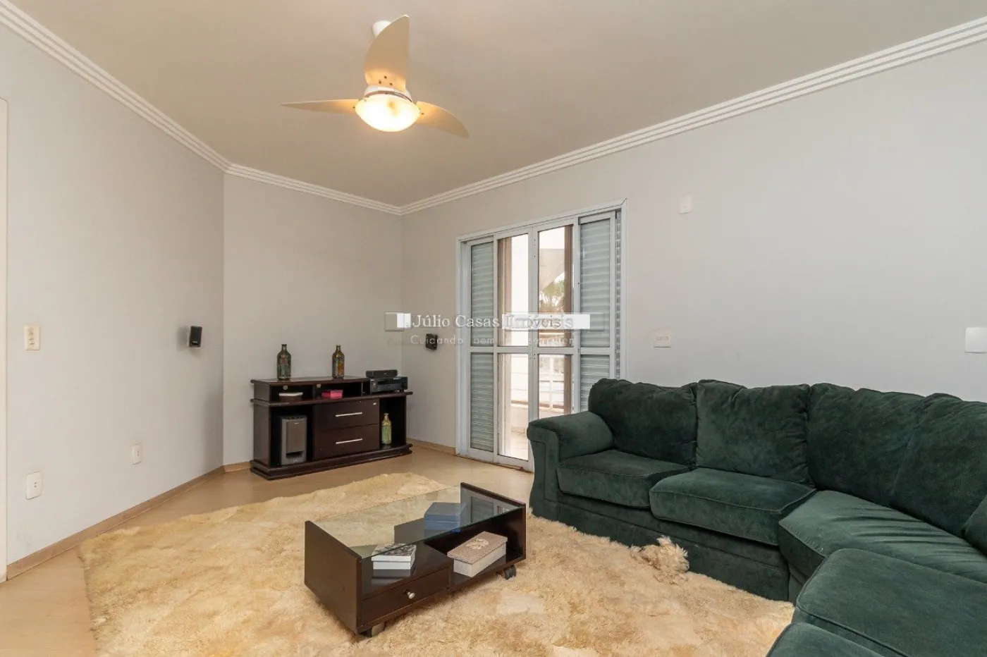 No primeiro pavimento, sala de estar com piso de madeira, parede revestida em papel de parede, teto em gesso e luminárias em LED embutidas, janelas em vidro temperado, porta de entrada em madeira com vidros jateados e um prático lavabo. Sala de TV com piso em porcelanato retificado e janelas em vidro temperado, ar condicionado e um banheiro, sala de jantar com piso em madeira e porta balcão com acesso ao quintal.