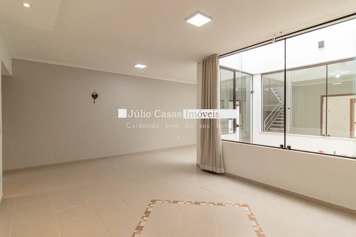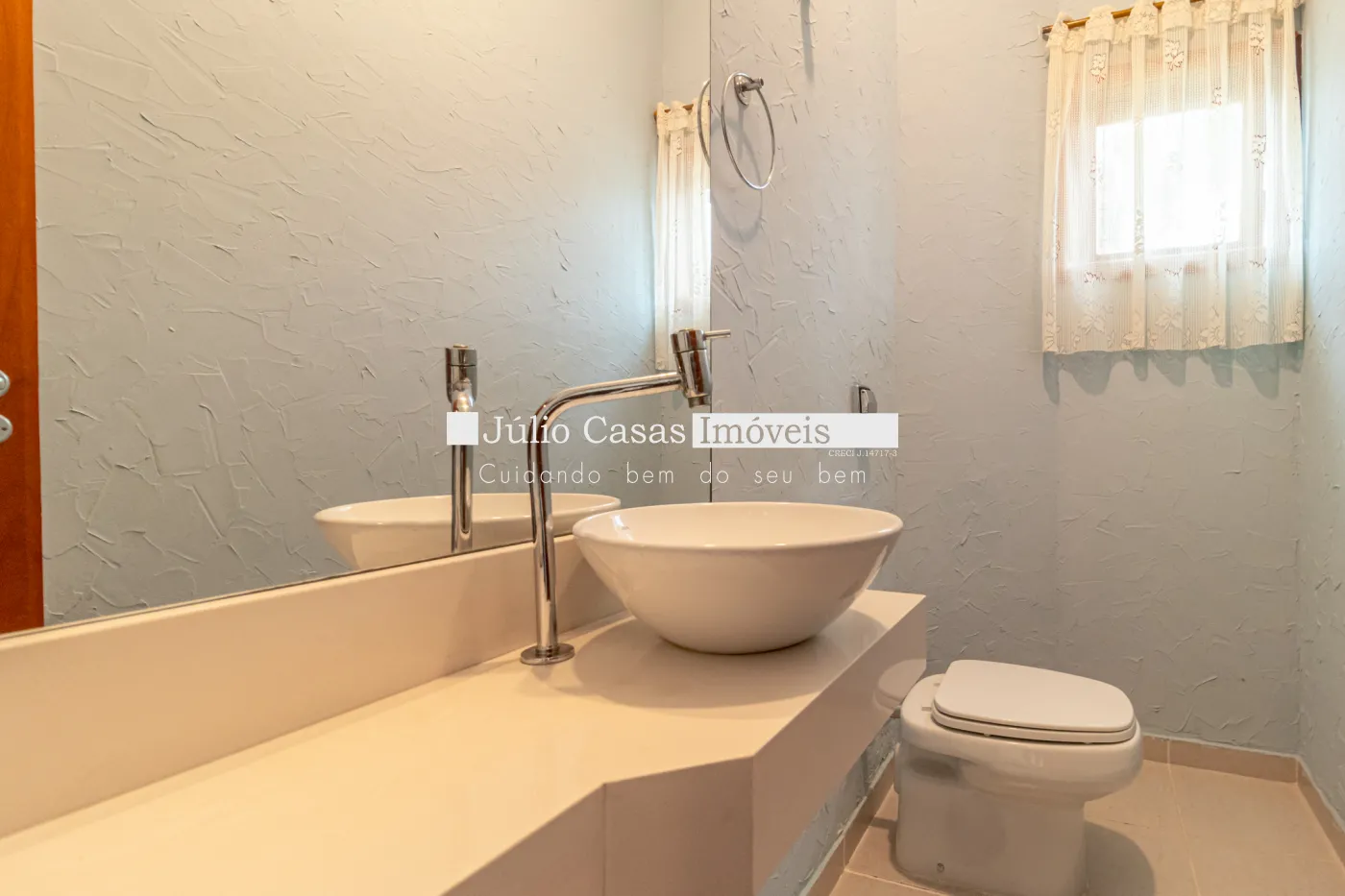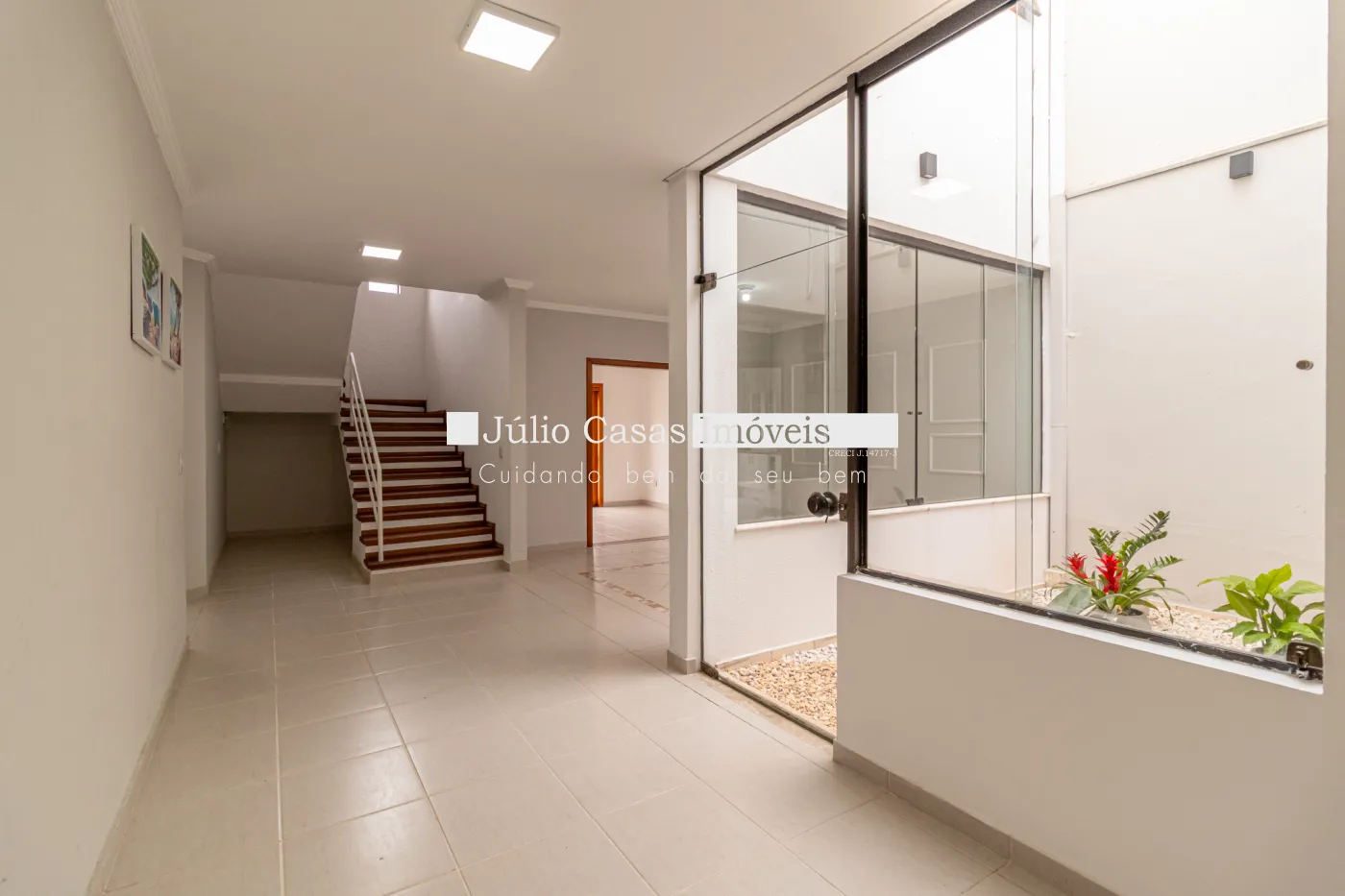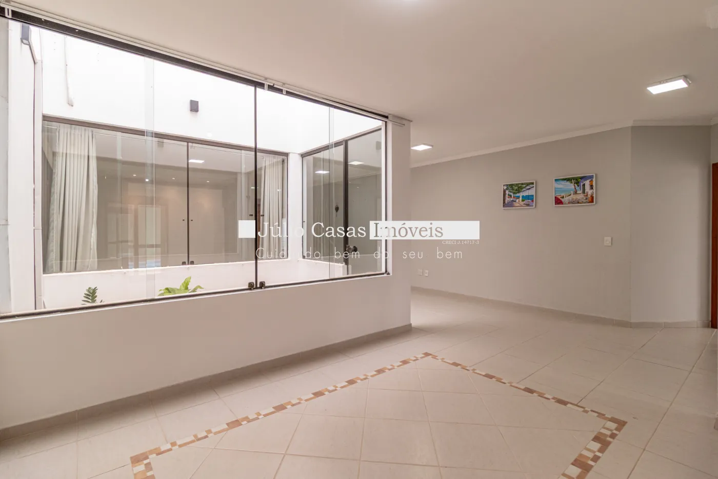 No primeiro pavimento, sala de estar com piso em porcelanato, teto em gesso e luminárias embutidas, janelas em vidro temperado, uma aconchegante área de luz e lavabo. Sala de TV e escritório. Sala de jantar, despensa e cozinha planejada com modulados, que tem acesso à área gourmet completa com churrasqueira e piscina. Garagem coberta para dois veículos.