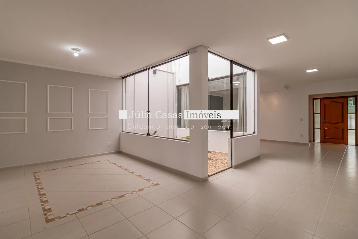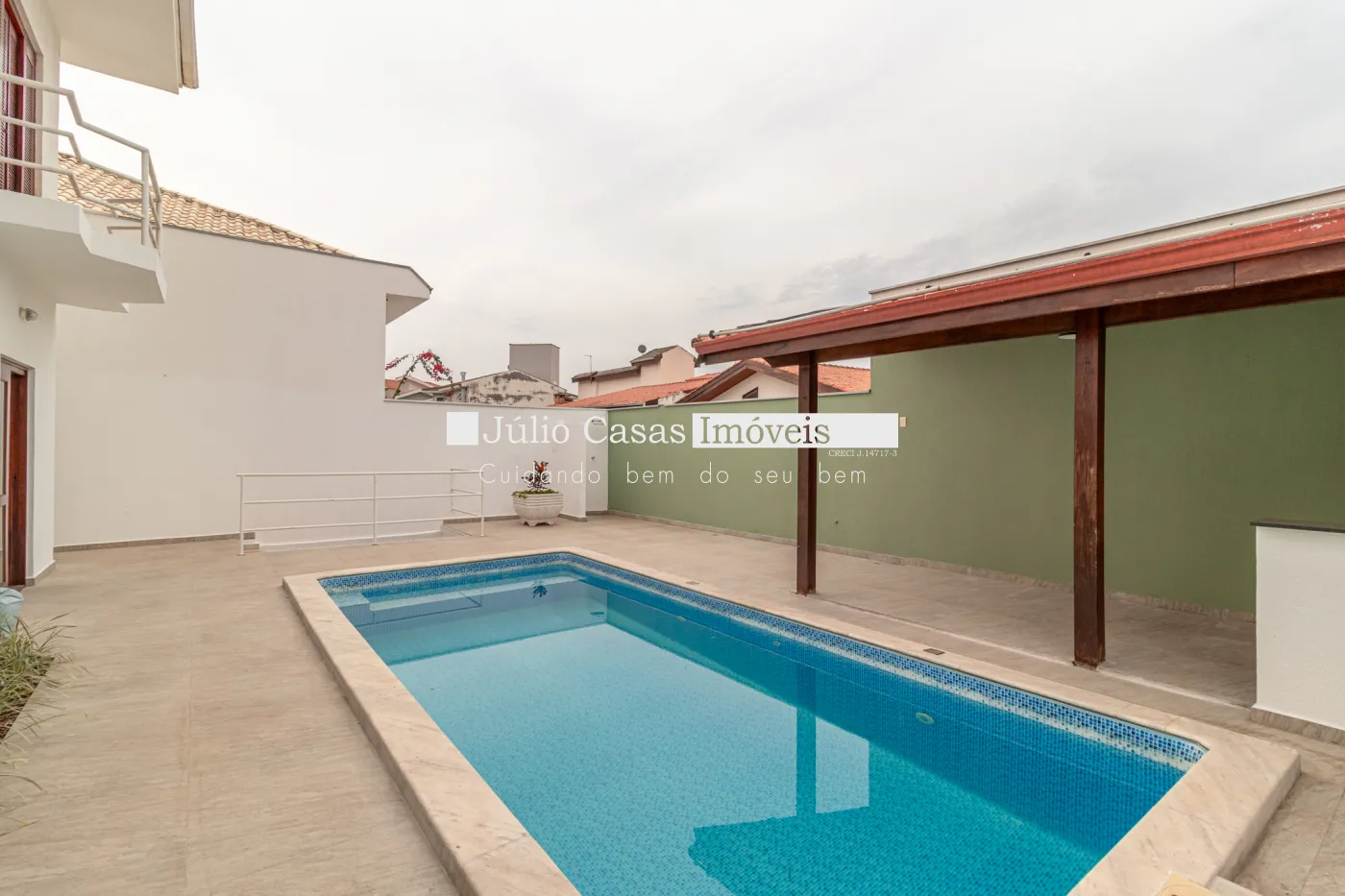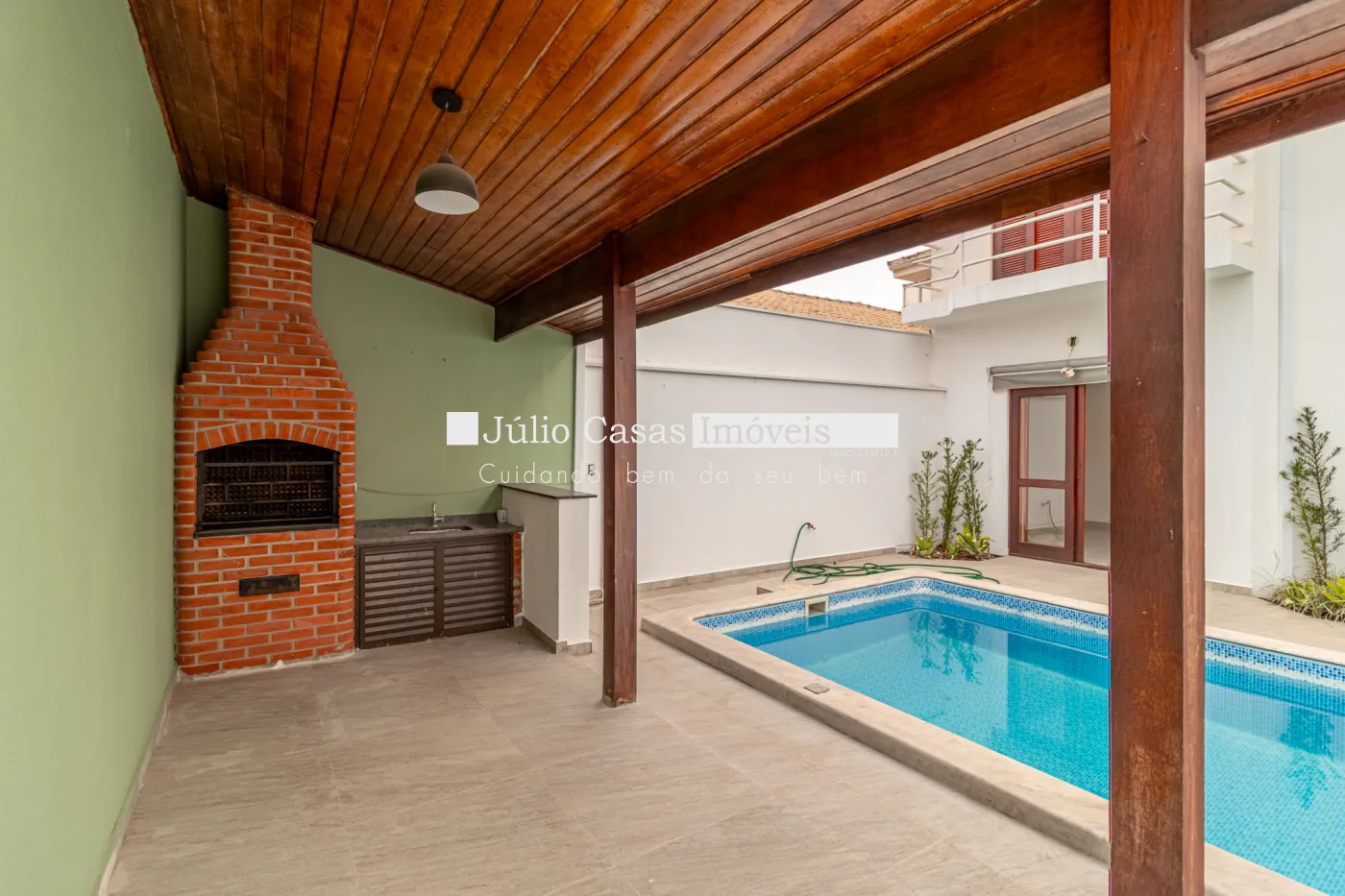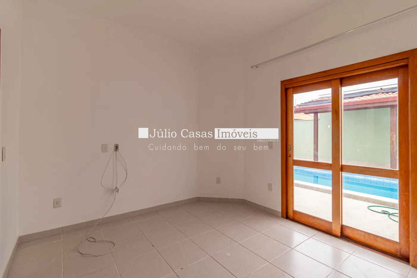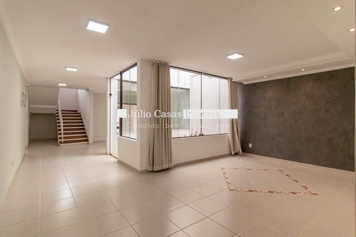 No primeiro pavimento, sala de estar com piso em porcelanato, teto em gesso e luminárias embutidas, janelas em vidro temperado, uma aconchegante área de luz e lavabo. Sala de TV e escritório. Sala de jantar, despensa e cozinha planejada com modulados, que tem acesso à área gourmet completa com churrasqueira e piscina. Garagem coberta para dois veículos.