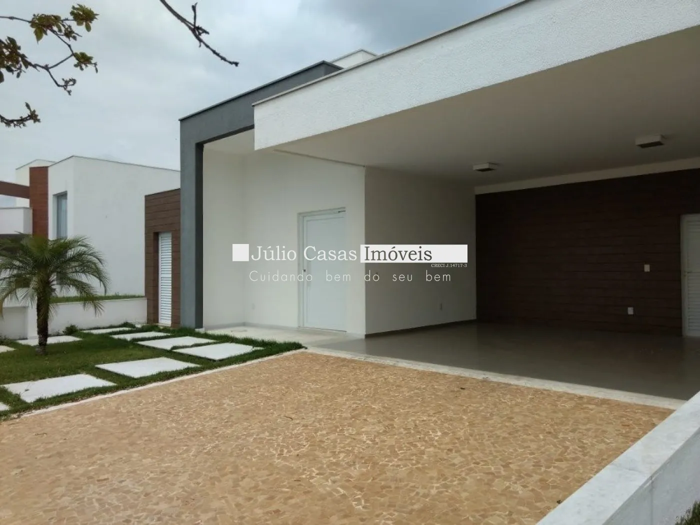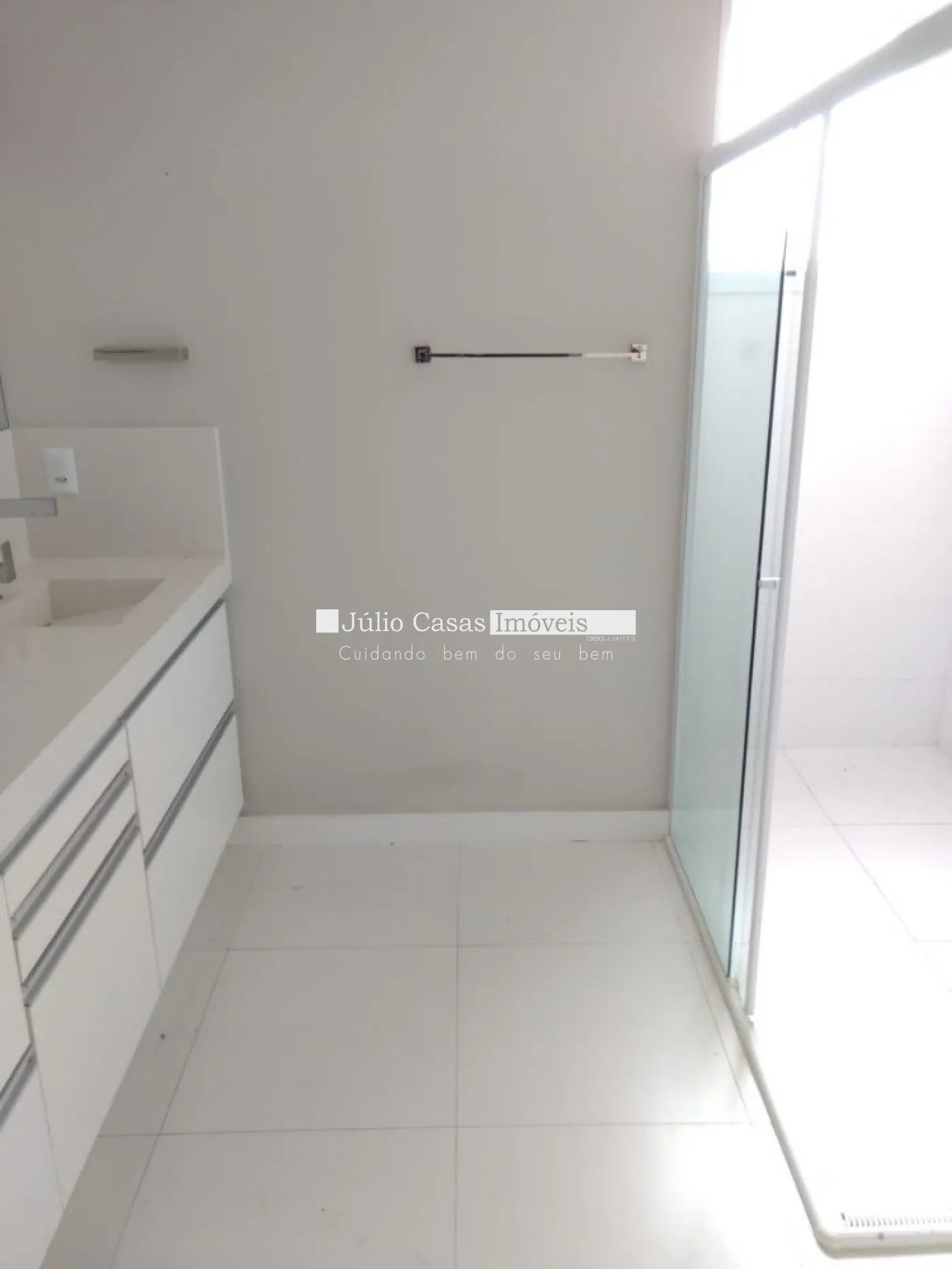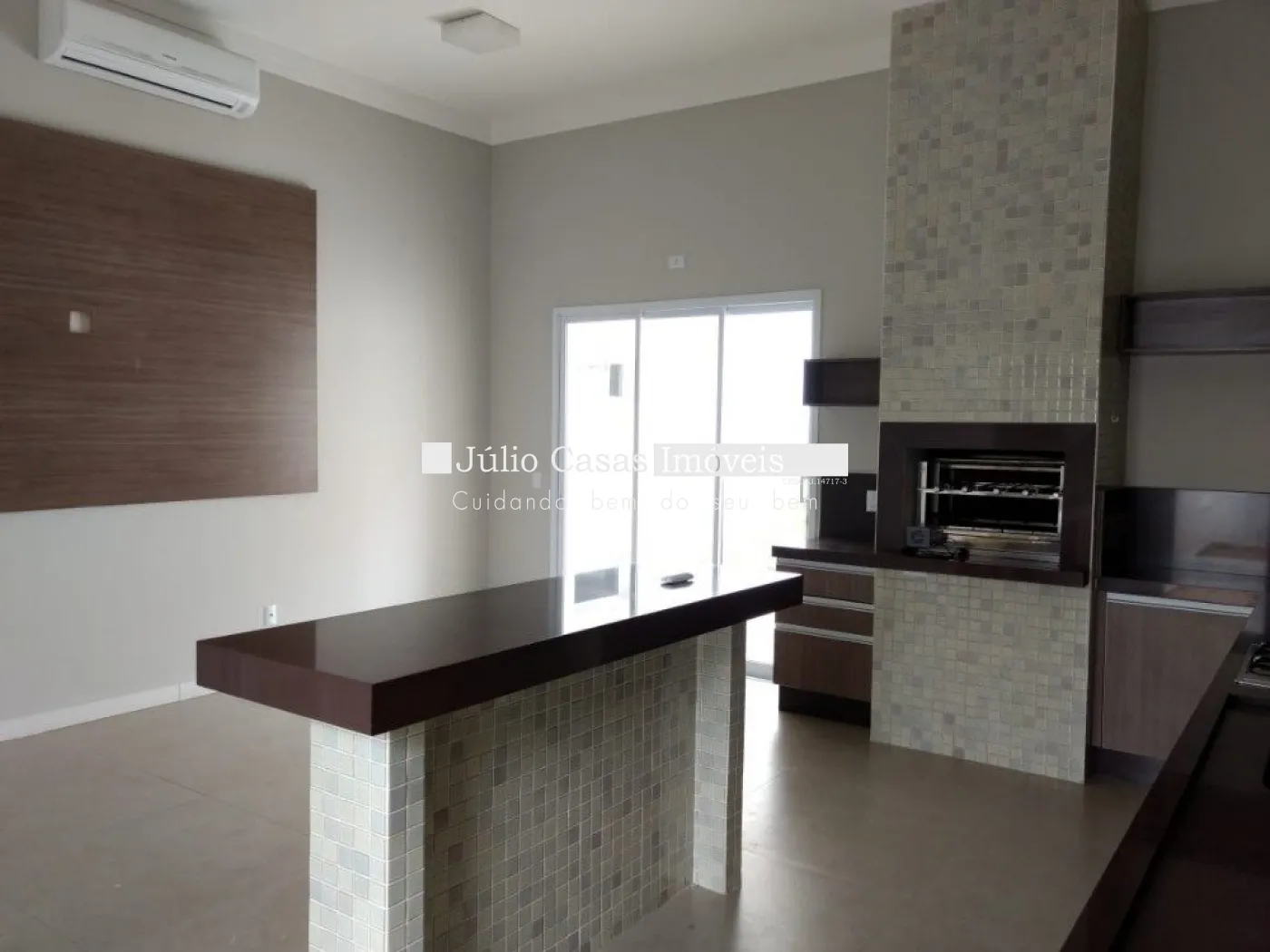 Casa térrea com três suítes, todas com ar condicionado, uma com armário e outra com closet , banheiro com pia e chuveiro duplos, sala ampla com jardim de inverno, cozinha modulada com balcão em granito e dupla pia, cooktop, despensa, área de serviço com armários, área secagem, espaço gourmet fechado com armários, mesa e painel, banheiro com gabinete, espelho , box e chuveiro, piscina, quintal e quatro vagas. Acabamento de primeira qualidade