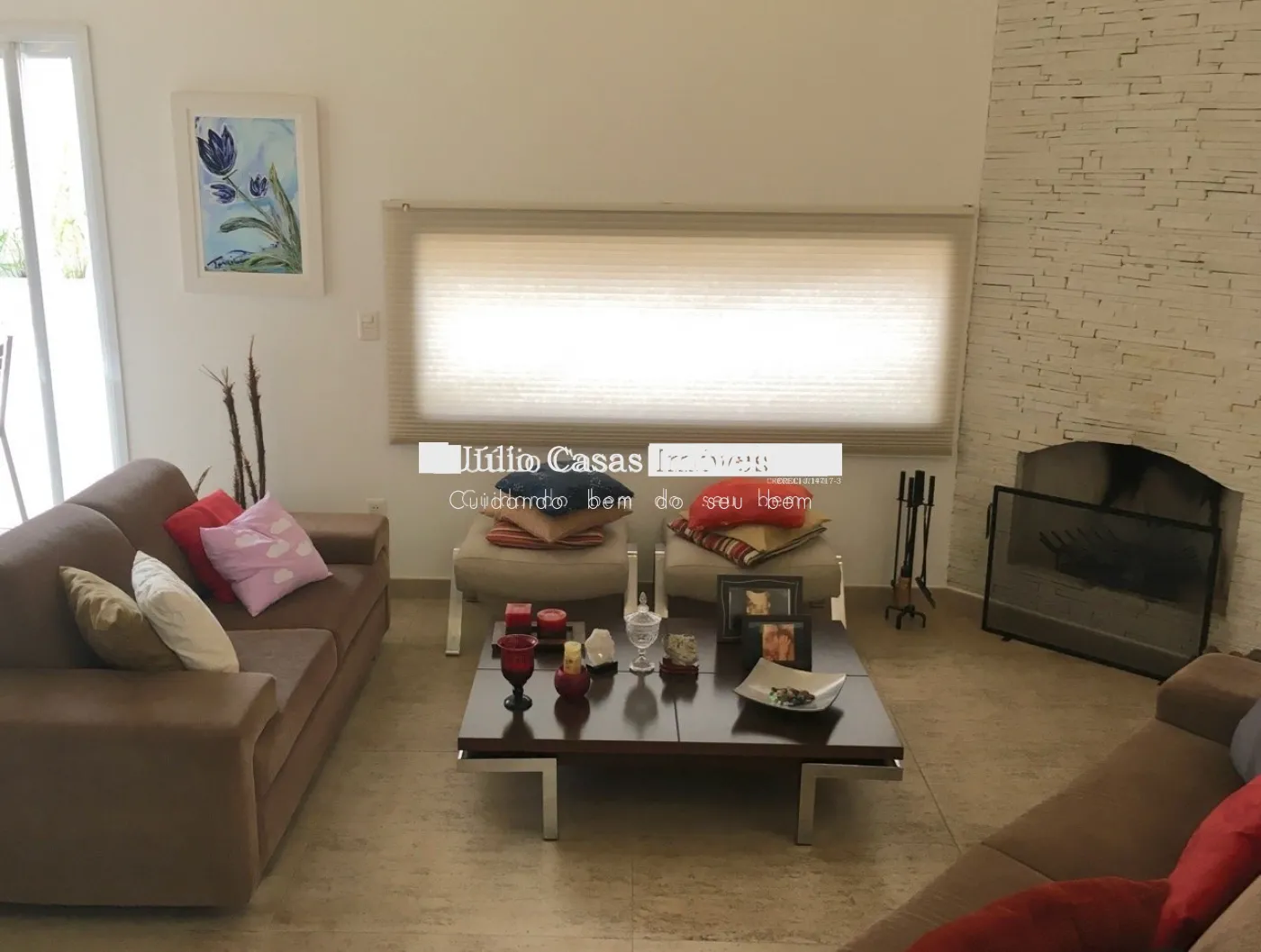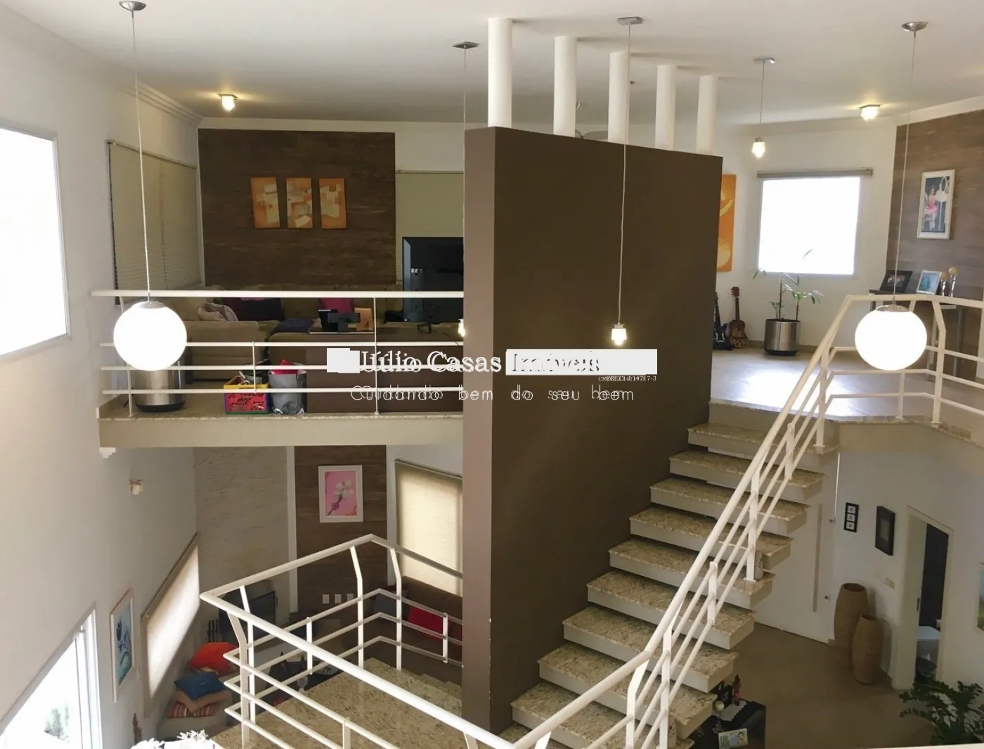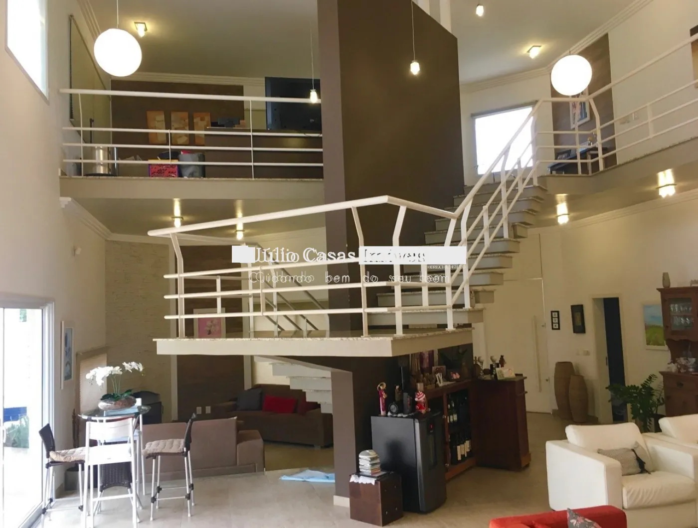 Piso intermediário com hall de entrada, ampla sala para 3 ambientes, sala de jantar, sala de estar com lareira, escritório e lavabo.