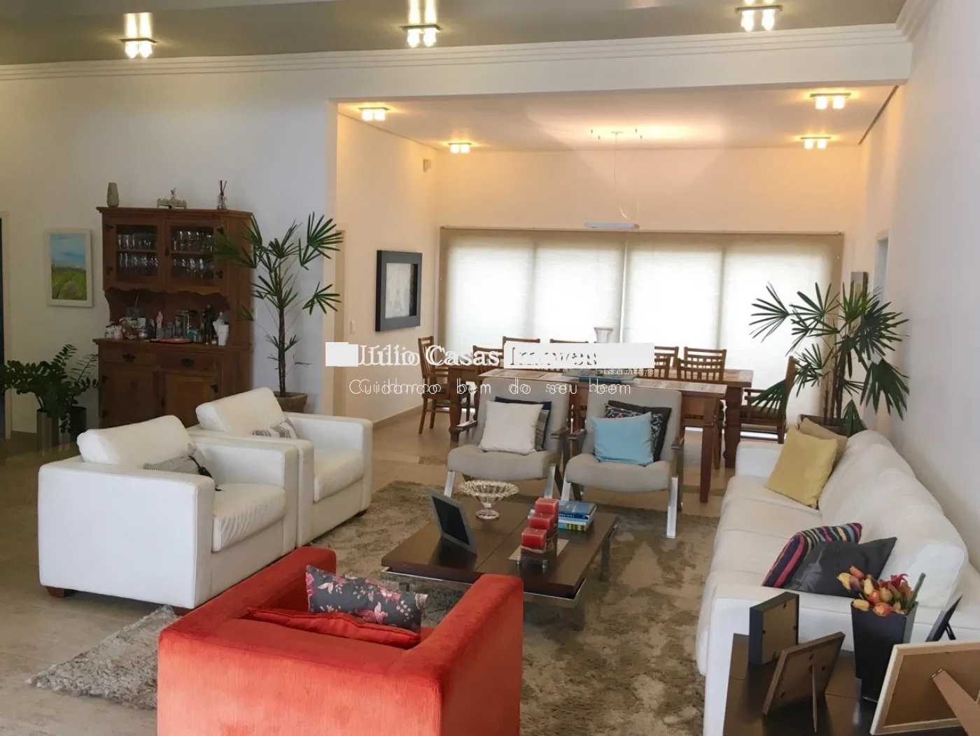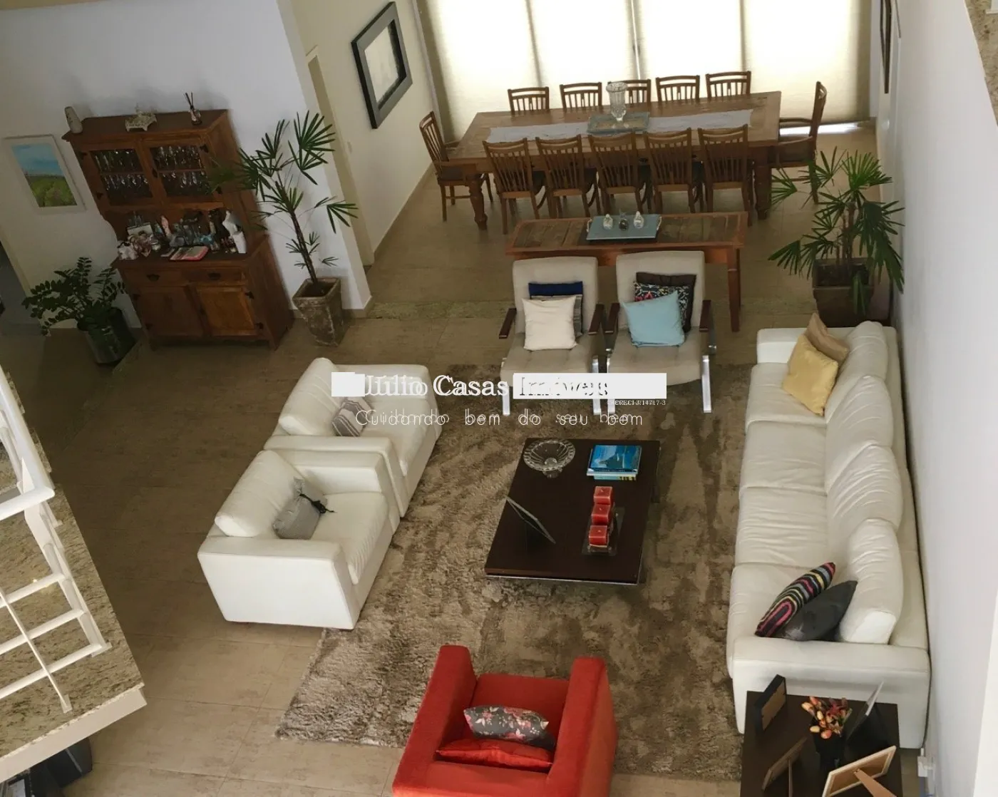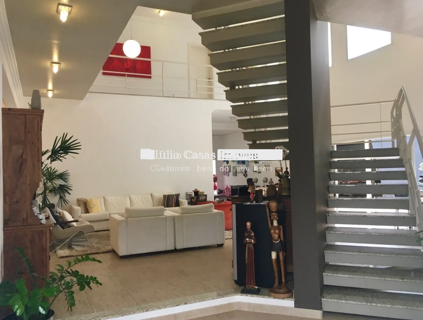 Piso intermediário com hall de entrada, ampla sala para 3 ambientes, sala de jantar, sala de estar com lareira, escritório e lavabo.