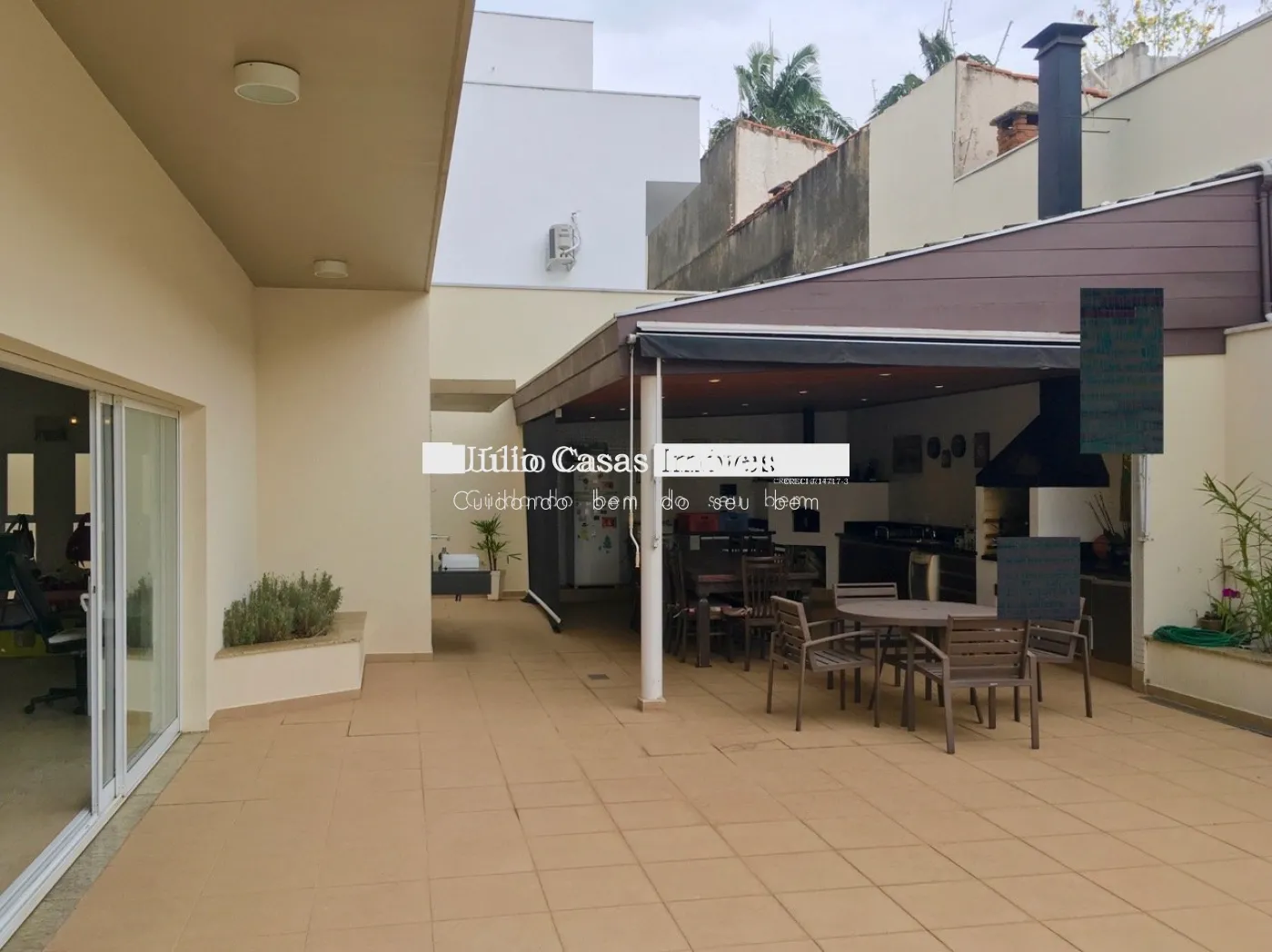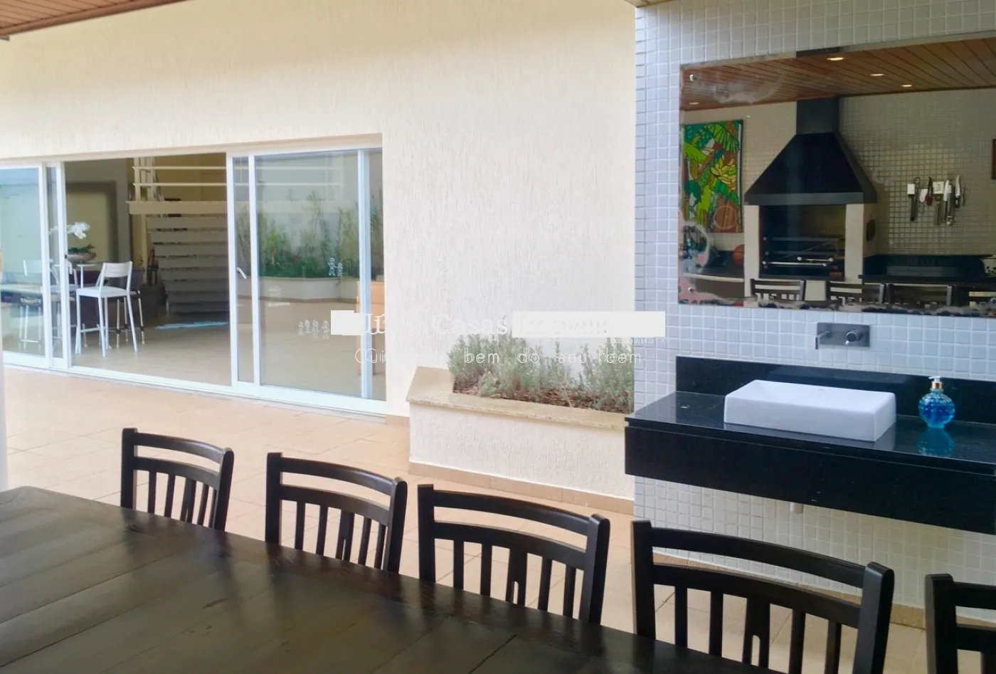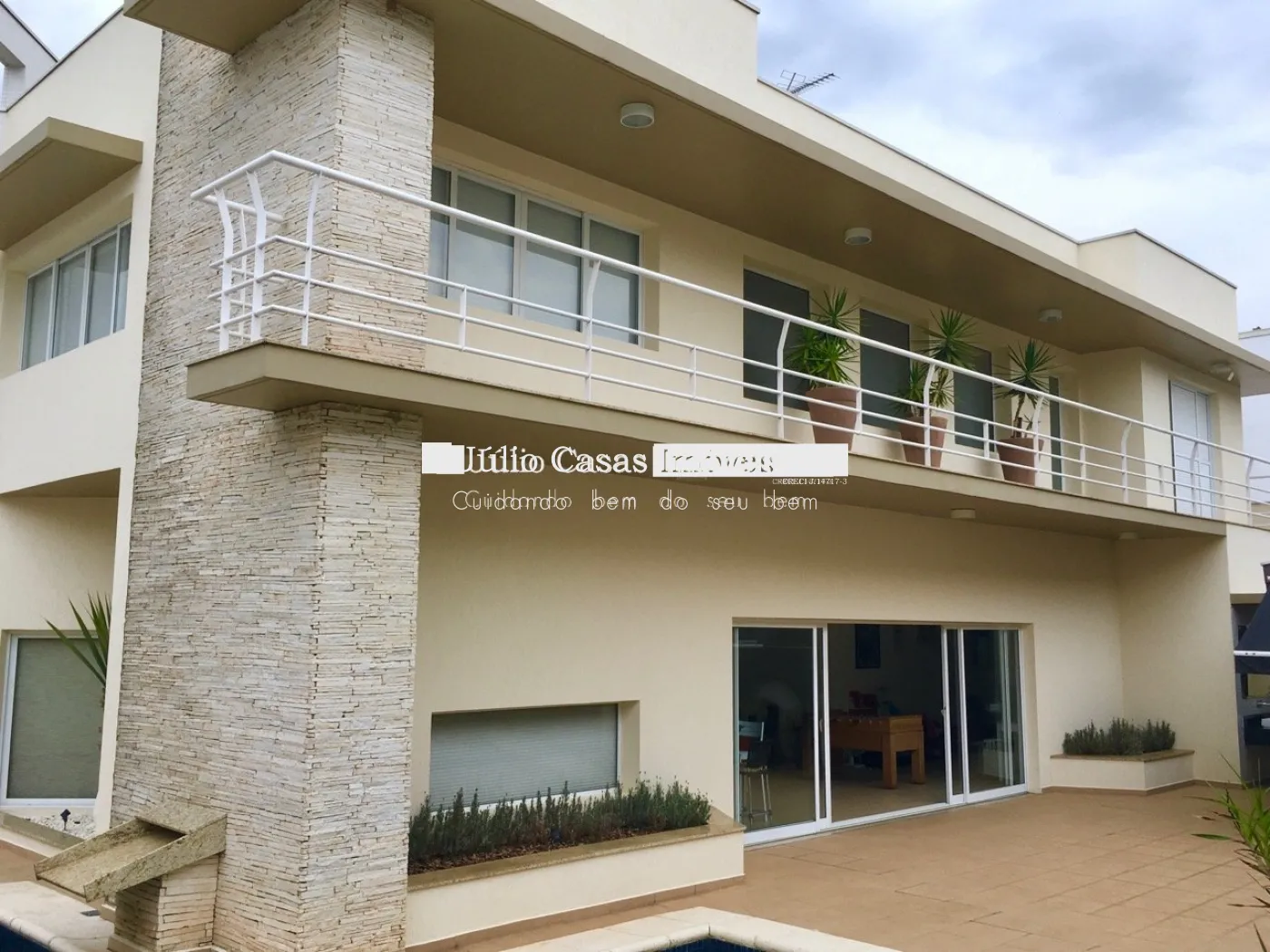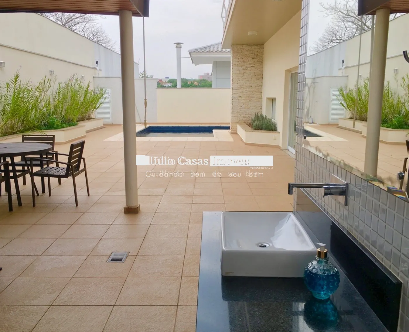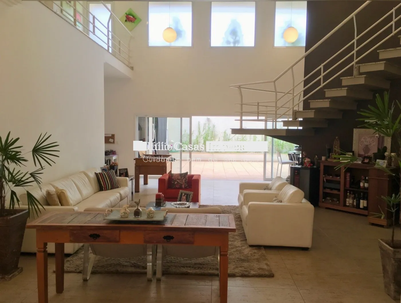 No piso inferior, garagem coberta para três carros e depósito.